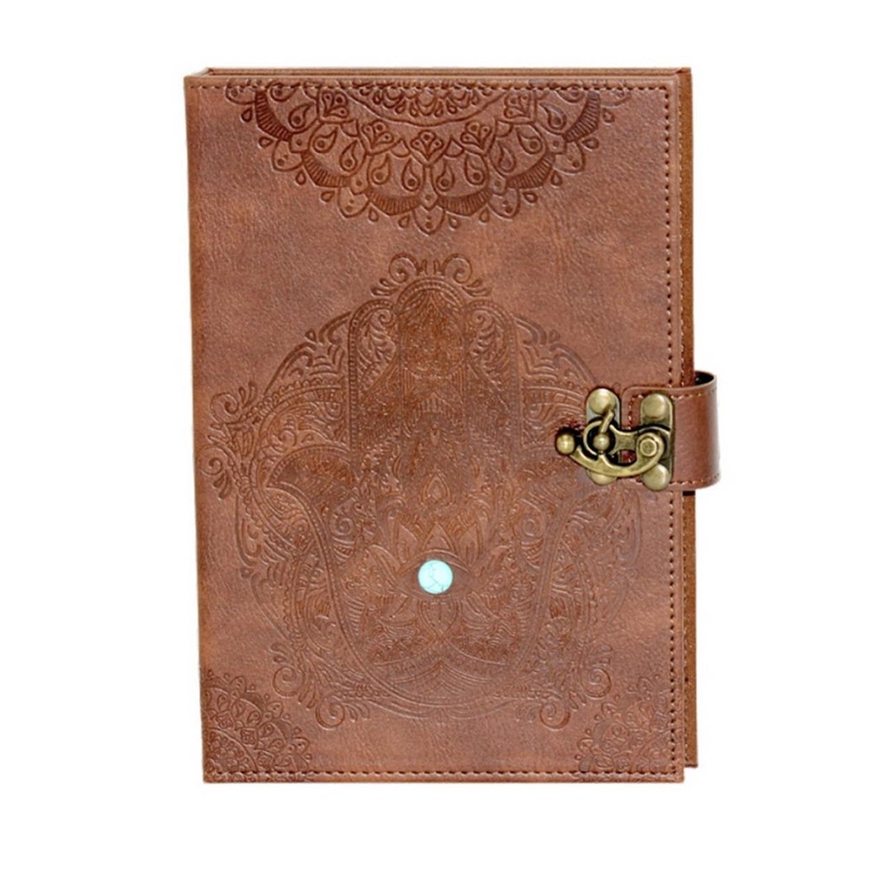 Hamsa Protector of the Evil Eye Leather Bound Journal | Turquoise Bead | Brass C Hamsa Protector of the Evil Eye Leather Bound Journal | Turquoise Bead | Brass C Hamsa Protector of the Evil Eye Leather Bound Journal. Turquoise Bead. Brass Closure. New This rich decorative leather journal has an eye catching beauty. Hand toned leather with embossed Evil Eye design and a turquoise gemstone. The stone embedded in the front of these journal can offer an abundance of benefits to fuel your journey where you go. This journal charges you while you document your thought and important notes. A real treasure for you or the one you love. Suitable for both man or woman, this daily travelers notebook is perfect for an avid writer. Use as a dream log, document your daily thought or as an exercise journal. Ideal to give as a birthday, Christmas, Valentines, graduation or wedding anniversary present. Comes with a turquoise gemstone with potential benefits - enhances communication, self-expression, emotional balance and inner peace. The Hamsa, also known as the Hand of Fatima or Hand of Miriam, is a palm-shaped amulet popular in various cultures. It's believed to offer protection against the evil eye and bring blessings, luck, and good fortune. The evil eye is a belief, found in many cultures and religions, that certain individuals possess the ability to harm others with a malevolent gaze. Some of the key concepts and ideas associated with the evil eye include: - The concept of the evil eye is often associated with jealousy, envy, or anger, and is believed to cause harm or misfortune to the person being looked upon - The belief that certain individuals possess the ability to harm others with a malevolent gaze - The idea that the evil eye can cause physical, emotional, and spiritual harm, including illness, bad luck, and misfortune - The use of protective talismans, such as amulets and charms, to ward off the evil eye - The belief that the evil eye can be inadvertently caused by jealousy, envy, or anger towards others - The use of prayers and rituals to protect oneself from the effects of the evil eye - The belief that the evil eye is a powerful force that must be taken seriously and respected Journal Size: 8" x 5.5" About 1lb New Listing and template services provided by inkFrog