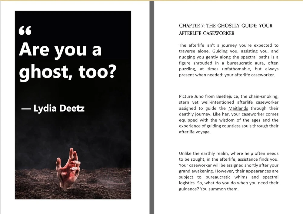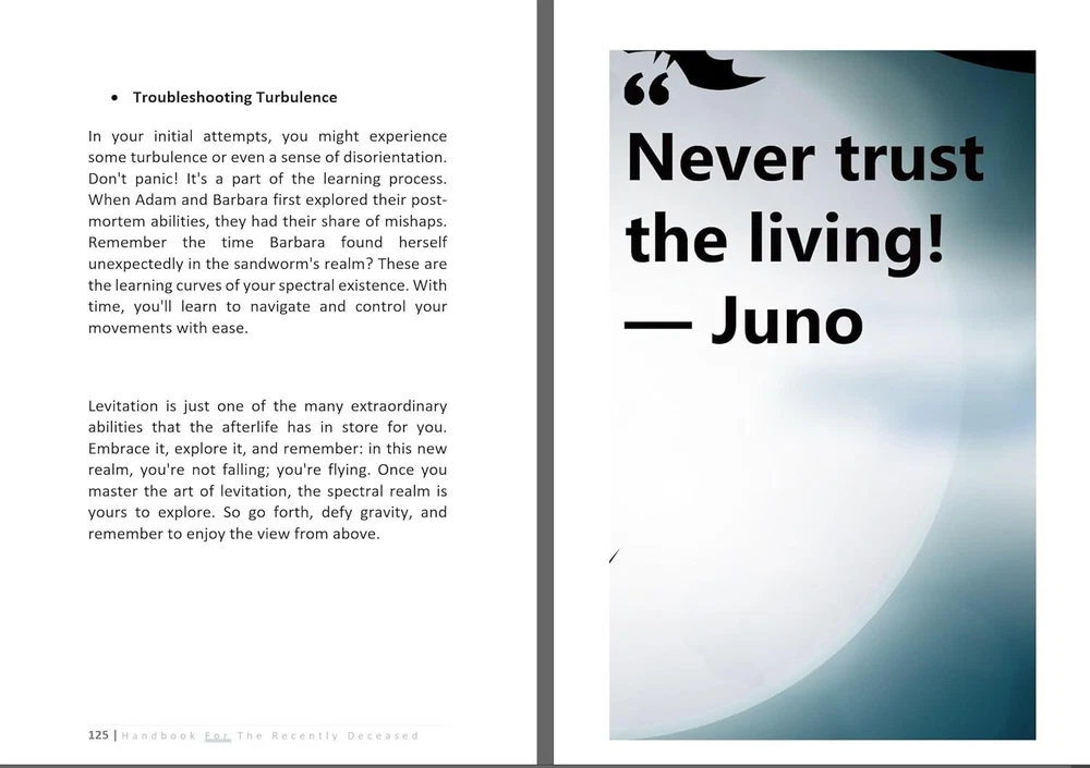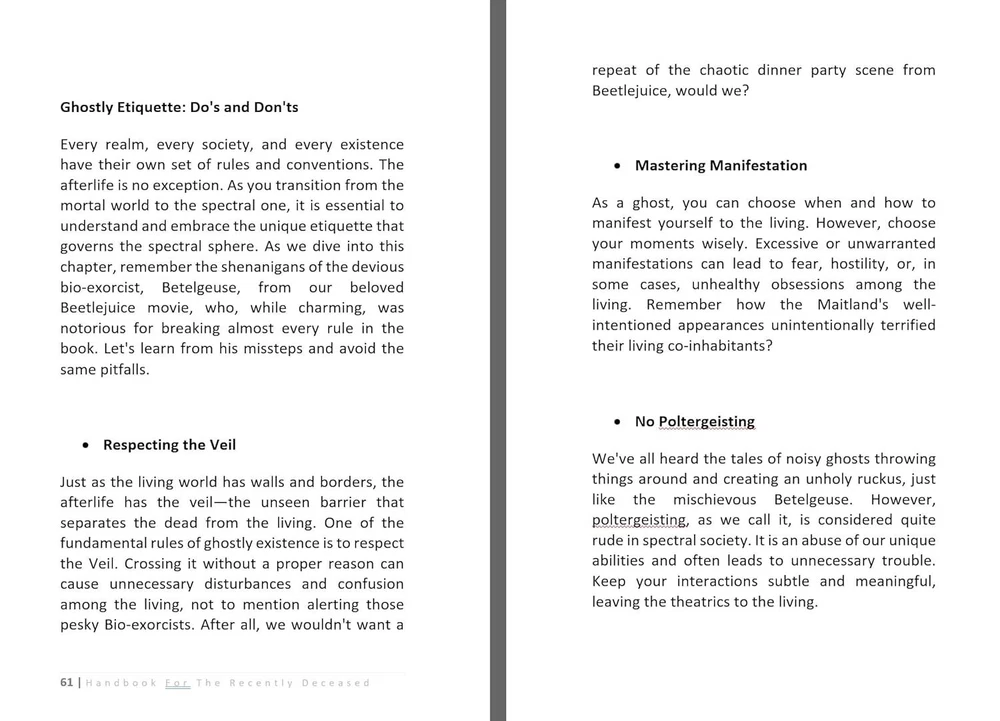 Menu Other Items Feedbacks About Us Contact Us Add To Favorites Handbook for the Recently Deceased: The Afterlife Halloween Gifts Paperback NEW < div > < div > < div > < p >< span > The Ultimate Halloween Gifts : Handbook for the Recently Deceased < p >< span > BEETLEJUICE JOURNAL & amp ; HANDBOOK < p >< span > Are you a fervent Beetlejuice fan ? < p >< span > Have you always wondered about the mysterious " Handbook for the Recently Deceased " that captivated you throughout the film ? < p >< span > Good news ! The long - awaited treasure , inspired by the iconic movie prop , is finally here - and it ' s no empty mock - up , but the real deal ! < p >< span > Prepare to delve deep into the supernatural as you explore pages filled with instructions on levitation , haunting , and so much more . This handbook is a veritable encyclopedia of the ethereal , all housed in a beautifully designed cover that faithfully recreates the look of the movie ' s unforgettable prop . < p >< span > Perhaps you were skeptical , expecting a novelty blank journal . Banish those thoughts ! This handbook is crammed full with useful ( or at least entertaining ) information . All the references you loved from the movie , plus even more secrets of the afterlife , are waiting for you in this truly unique tome . < p >< span > The handbook is designed with readability in mind , boasting a large text font that ' s easy on the eyes - a feature anyone can appreciate . And for those die - hard Beetlejuice fans among you , you ' re sure to resonate with one fellow fan who declared , " As someone who grew up watching Beetlejuice on repeat , I bought this book without hesitation and would definitely buy again !" < p >< span > Indeed , the " Handbook for the Recently Deceased " is an absolute must - have for any Beetlejuice fan ' s collection . Whether you ' re a long - time follower of the movie or a newfound fan , you ' ll appreciate the nostalgic nod and captivating content of this handbook . Don ' t miss out on the opportunity to secure this beloved piece of Beetlejuice lore . It ' s time to turn the page to your new adventure in the afterlife ! < p >< span > Scroll Up Now and Click The Buy Button To Get Started ! Item Specification Publisher Pooper Publishers (August 18, 2024) Paperback 236 pages Dimensions 6 x 0.54 x 9 inches Language English Item Weight 13.7 ounces ISBN-10 1963674790 ISBN-13 978-1963674798
