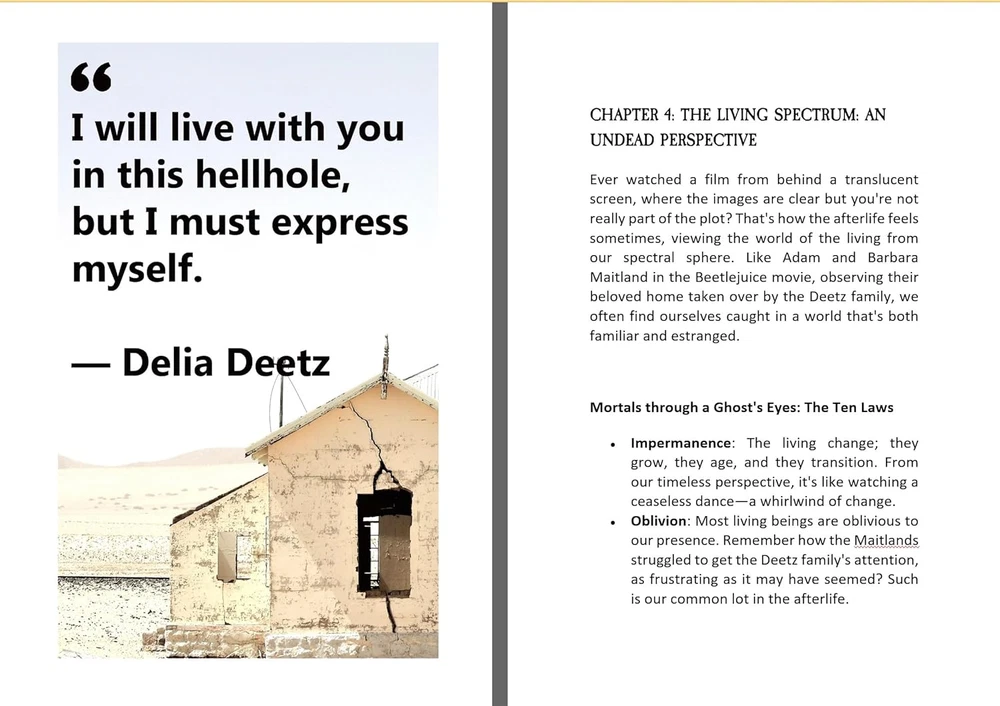Store New Arrivals Add to Favorite View Feedback Contact Handbook for the Recently Deceased: the Afterlife - Halloween Gifts Description Publisher Pooper Publishers (August 18, 2024) Paperback 236 pages Dimensions 6 x 0.54 x 9 inches Language English Item Weight 13.7 ounces ISBN-10 1963674790 ISBN-13 978-1963674798 The Ultimate Halloween Gifts: Handbook for the Recently Deceased BEETLEJUICE JOURNAL & HANDBOOK Are you a fervent Beetlejuice fan? Have you always wondered about the mysterious "Handbook for the Recently Deceased" that captivated you throughout the film? Good news! The long-awaited treasure, inspired by the iconic movie prop, is finally here - and it's no empty mock-up, but the real deal! Prepare to delve deep into the supernatural as you explore pages filled with instructions on levitation, haunting, and so much more. This handbook is a veritable encyclopedia of the ethereal, all housed in a beautifully designed cover that faithfully recreates the look of the movie's unforgettable prop. Perhaps you were skeptical, expecting a novelty blank journal. Banish those thoughts! This handbook is crammed full with useful (or at least entertaining) information. All the references you loved from the movie, plus even more secrets of the afterlife, are waiting for you in this truly unique tome. The handbook is designed with readability in mind, boasting a large text font that's easy on the eyes - a feature anyone can appreciate. And for those die-hard Beetlejuice fans among you, you're sure to resonate with one fellow fan who declared, "As someone who grew up watching Beetlejuice on repeat, I bought this book without hesitation and would definitely buy again!" Indeed, the "Handbook for the Recently Deceased" is an absolute must-have for any Beetlejuice fan's collection. Whether you're a long-time follower of the movie or a newfound fan, you'll appreciate the nostalgic nod and captivating content of this handbook. Don't miss out on the opportunity to secure this beloved piece of Beetlejuice lore. It's time to turn the page to your new adventure in the afterlife! Scroll Up Now and Click The Buy Button To Get Started! ABOUT US We offer the best prices around on high quality products. Our E-store includes media such as books, movies, music and games while offering electronics, toys, sporting apparel, clothing, tools, general home, garden items and more. SHIPPING We are always working hard to ensure your package arrives as soon as possible. Please understand that some factors like weather, high postal traffic, and the performance of shipping companies are outside of our control. We offer free shipping to the lower 48 states and ship within 2 business days of payment, usually sooner. We do not accept P.O. Boxes. Please provide a physical address. RETURNS We offer a 30-Day Return Policy on items which you are not completely satisfied with. You have the option for a full-refund or an exchange of the item. No returns are available on items shipped outside of the USA. PAYMENT We accept PayPal. CONTACT US This page content is yet to come Please ad us to your favorite seller and visit again later Thank You CUSTOMER SATISFACTION We try our very best to make sure every customer is completely satisfied. If there's a problem, message us! We're happy to help.