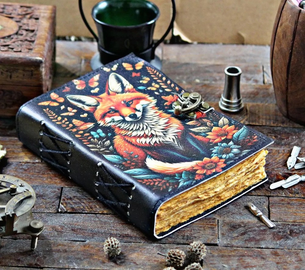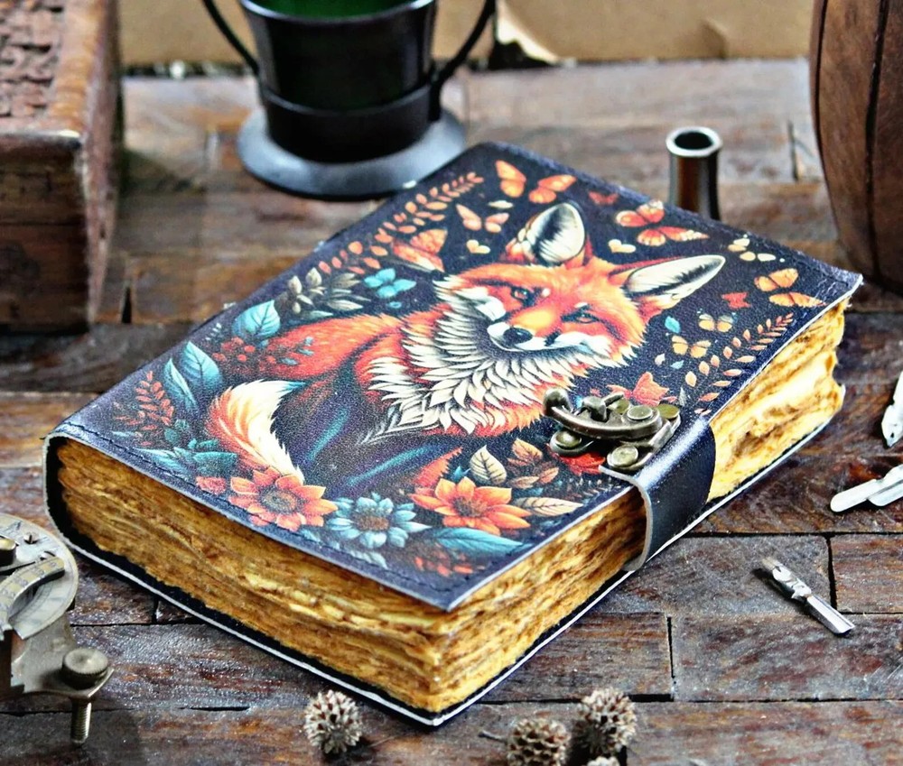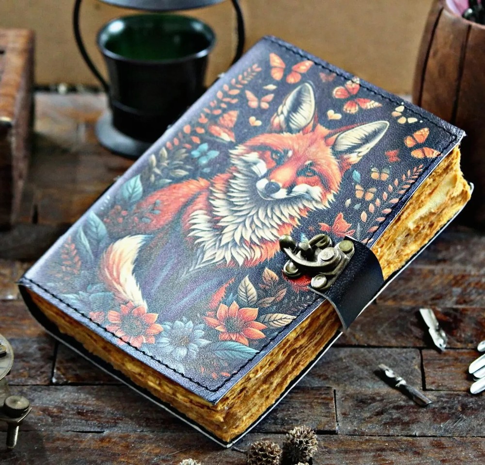 This handcrafted leather fox journal is a luxurious and limited edition notebook perfect for writing and sketching. With a rustic leather cover and personalized touches, this journal is ideal for those who appreciate high-quality craftsmanship. Made in India, this unique notebook is sure to make a special gift for anyone who enjoys creating their own masterpieces. Vintage lock closure • Genuine buffalo leather • Vintage deckle edge old paper • handmade rustic cotton paper • 100 Sheet (200 pages both side) Elevate your creative journey with our meticulously handcrafted Fox Leather Journal. Crafted with care and adorned with a stunning fox design, this rustic notebook is your perfect canvas for writing, sketching, or documenting your adventures. Each journal is a unique work of art, lovingly made from premium leather. Its acid-free pages provide an inviting surface for your thoughts, stories, and artwork. Whether you're an artist, writer, or nature enthusiast, this journal complements your creativity. The fox, a symbol of cleverness and adaptability, adorns the cover, inspiring you on your artistic endeavors. Embrace the charm of this Fox Leather Journal and let your creativity roam free. - Leather journal witchcraft book of shadows notebook is made with 200 pages of Antique Paper which looks like it was pulled from history. You will fall in love with the the antique handmade cotton paper which is unique to our Vintage Journal Notebook. ● The vintage clasp lock will keep all your valuable writing locked inside.Sturdy hand stitched binding to make sure that no paper comes out loose from your spell notebook. ● The witchcraft supplies journal is printed with a special seven stone called “Chakra healing” which helps to reveal inner truth within yourself and encourage self-awareness and self expression. We have taken extra to make sure that the emboss is perfect in every piece. ● Sketch, Doodle, Write on your Leather Blank Spell Journal with a Calligraphy Pen Fountain Pen, Brush Pen, Ball Pen, Acrylic Colours, Watercolor and many more. We guarantee no bleed through. ● Can be used as a notepad, journal, writing notebook, sketch book. 1.25 inch thickness, easy for handwriting, drawing or sketching and compact for carrying in your bag. Ideal for alternative ● Artist Sketchbooks, Photo Album, Traveling Notes, Business Executive, Logbook, Poetry Work, Journalists, Food Planner, Instagram Scrapbook and Bible Journaling. ● Best Gift For Your Companion: A Journal Is Like A Trusted Friend. You Can Use It To Solve Queries, Get Inventive, Or Record Valuable Memories For Them To Last Forever Or You Can Just Use It As A Gift For Your Wife, Son, Or A Daughter Or For Some Enthusiastic Writer In Your Family. Even For Looking For A Miraculous Spell Book Or A D&D Gamer Looking For His Quest Book. ● Perfectly Sized For Multi-Purpose Use: Length 5", Width 1", Height 7" Inches, This Easy To Carry Personal Diary Is Perfect To Use As A Health Journal, Sketchbook, And Poetry Journal. It’S An Ideal Journal Which Records Your Daily Thoughts And Life Lists. And Also Good For Designing, Doodling, Or Calligraphy Of Your Choice. Handcrafted Leather Fox Journal Rustic Notebook for Writing & Sketching Gift for him her, Blank spell Book of Shadows, Handcrafted best gift ignore. Grimoire journal leather notebook book shadow leather sketchbook leather journal junk journal witchcraft journal spell book book of shadows sketch book leather bound journal black journal fox journal