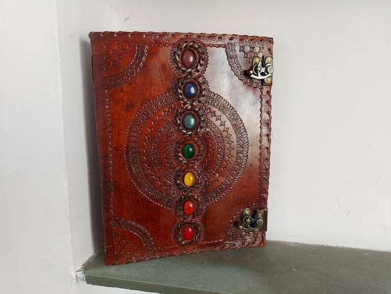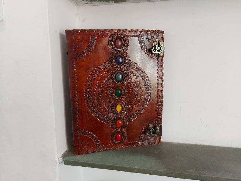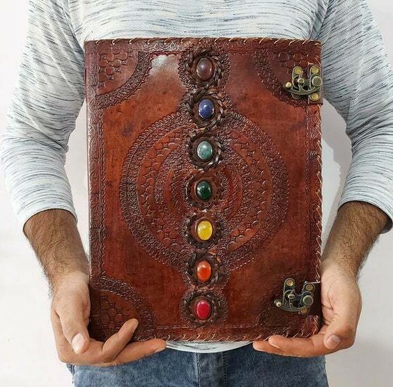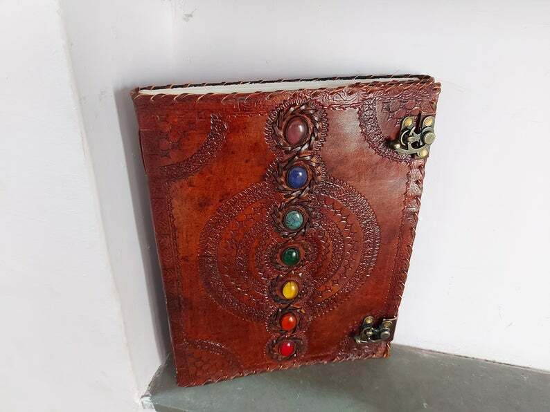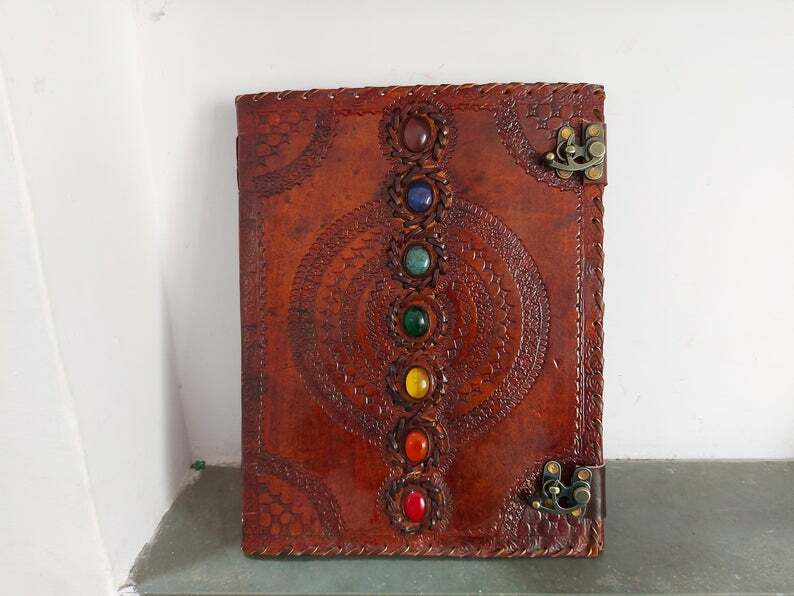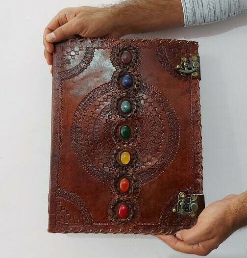 NEW Seven Chakras Leather Journal Handmade book of shadows thanks giving gift Journal Size: 13” x 10 inches Condition: Brand New This stunning leather journal is adaptable to use as a memory journal, sketch book, spell book, Personal Dairy etc. This amazing journal holds seven semi-precious stones. Each of the stones is surrounded with intricate hand embossed circles and patterns. Specifications - Natural Leather 13" x 10" Size Lay Flat Binding 2 Hasp Lock Closure Contains 100 Sheets (Plain Paper) The leather is produced using traditional methods which allows it to retain its character. This means that each journal is unique and comes with its own set of beautiful creases, bumps and marks that develop with age into something truly special. The leather is protected with natural oils to give it a lovely rich finish . Stone color and color may change slightly due to handmade If you have any other information or question, you can message me. INTERNATIONAL ORDERS: For international orders, please be aware that you may have to pay customs fees and or duties. These fees are set by your government and are the responsibility of the buyer. For more information, please contact your local customs office or postal service.
