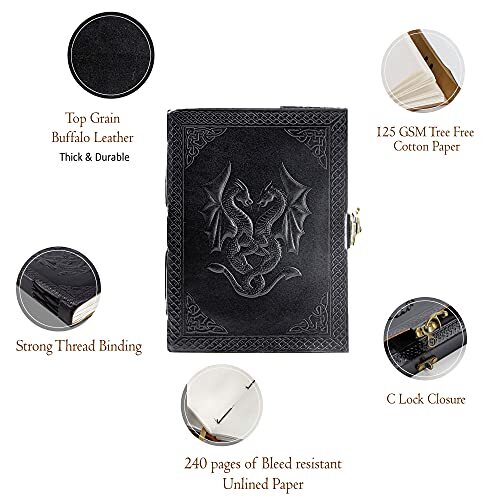 Return Policy Fast Delivery Trusted seller Handmade Leather Double Dragon Journal/Writing Notebook Diary/Bound Daily Notepad for Men & Women Unlined Paper Medium, Writing pad Gift for Artist, Sketch Product Description HANDCRAFTED FROM TOP GRAIN BUFFALO LEATHER: Each of our journals is handmade by skilled artisans using PREMIUM WATER BUFFALO LEATHER AND RECYCLED COTTON PAPER and features a BEAUTIFULLY CRAFTED DESIGN, Which Makes it perfect for use as a LEATHER NOTEBOOK, SKETCHBOOK, NOTEPAD, DIARY and JOURNAL. PREMIUM MATERIALS, GREAT SIZE: Unlike an average journal that may be filled with low-quality paper that degrades the writing experience. Our Leather journals are made with Premium MATERIALS, Like Top Grain Water Buffalo Leather and PREMIUM 125 gsm EARTH-FRIENDLY PAPER that is perfect to write on. NO BLEED THROUGH PAGES: BALL PEN AND SLOW FOUNTAIN PEN FRIENDLY.The journal measures 7 inches height x 5 inches width x 1.5-inch Thickness TELL YOUR STORY: We designed this classic leather journal for men and women as a time capsule for your thoughts. Capture your important memories, accomplishments, life-changing moments and evolving dreams as a keepsake to reflect upon in years to come. PERFECT GIFT AND COLOR OPTIONS FOR EVERY INDIVIDUAL: Makes an Awesome Anniversary, Graduation, Valentine, Christmas, Birthday Gift. Great gift for women and men, students, Artists, travellers. AVAILABLE IN two colours and 2 sizes. OUR 1 YEAR REPLACEMENT WARRANTY: Your purchase is risk-free if by any chance your handmade journal arrives damaged or you find any faults with the craftsmanship, Kindly let us know directly and we will send you a free replacement or a full refund within a year of purchase. Shipping Returns Payment Shipping Shipping is FREE to all addresses other than APO/PO boxes in the lower 48 states. All our stock ships from US-based warehouses. Shipped via USPS or UPS (depending on location and package weight) Unless stated otherwise, all orders will ship within 24-72 hours of your payment being processed. Check our feedback to see the great reviews of FAST shipping we offer. Returns Seller does not accept returns Payment We currently accept payment via eBay managed payments only. Once payment is cleared, we will dispatch your shipment within 1-3 business days. Please refer to the "Shipping" tab for more information regarding shipping speed to your destination.