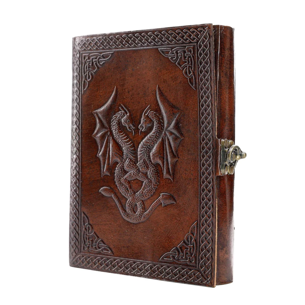 HANDCRAFTED FROM TOP GRAIN BUFFALO LEATHER: Each of our journals is handmade by skilled artisans using PREMIUM WATER BUFFALO LEATHER AND RECYCLED COTTON PAPER and features a BEAUTIFULLY CRAFTED DESIGN of Dragon leather cover, Which Makes it perfect for use as a LEATHER NOTEBOOK, SKETCHBOOK, NOTEPAD, DIARY and JOURNAL. PREMIUM MATERIALS, GREAT SIZE: Unlike an average journal that may be filled with low-quality paper that degrades the writing experience. Our Leather journals are made with Premium MATERIALS, Like Top Grain Water Buffalo Leather and PREMIUM 125 gsm EARTH-FRIENDLY PAPER that is perfect to write on. NO BLEED-THROUGH PAGES: BALL PEN AND SLOW FOUNTAIN PEN FRIENDLY. The journal measures 8 inches in height x 6 inches width x 1.5-inch Thickness TELL YOUR STORY: We designed this classic leather journal for men and women as a time capsule for your thoughts. Capture your important memories, accomplishments, life-changing moments and evolving dreams as a keepsake to reflect upon in years to come. PERFECT GIFT AND COLOR OPTIONS FOR EVERY INDIVIDUAL: Makes an Awesome Anniversary, Valentine's, Christmas, and Birthday Gift. Great gift for women and men Artists, and travellers. AVAILABLE IN 2 colours and 2 sizes. OUR 1-YEAR : Your purchase is risk-free if by any chance your handmade journal arrives damaged or you find any faults with the craftsmanship, Kindly let us know directly and we will send you a free or a full within a year of purchase