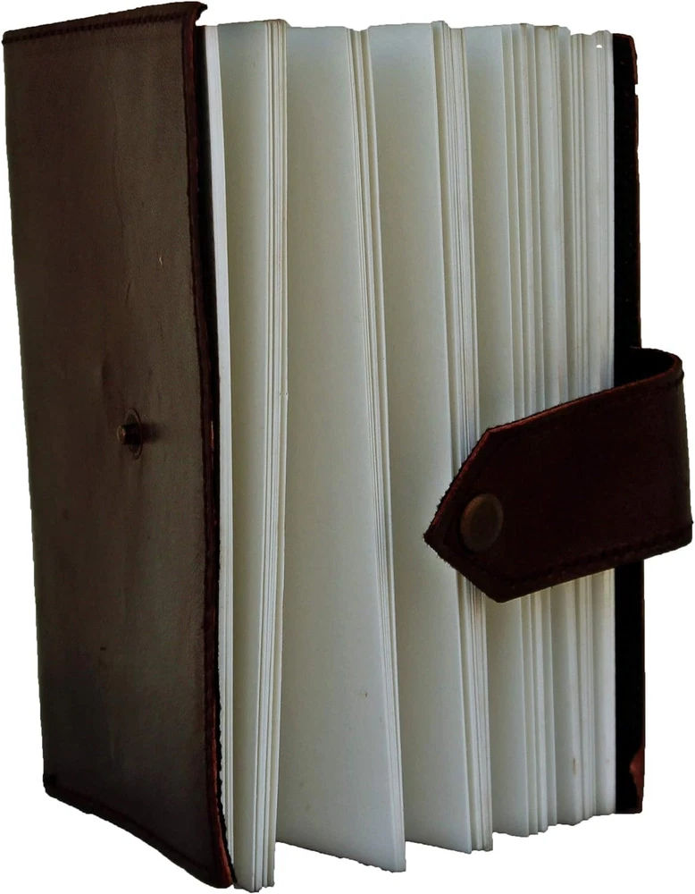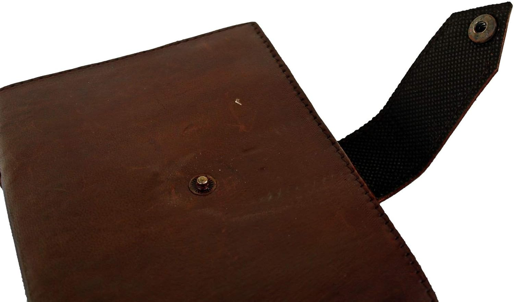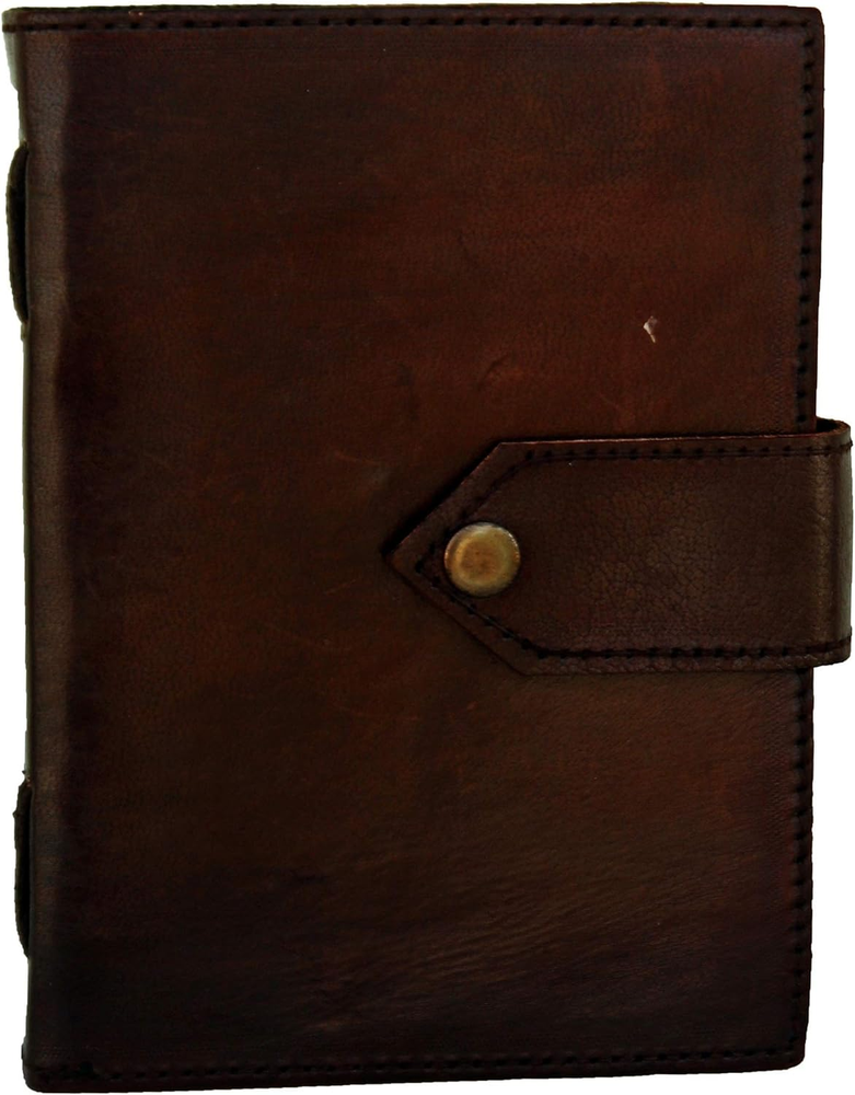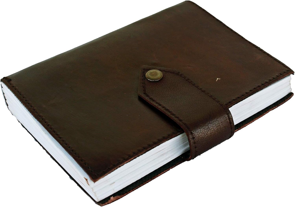 FEATURES: 5 inches wide, 7 inches tall and about 1.25 inches thick with acid-free Plain Cream recycled cotton pages suitable for use with any type of pen for all everyday writing tasks, Front face also covers with a quality Touch Button that keeps it secure. Perfectly suited for accepting charcoal, pen, pencil, or even paint, Non bleeding & eco friendly papers. PREMIUM QUALITY: Genuine Durable leather cover made by experienced craftsman with strong stiches to ensure long term utility. Excellent quality, acid-free paper, made of recycled biomass, quality leather looks antique and rustic, soft, smooth, but no smells. The classic elegant design style of this notebook memo never goes out of fashion, which makes it useful for a long time. MULTIPLE FUNCTIONS: Each journal is carefully hand bound enabling you to pour your thoughts easily This leather notebook is a great and classy way to record your life. Ideal for any budding Writer Artist or anyone simply wanting to do some high-quality note taking, Best alternative for Creative writing, Artist Sketchbooks, Travelling Notes, Business Executive, Hunting Logbook, Poetry Work, Journalists, Food Planner and Bible Journaling Cartoonists, Poets, Designers, Graphic Artists etc. VINTAGE CHARISMA: Beautifully handcrafted Soft & Supple Dark Brown Genuine Leather is being made from 100% natural leather, our journals may vary in look & shade, producing a unique item, no two are quite the same giving it a antique classy vintage rustic look - a special keepsake for your thoughts, plans & ideas in this Hardcover executive notebook PERFECT GIFT: A must have for all traveller and an ideal gift for your family and friends, or even yourself, this distinctive refillable journal will help words flow freely. A gift for all occassion graduation, Christmas, Mother's Day, Father's Day, Teachers day, Valentines Day, Halloween, long trips, or other special events for men & women. Bound handmade fiber paper with Genuine Leather covers was once the standard for recording historical events, and even religious followings. This diary is handmade one at a time just like the diaries were in the Medieval Renaissance period to accurately reflect the same quality and level of detail as ancient times. This book contains 110 to 120 thick, soft pages of authentic handmade fiber parch paper and Recycled materials that hold any type of ink and perfect for classic calligraphy and scripting. Whether you want to write poetry or spill your heart and soul out onto the handmade fiber pages, you can personalize this handmade book to your will. The front cover of this handmade leather diary depicts a simple plain style with stitched leather edge. The cover is 100% genuine leather and are handmade from top to bottom. Securing your personal thoughts is easy to achieve since this leather diary comes with an attached leather strap that doubles as a bookmark