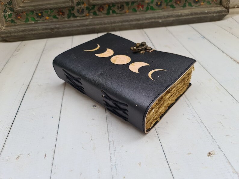 Beautifully adorned with the powerful symbolism of the moon phases. Handcrafted with love and care, this journal is a sacred space for witches, spiritual seekers, and anyone attuned to the lunar energies of the universe Triple moon Goddess color printed journal • Triple moon print • C-Lock brass • Genuine buffalo leather • Vintage look deckle edge old paper ↪ Size - 7x5 Inches, 8x6 Inches, 10x7 Inches • Soft Luxurious Durable and Supple Rustic Leather Bound Cover which ages with time. • Thick Antique Vintage Cotton Paper which looks like thousand years old. • Sturdy Leather Binding Technique will make sure that the pages never fall off. Moon Phases Print Blank Spell Book, Book of Shadows, Vintage Leather Journal Gift for Him & Her