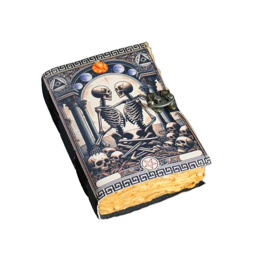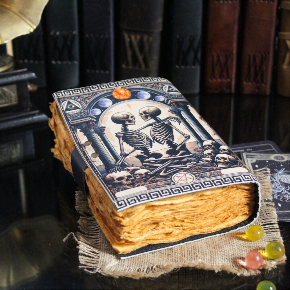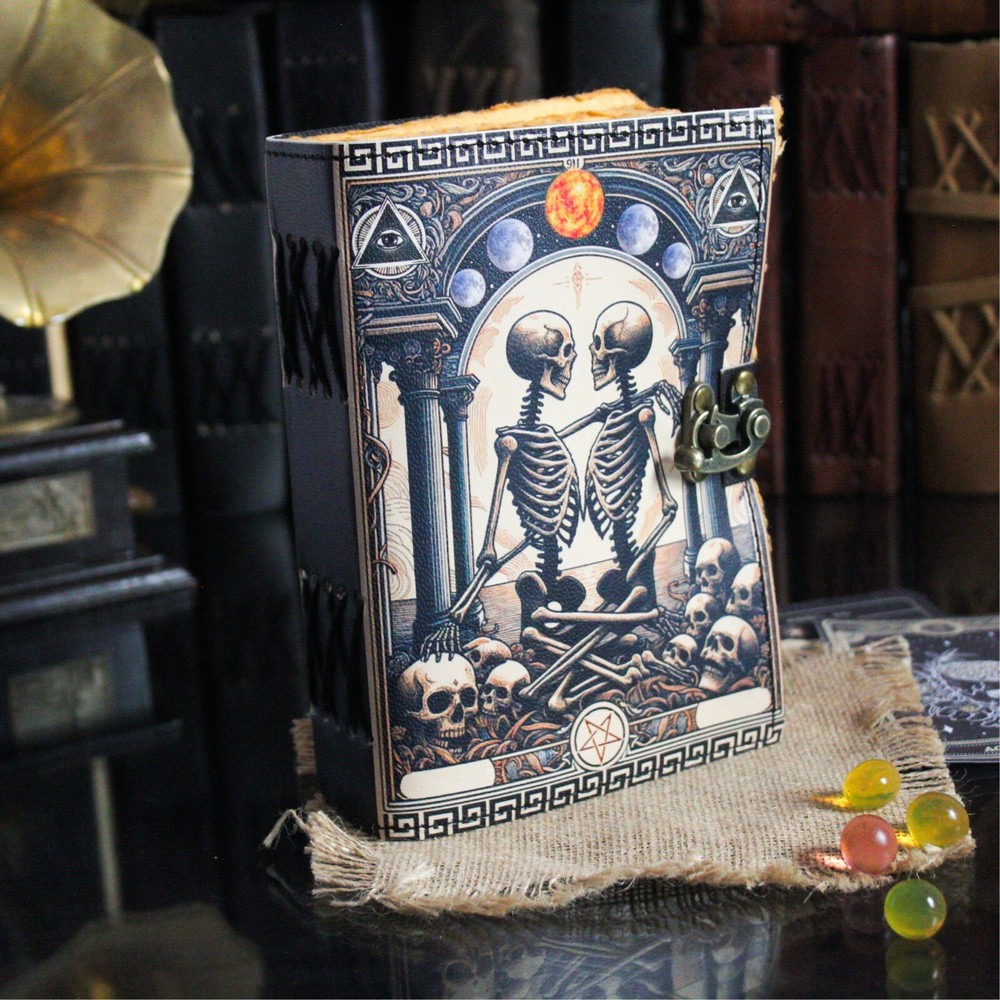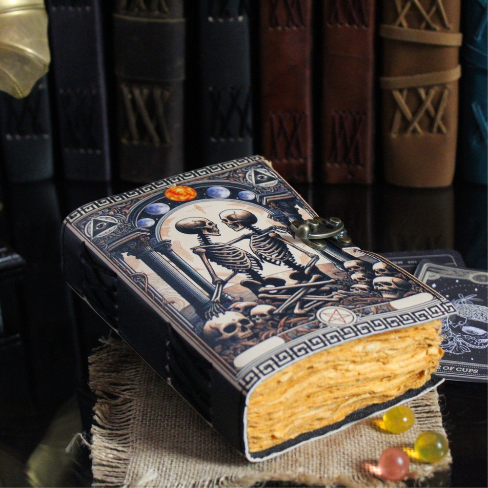 BEAUTIFULLY CRAFTED: Our handmade artisan leather bound spell book grimoire journals are crafted from genuine leather. The black coloring gives it a beautiful antique vintage feel. Being hand-made from natural leather. The cover features a beautiful gold designing.. VINTAGE LOCK AND STURDY BINDING - The vintage clasp lock will keep all your valuable writing locked inside. Sturdy hand stitched binding to make sure that no paper comes out loose from your Spell BOOK. PERFECT FOR GIVING: Suitable for both men or women to write in, this locking diary daily travelers notebook is perfect for an avid writer, or Harry Potter fan looking for a magic spell book. Ideal to give as a birthday gift, valentines, Halloween, graduation or wedding anniversary present. Spell Book Tarot Journal Merchandise Popsocket Grimoire Wiccan Witch Prop Spells Decor Skull Lovers Blank Notebook Gift Props Spell book Blanks With Clasp Coloring Books For Men Women Adult and you can keep this journal at your bedside as like memory of your loved ones.. USE ANY KIND OF PEN - Size: 5"X7" This Gothic gifts Sketch, Doodle, Write on your Book with a Calligraphy Pen Fountain Pen, Brush Pen, Ball Pen, Acrylic Colours, Watercolor and many more. We guarantee no bleed through. SIZE - 5X7 Inch. OUR PROMISE: We are positive you will love our products, but if you don't for any quality reason, we will replace or refund for up to 30 days after purchase. Our friendly customer service team are always available to answer any questions you might have. MANY USES - This aesthetic Lovers Journal Can be used as a Hocus Pocus gifts , the lovers tarot journal, gothic notebook, skull journal, spell books halloween decorations, book of spells halloween decor. grimoire spell book, drawing or sketching and compact for carrying in your bag. Ideal for alternative Artist Sketchbooks, Photo Album, Traveling Notes, Business Executive, Logbook, hocus pocus spell book , Journalists, Food Planner, old spell notebook, antique handmade skull journal