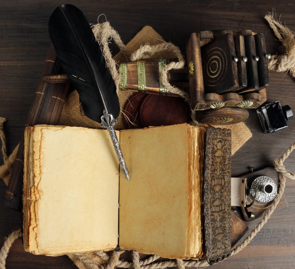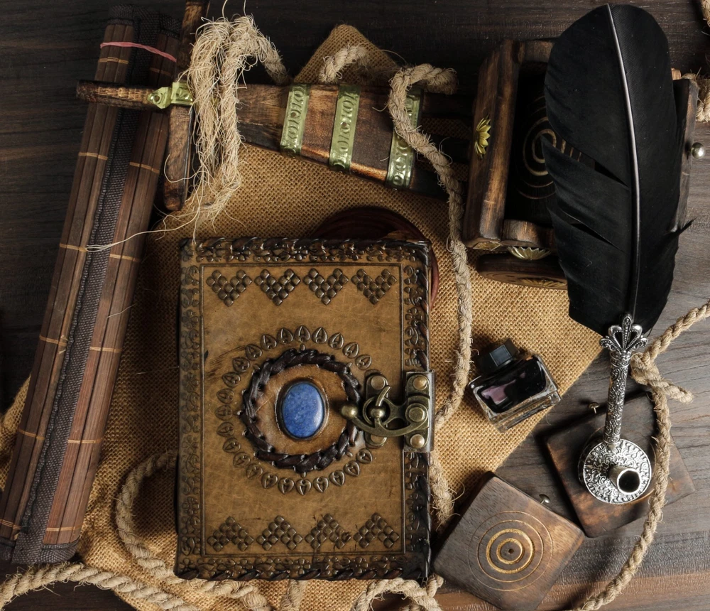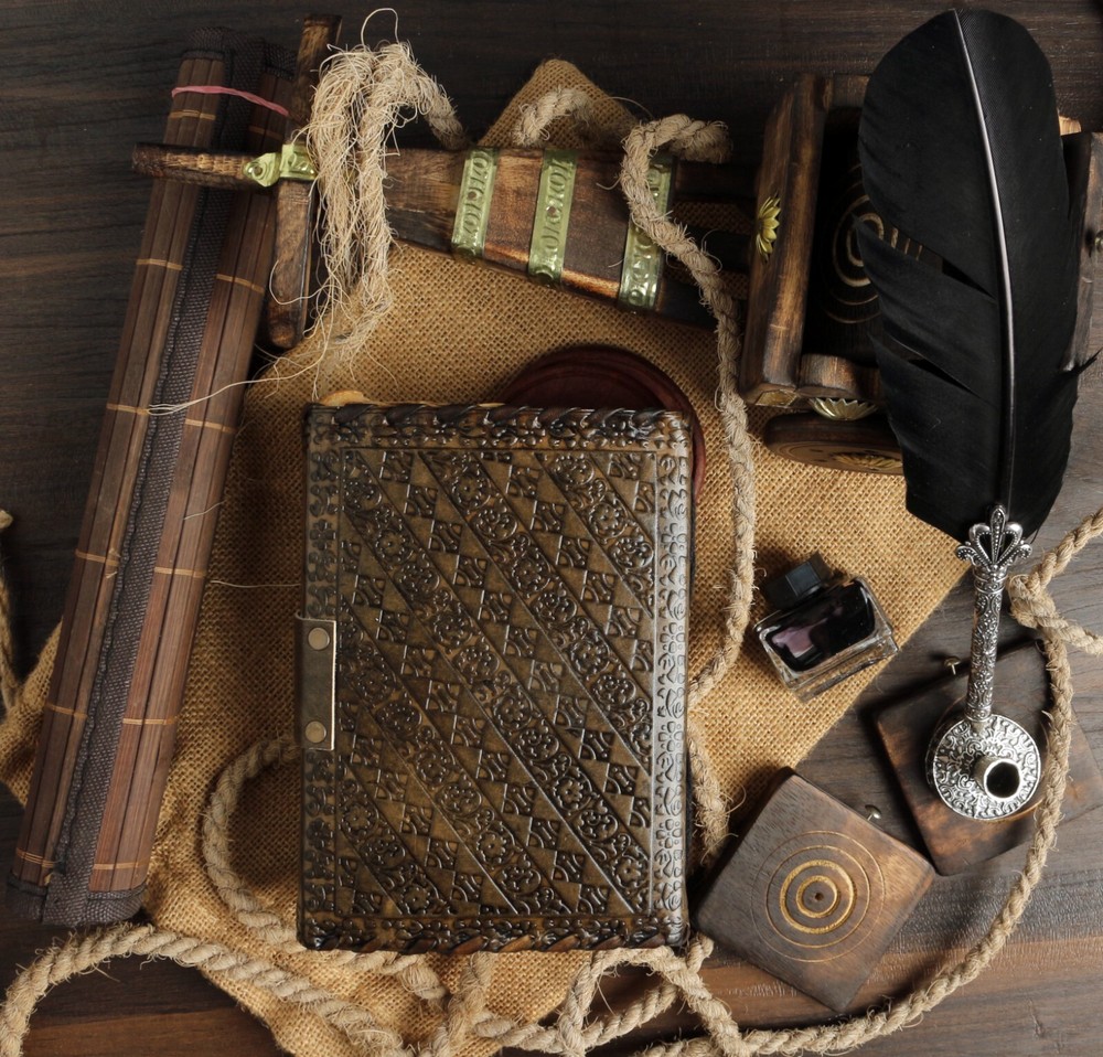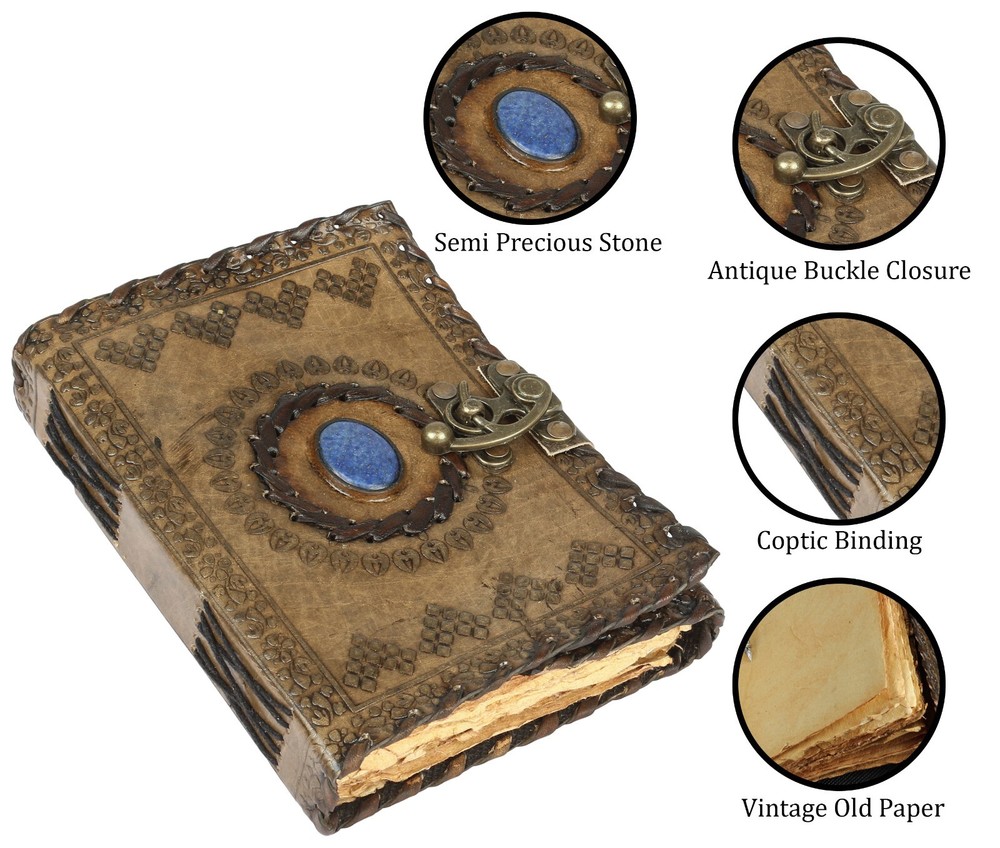 UNIQUE HANDMADE VINTAGE PAPER - Vintage Journal is made with 200 pages of Antique Paper which looks like it was pulled from history. You will fall in love with the the antique handmade cotton paper which is unique to our Vintage Journal Notebook. EXQUISITE & UNIQUE WITCH SEVEN STONE : The vintage journal is antique color embossed with a special stone called “lapis lazuli” which helps to reveal inner truth within yourself and encourage self-awareness and self expression. We have taken extra to make sure that the emboss is perfect in every piece. VINTAGE LOCK AND STURDY BINDING - The vintage lock will keep all your valuable writing locked inside. Sturdy hand stitched binding to make sure that no paper comes out loose from your vintage notebook. USE ANY KIND OF PEN - Sketch, Doodle, Write on your Leather Bound Journal with a Calligraphy Pen Fountain Pen, Brush Pen, Ball Pen, Acrylic Colours, Watercolor and many more. We guarantee no bleed through. MANY USES - Can be used as a notepad, journal, writing notebook, sketch book. 1.25 inch thickness, easy for handwriting, drawing or sketching and compact for carrying in your bag. Ideal for alternative Artist Sketchbooks, Photo Album, Traveling Notes, Business Executive, Logbook, Poetry Work, Journalists, Food Planner, Instagram Scrapbook and Bible Journaling.