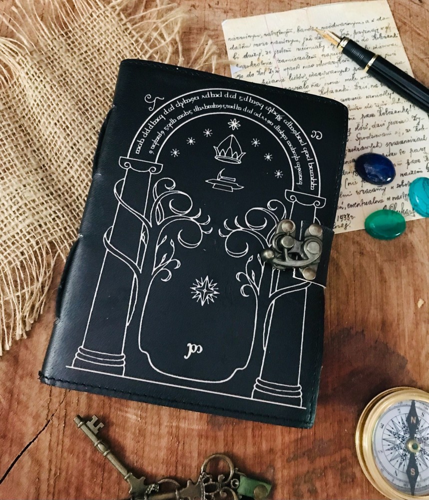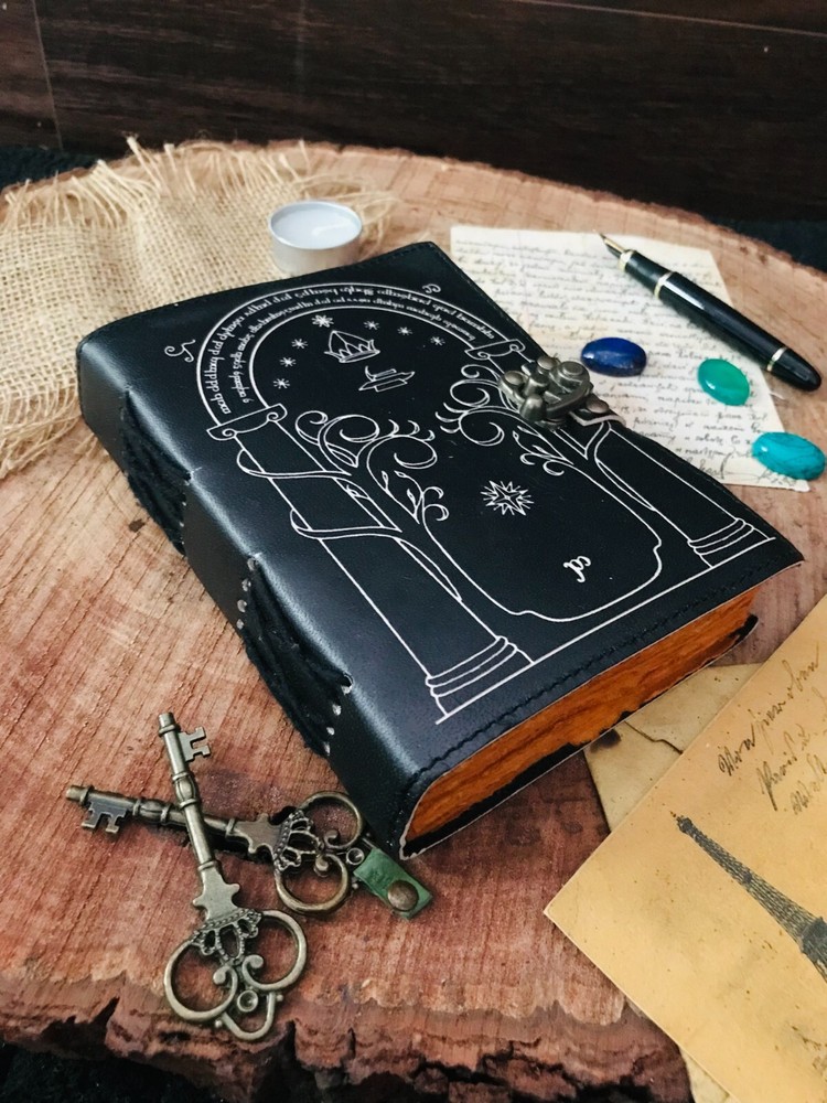 BEAUTIFULLY CRAFTED: Our handmade artisan leather bound spell book grimoire journals are crafted from genuine leather. The black coloring gives it a beautiful antique vintage feel. Being hand-made from natural leather. The cover features a beautiful gold designing. VINTAGE LOCK AND STURDY BINDING : The vintage clasp lock will keep all your valuable writing locked inside. Sturdy hand stitched binding to make sure that no paper comes out loose from your Spell BOOK. PERFECT FOR GIVING: Suitable for both men or women to write in, this locking diary daily travelers notebook is perfect for an avid writer, or Harry Potter fan looking for a magic spell book. Ideal to give as a birthday gift, valentines, Halloween, graduation or wedding anniversary present. USE ANY KIND OF PEN : Write on your Book with a Calligraphy Pen Fountain Pen, Brush Pen, Ball Pen, Acrylic Colors, Watercolor and many more. OUR PROMISE: We are positive you will love our products, but if you don't for any quality reason, we will replace or refund for up to 30 days after purchase. Our friendly customer service team are always available to answer any questions you might have. MANY USES : This aesthetic Doors of Durin Journal Can be used as a Hocus Pocus gifts , the Lords of the rings journal, gothic notebook, skull journal, spell books halloween decorations, book of spells halloween decor. grimoire spell book, drawing or sketching and compact for carrying in your bag. Ideal for alternative Artist Sketchbooks, Photo Album, Traveling Notes, Business Executive, Logbook, hocus pocus spell book , Journalists, Food Planner, old spell notebook, antique handmade skull journal