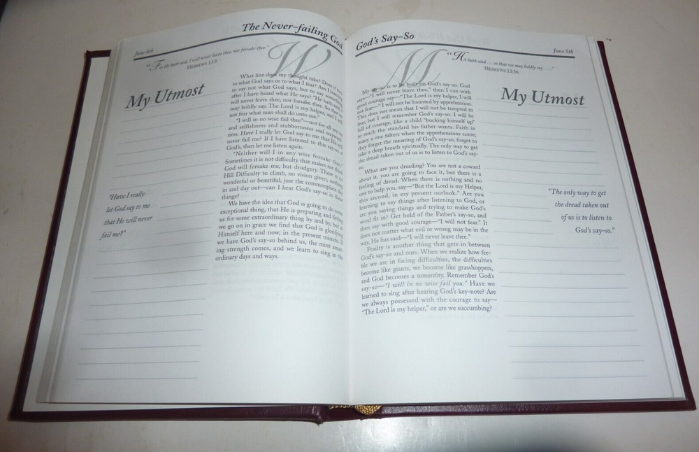 Hardcover "My Utmost For His Highest" Daily Devotional Journal Leather Gilded in very good clean condition.