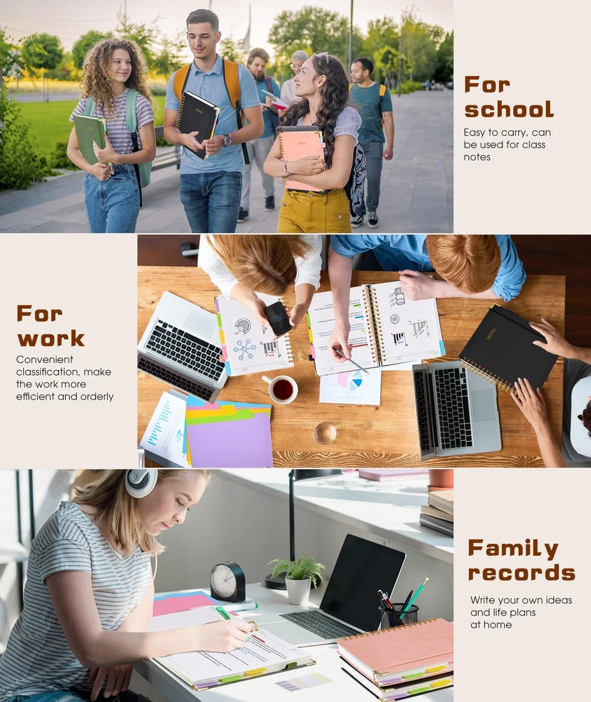 5 Subject notebook the front and back cover is made of premium textured leather witch provide a luxurious touch and water-proof feature.Cover size 8"x10 "inner paper size 7.3"x10" Effectively prevents the divider label from bending, the elastic closure keeps your spiral notebook stable closed and keeps the inside pages neat 4 Golden metal-corners protect the corners of the college ruled notebook prevent accidental scratches your skin during use. Strong metal dual rings can 360°flip the pages and 180°lay flat easily, facilitates writing. 300 Pages thick hardcover notebook Initially divided into five subject of 60 pages per section, the plastic removable divider allow you to customize the number of pages as you need. With 8 self-adhesive labels that separate information and make organize your notes effectively. College ruled spiral notebook made from 100GSM high quality white creamy paper protect your eyes while avoids ink bleeding and can give you a good writing experience. 7.1mm college ruled notebook print “Weather”, “Week”, “Memo No” and “Date” are at the top of each page for classification and reference. Spiral Journal design with one side sewn pen holder and expandable back inner pocket provides convenient for your daily use 【Leather Hardcover Spiral Notebook】Premium leather combine cardboard constituted a sturdy waterproof cover, prevent coffee、water from wetting the inner pages and against the notebook tabs /pages from bending, while 4 golden metal-corners and thick twin- spiral binding, further protect your important meeting records or work school note well. A kind side pen loop design, which reduce the frequency that losing pens. 【5 Adjustable Dividers with 8 Tabs】Our 5 subject notebook include 5 removable plastic dividers, flexible and durable so you can move and organize them as your wish. It can be divided into 5 sections in total, which had enough features to keep organized on different subjects, instead of piles of random spiral notebooks that will slimmed your backpack down a ton! Come with 8 self-adhesive labels that separate information and make it easy to find categories to help organize your notes effectively. 【300 Pages Thick Notebook】Large B5 size notebook 8"x10" with 300 pages /150 sheet for long-term storage will reduce the amount of notebooks you buy! Acid-free light Ivory paper that protect your eyes. High-quality 100GSM thick page create smoother writing process and prevent ink bleeding through or ghosting. 7.1mm college ruled spiral notebook and the top of each page are sections for“Weather”,“Week”,“Memo No” and “Date” to meet your daily note writing needs. 【Easy Writing at 180°Lay Flat】Thick twin-spiral binding less likely to fall apart and easy to turn the pages to ensures that the notebook lays flat when open,making writing a breeze even for left handed writers. Elastic closure band keep your spiral journal secure when closed and can also be used as a bookmark to keep track where you wrote. An expandable back pocket that is great for storing extra notes, cards, or other important items. 【Hardcover Notebooks for Work School】This spiral 5 subject notebooks is an excellent choice for students, professionals, or anyone who like to write things down and needs to keep them organized. A stylish look with gold color stamp font, binding brighten up your dreary desk, also a wonderful gift to work organization, back to school or family records.