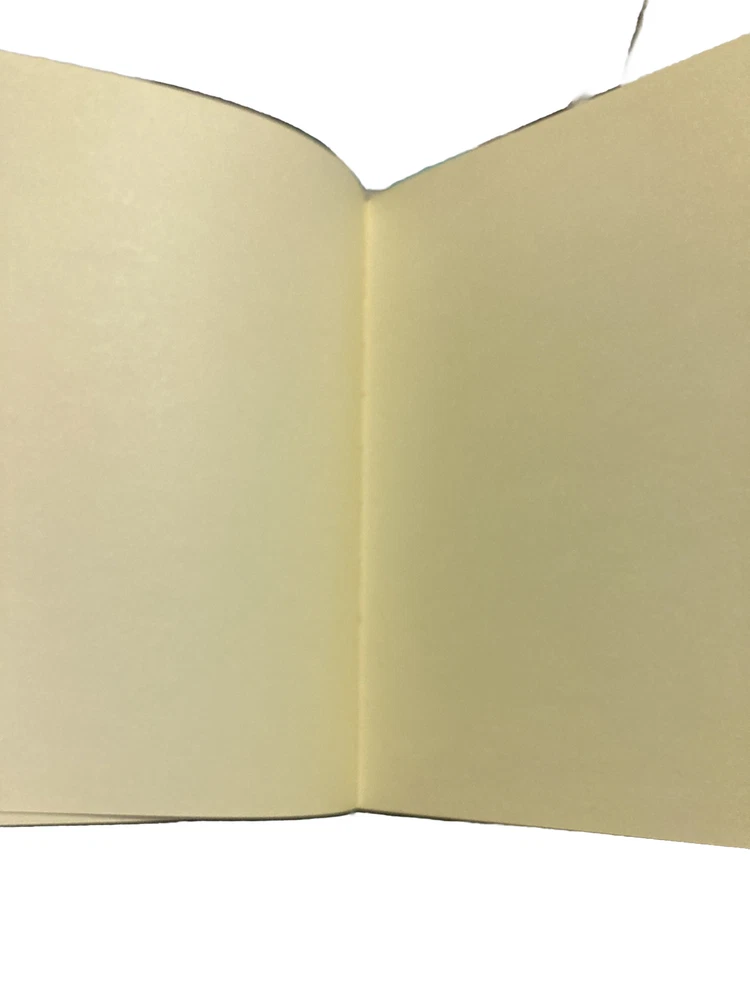 Non- ruled, blank, heavy cream paper in a leather bound hard back with serpentine spine and official SLYTHER crest, pressed in metal, adorned on front cover with permanently attached green ribbon page marker.