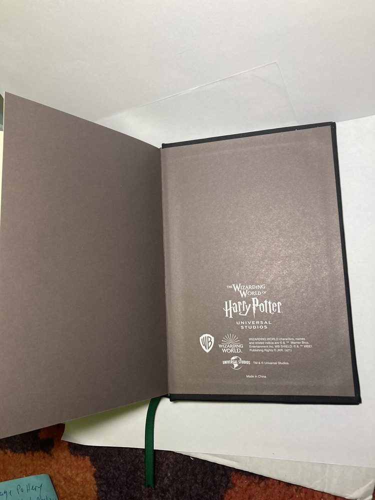 Non- ruled, blank, heavy cream paper in a leather bound hard back with serpentine spine and official SLYTHER crest, pressed in metal, adorned on front cover with permanently attached green ribbon page...