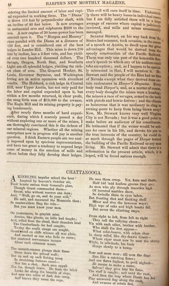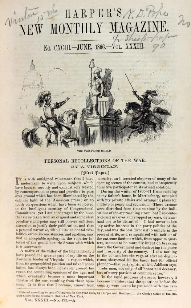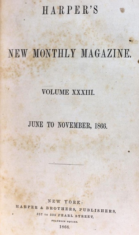 Leather. 8vo. Harper & Brothers, New York, 1866. Volume 33. June to Nov. 1866. 816 pgs. Illustrated. Text in double column. First bound edition. Bound in full tan leather with gilt titles and spine labels present. Marbled endpapers. Previous owner's name stamped in gilt to the front board. Boards have light wear present to the extremities of the boards. No ownership marks present. Text is clean and free of marks. Binding tight and solid. Features: Galena and its Lead Mines; The Yosemite Valley; Livingstone's Last African Expedition; Cast Away; The Flag That Talks; Armandale by Wilkie Collins; Herman Melville's Chattanooga and Gettysburg, The Fall of Richmond, Punishment of Florida after the war, Tom Lodowne; Marriage A La Mode; The American People Starved and Poisoned; Queen's Good Work; Kate; The Voices of the Night; Longwood; Editor's Easy Chair; Monthly Record of Current Events; Editor's Drawer. 12/7 Template Description: Up For Sale Today is Harper's New Monthly Magazine Volume 33 June to November 1866 Leather. 8vo. Harper & Brothers, New York, 1866. Volume 33. June to Nov. 1866. 816 pgs. Illustrated. Text in double column. First bound edition. Bound in full tan leather with gilt titles and spine labels present. Marbled endpapers. Previous owner's name stamped in gilt to the front board. Boards have light wear present to the extremities of the boards. No ownership marks present. Text is clean and free of marks. Binding tight and solid Features: Galena and its Lead Mines; The Yosemite Valley; Livingstone's Last African Expedition; Cast Away; The Flag That Talks; Armandale by Wilkie Collins; Herman Melville's Chattanooga and Gettysburg , The Fall of Richmond, Punishment of Florida after the war, Tom Lodowne; Marriage A La Mode; The American People Starved and Poisoned; Queen's Good Work; Kate; The Voices of the Night; Longwood; Editor's Easy Chair; Monthly Record of Current Events; Editor's Drawer. PLEASE PICK PRIORITY MAIL AS YOUR SHIPPING OPTION IF YOU NEED IT QUICKLY. THE USPS HAS BEEN EXPERIENCING TERRIBLE DELAYS WITH MEDIA MAIL (UP TO A 2 WEEK DELAY)! OUR MISSION STATEMENT: Our goal is to provide the best books for the lowest prices. We understand that you have more choices than ever to buy books, so we strive to provide the best service, accurate descriptions, the cheapest shipping and the best customer service in the realm of bookselling. Thank you for visiting this listing and we hope to see you again soon! Book formats and corresponding sizes Name Abbreviations Leaves Pages Approximate cover size (width × height) inches cm folio 2º or fo 2 4 12 × 19 30.5 × 48 quarto 4º or 4to 4 8 9½ × 12 24 × 30.5 octavo 8º or 8vo 8 16 6 × 9 15 × 23 duodecimo or twelvemo 12º or 12mo 12 24 5 × 7⅜ 12.5 × 19 sextodecimo or sixteenmo 16º or 16mo 16 32 4 × 6¾ 10 × 17 octodecimo or eighteenmo 18º or 18mo 18 36 4 × 6½ 10 × 16.5 trigesimo-secundo or thirty-twomo 32º or 32mo 32 64 3½ × 5½ 9 × 14 quadragesimo-octavo or forty-eightmo 48º or 48mo 48 96 2½ × 4 6.5 × 10 sexagesimo-quarto or sixty-fourmo 64º or 64mo 64 128 2 × 3 5 × 7.5 ALL ITEMS ARE DESCRIBED TO THE BEST OF MY ABILITY! PLEASE CHECK ALL THE PHOTOS BEFORE BIDDING! ALL ITEMS ARE PACKED IN A WATERPROOF CUSTOM FITTED BAG, WRAPPED IN 2 LAYERS OF BUBBLE WRAP AND THEN PLACED INTO A CUSTOM FITTED CARDBOARD MAILER. IF YOU WIN A LARGE NUMBER OF BOOKS OR A SET THE ITEMS WILL BE SHIPPED IN A STURDY BOX. IF YOU DO WIN MULTIPLE ITEMS PLEASE DO NOT PAY FOR THEM INDIVIDUALLY! PAYMENT IS DUE WITHIN SEVEN (7) DAYS OF THE INVOICE! Import duties, taxes and charges are not included in the item price. These charges are the buyer's responsibility. Please check with your country's customs office to determine what these additional costs will be prior to bidding/buying. These charges are typically collected by the delivering freight (shipping) company or when you pick the item up. We do not mark merchandise values below value or mark items as "gifts" as US and International government regulations prohibit such behavior. (This is a felony in the United States) FREE DOMESTIC (MEDIA MAIL) FREIGHT ON ALL AUCTIONS! Images sell! Get Supersized Images & Free Image Hosting Create your brand with Auctiva's Customizable Templates. Attention Sellers - Get Templates Image Hosting, Scheduling at Auctiva.com. Track Page Views With Auctiva's FREE Counter