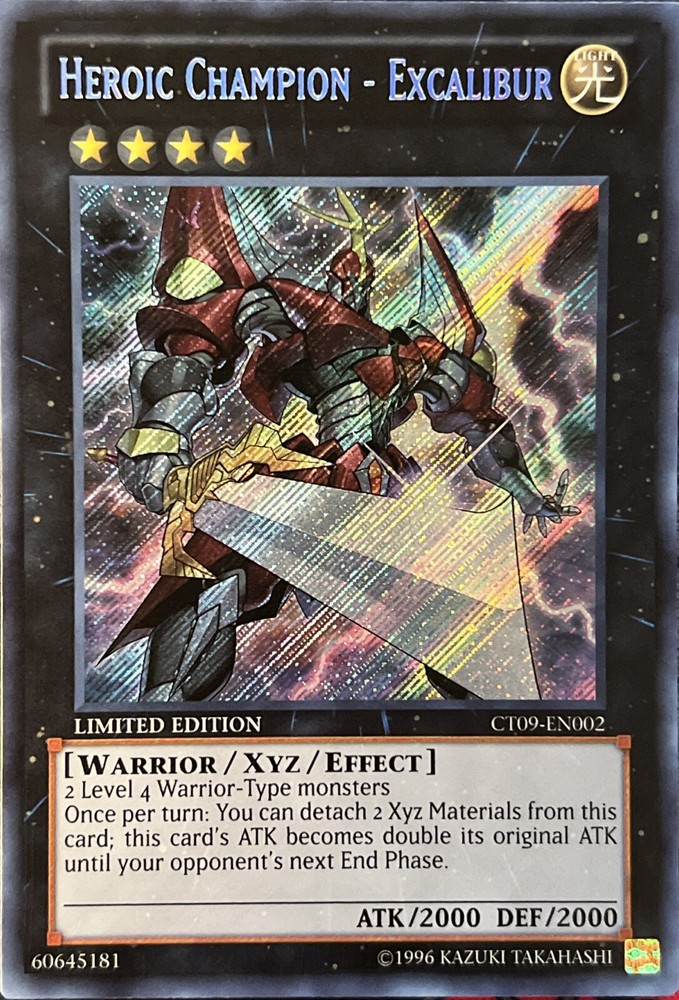 The "Heroic Champion - Excalibur" card is a Limited Edition Secret Rare card from the 2012 Collectors Tin of the Yu-Gi-Oh! Trading Card Game. Manufactured by Konami, this Xyz Effect card has an impressive Attack/Power and Defense/Toughness of 2000. The card features a Warrior monster type and is primarily categorized under Collectible Card Games. It is part of the attribute of Light and is in English language. This card is a valuable addition to any Yu-Gi-Oh! card collection for fans and collectors alike.