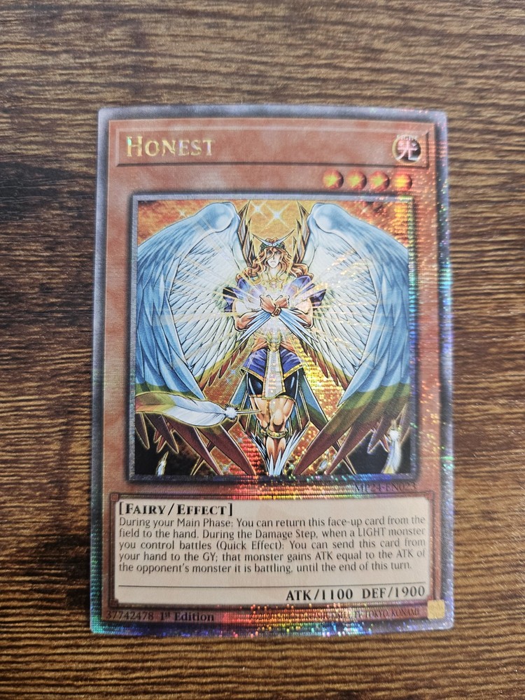 The "Honest" card is a Quarter Century Secret Rare card from the 25th Anniversary Tin: Dueling Mirrors set in the Yu-Gi-Oh! TCG. Manufactured by Konami, this English language card is a Fairy-type creature with 1100 Attack/Power and 1900 Defense/Toughness. It is an Effect card with the card number MP24-EN023 and features 1st Edition rarity. Perfect for collectors of CCG Individual Cards and fans of the Yu-Gi-Oh! TCG.