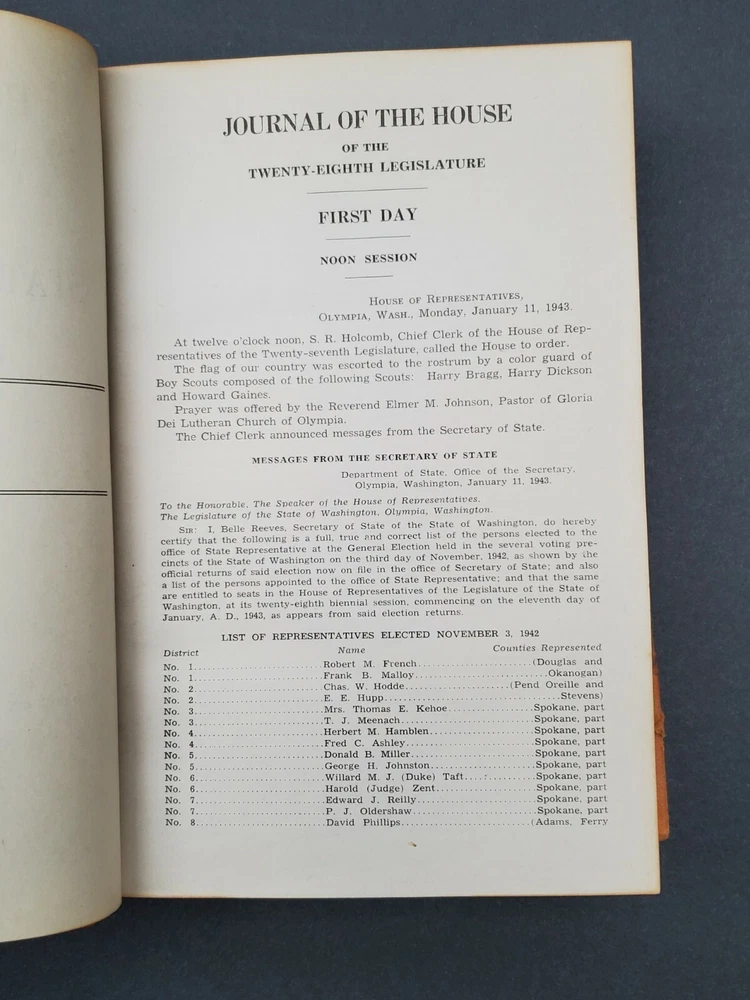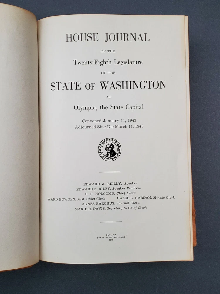 House Journal State Of Washington 1943 Quarter Leather Book WWII Era. Original House Journal State of Washington from 1943. World War II era. Governor Arthur B. Langlie (1941 - 1945 and later, 1949 - 1957) - The only Mayor of Seattle to be elected Governor of Washington. A great collector's book!