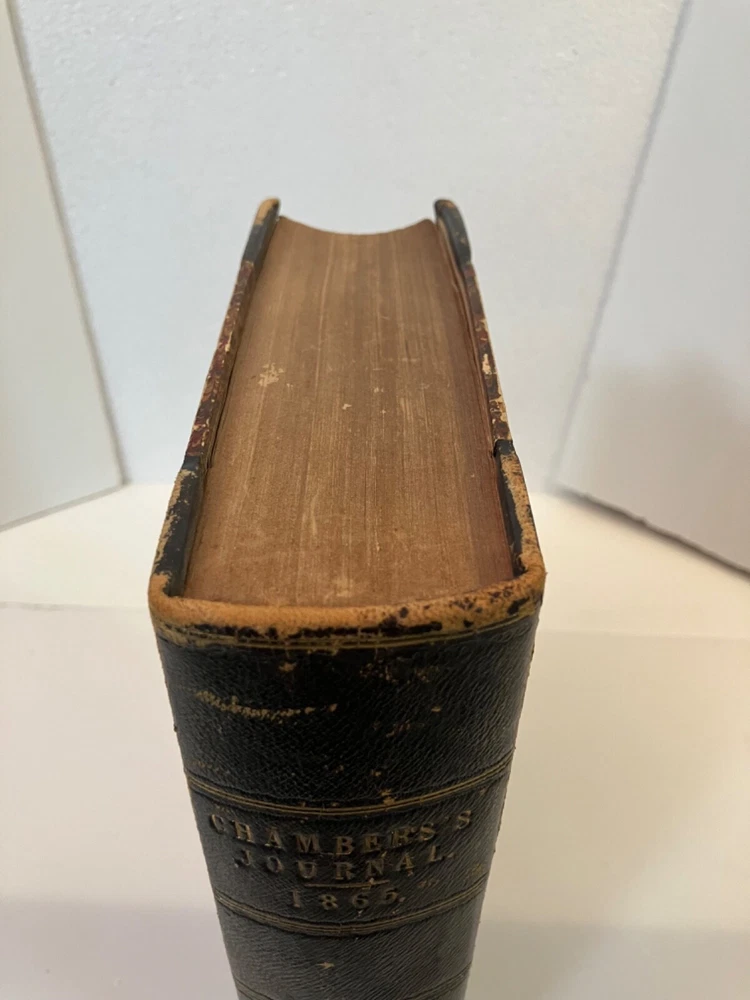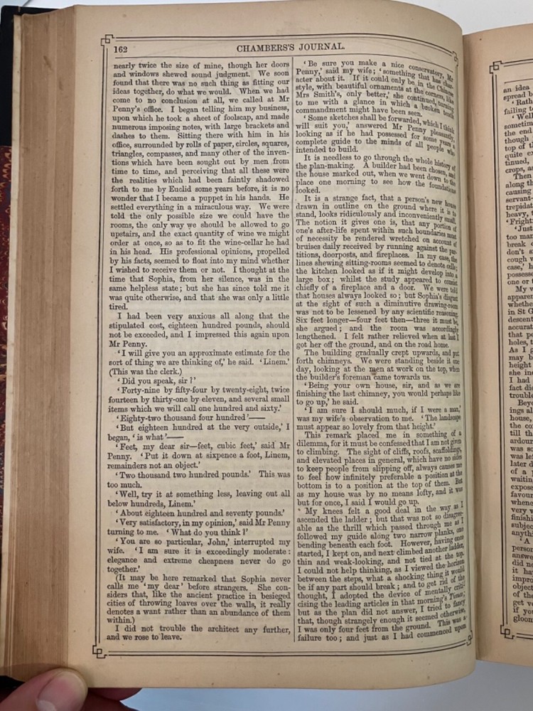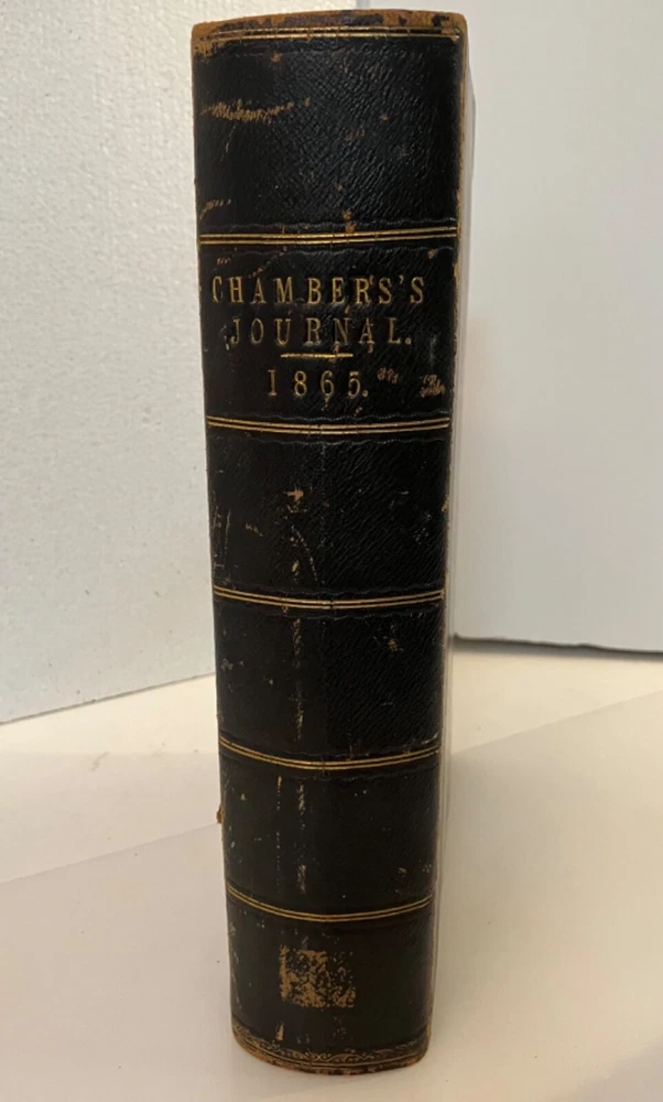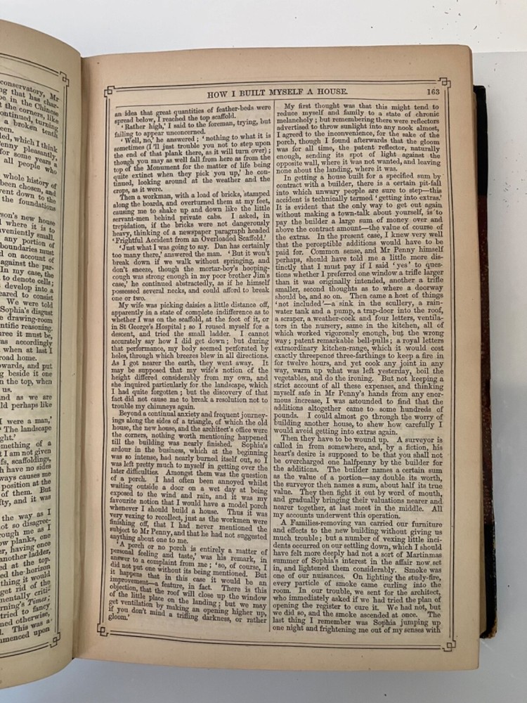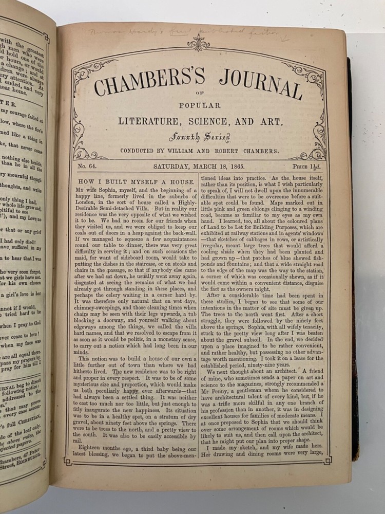 How I Built Myself a House London & Edinburgh : W. & R. Chambers 1865 Hardy's first published fiction work, printed in Chambers's Journal of Popular Literature, Science and Art. Good+ : A chunky annual edition of the journal for 1865, bound in quarter black leather with marbled boards , gilt title to spine. Extremities rubbed with residue of a small sticker near the base of the spine. Hinges cracked but holding. Contents lightly age toned but generally clean. Hardy's short, humorous tale, though published anonymously, appears as the lead feature for the Saturday, March 18,1865 edition , and spans pp. 161-164 of the annual. 832 pp., plus a 32 pp. "Extra Double Christmas Number."