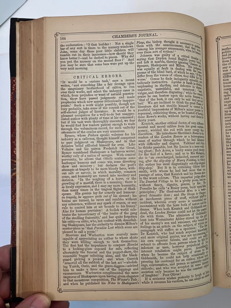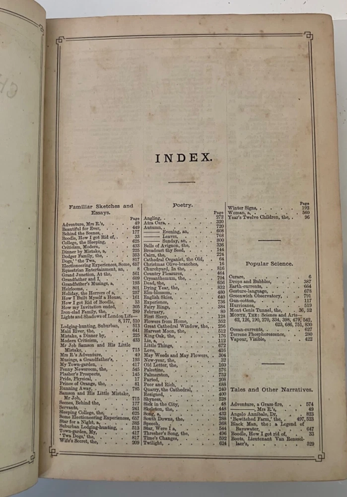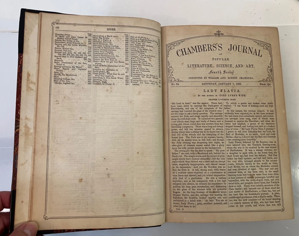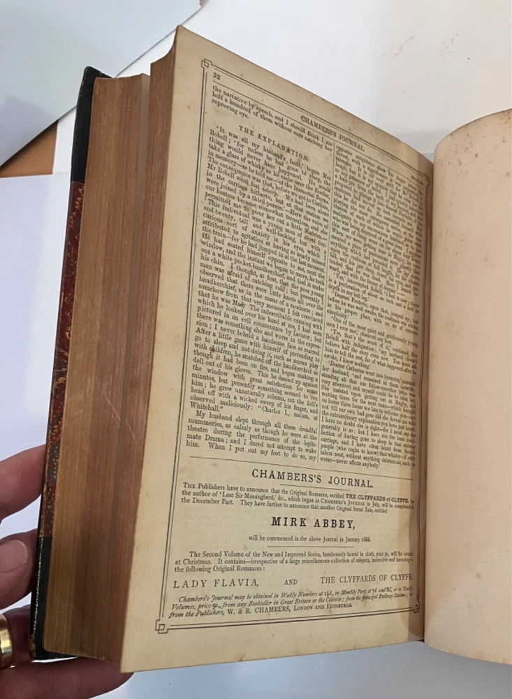 How I Built Myself a House London & Edinburgh : W. & R. Chambers 1865 Hardy's first published fiction work, printed in Chambers's Journal of Popular Literature, Science and Art. Good+ : A chunky annual edition of the journal for 1865, bound in quarter black leather with marbled boards , gilt title to spine. Extremities rubbed with residue of a small sticker near the base of the spine. Hinges cracked but holding. Contents lightly age toned but generally clean. Hardy's short, humorous tale, though published anonymously, appears as the lead feature for the Saturday, March 18,1865 edition , and spans pp. 161-164 of the annual. 832 pp., plus a 32 pp. "Extra Double Christmas Number."