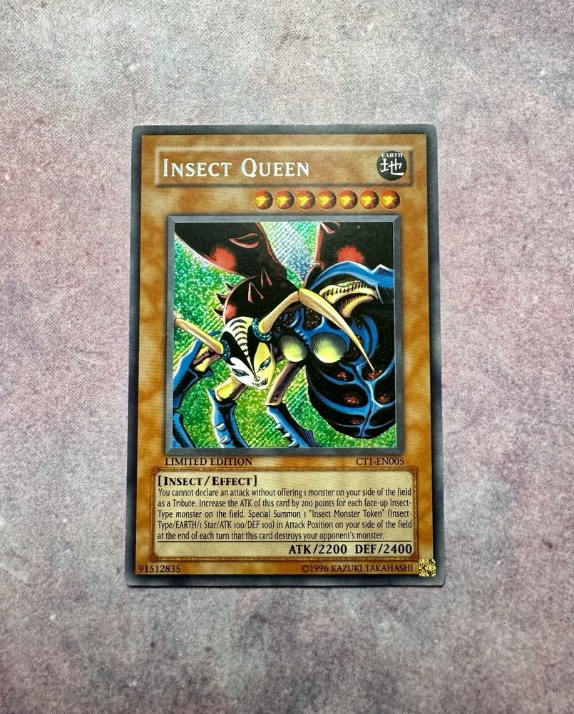 Premium Yu-Gi-Oh cards, all in “mint” or “near mint” condition. These cards have been meticulously cared for and have never been played with. From the moment they were opened, each card was placed in protective sleeves, ensuring they remain in pristine condition. Ideal for collectors and players who appreciate high-quality cards. This exceptional level of care applies to all my other card listings as well. Secure these top-notch cards for your collection today! The "Insect Queen" card is from the 2004 Collectors Tin set of the Yu-Gi-Oh! TCG. Manufactured by Konami, this Secret Rare card has an Earth attribute and belongs to the Insect creature type. With an impressive Attack/Power of 2200 and Defense/Toughness of 2400, this Limited Edition card is a powerful addition to any player's deck. Written in English, the card number is CT1-EN005.