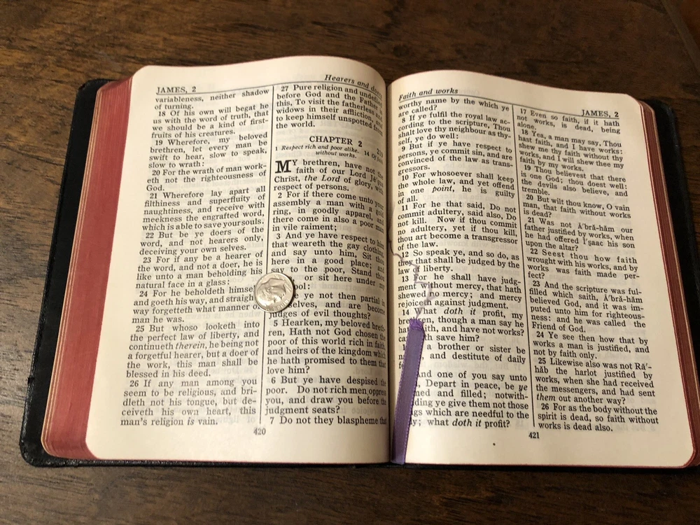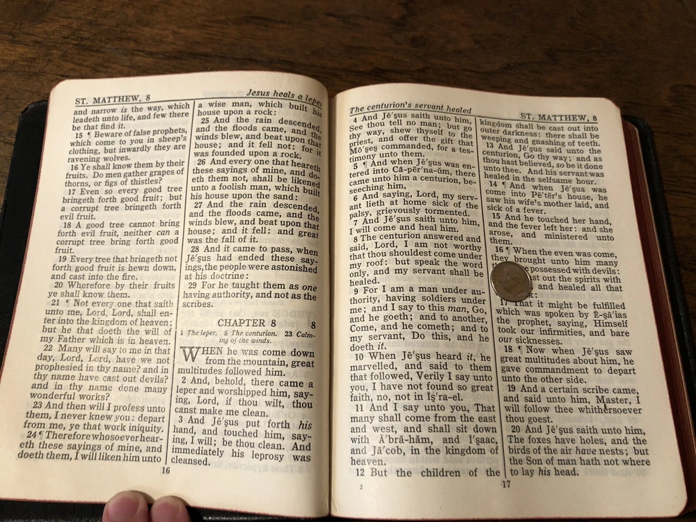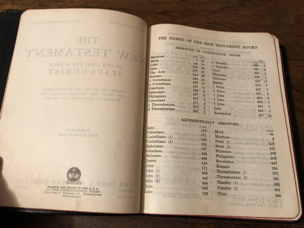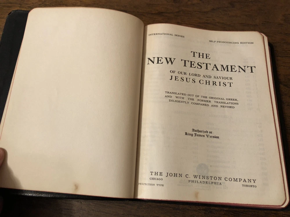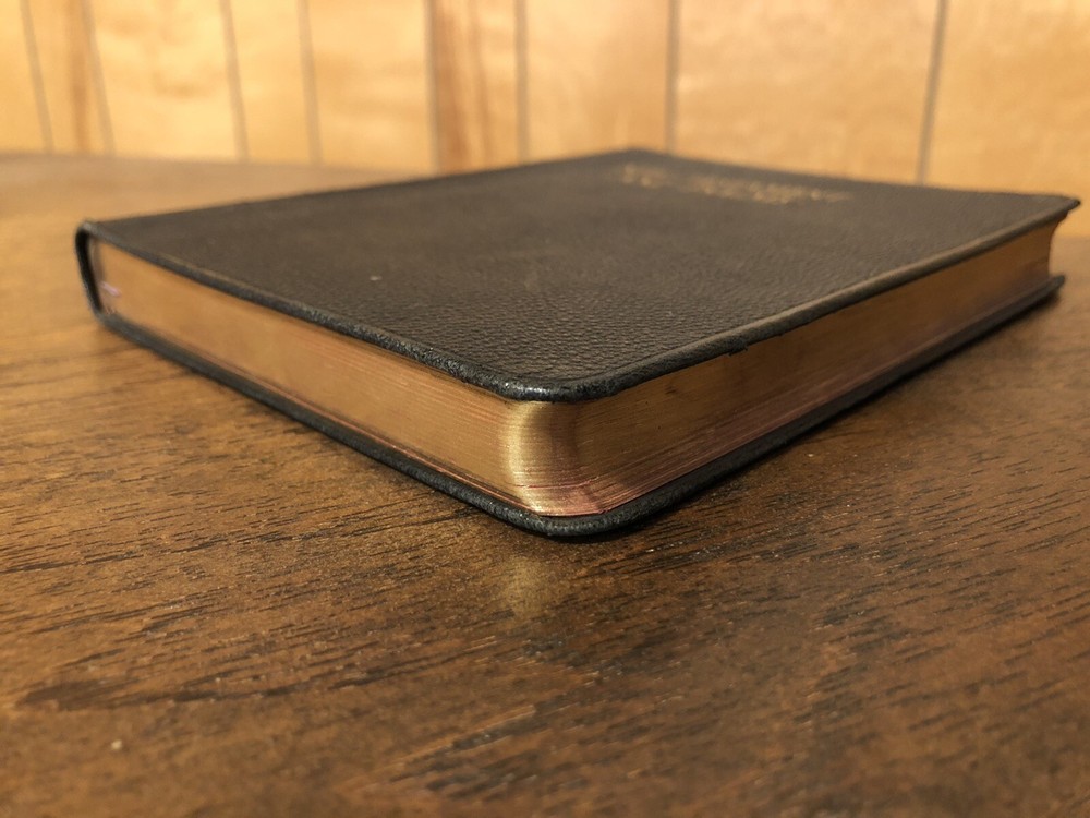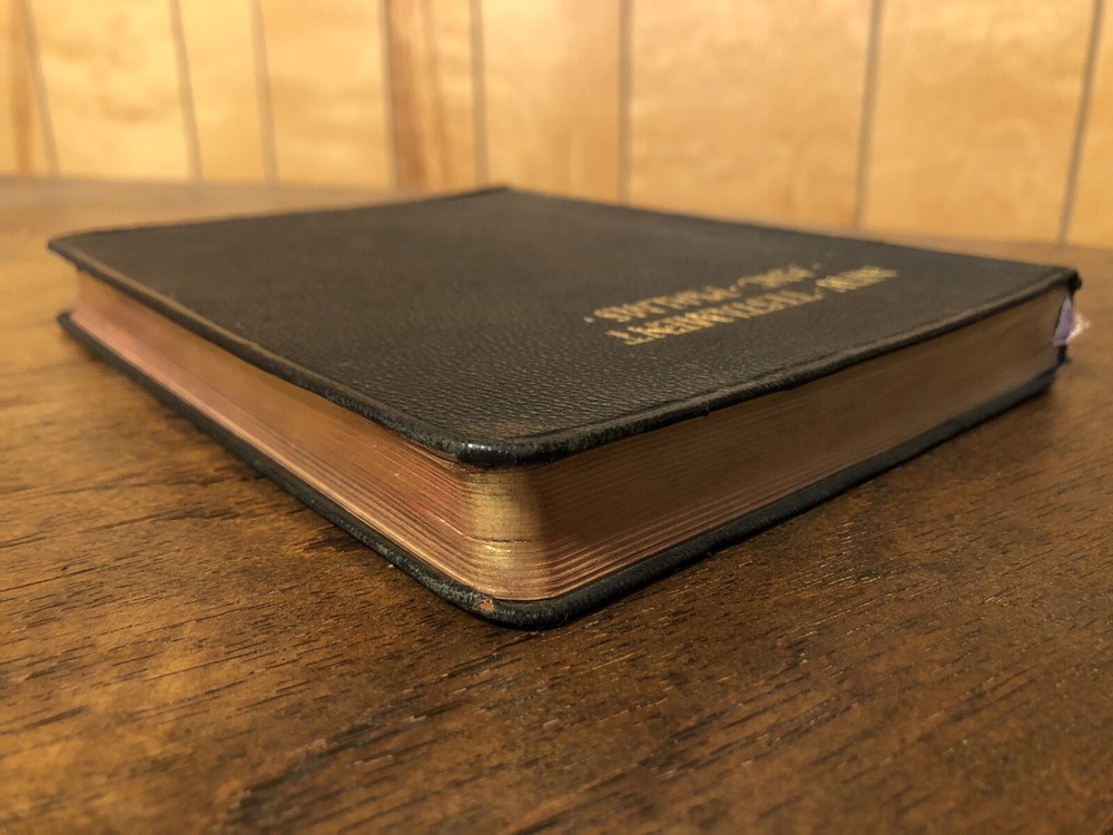 International Press John C Winston Large Print KJV King James Version New Testament Psalms NT Leather 192 This is really lovely New Testament with Psalms only (no Old Testament) published by Oxford in a leather cover with art-gilt page edges. The leather is flexible, but with some “bubbling” in the fold due to age. It’s just quite old. My assumption is that it is genuine leather, but it’s nearly 100 years old. There’s some abrasion mostly at the corners and edges, and some mild chipping at the top of the spine. What stands out with this volume is the large typeface. I gave a picture with a dime to help illustrate this. It is easily a large print Bible. I found no writing at all. I noticed one small stain/age spot on the front couple of pages, but it didn’t bleed enough to affect the text. The page edge gilding is what is a real shocker: it’s in remarkably beautiful condition. I almost kept this in my extensive collection, in fact. I found no loose or exposed signatures. The ribbon is in bad shape, but considering it’s likely 100+ years old, it’s a miracle it’s still attached. Verse setting Double column format Black letter Sewn binding 7.5 x 5.8 x .8 inches Dime used for comparison Note: I do not accept returns unless the item was not as I described because of a mistake I made. If the item is smaller than you thought it would be (because you didn’t read the description with dimensions), that’s on you. I do not cancel orders for any reason, even if you accidentally ordered it. It takes about 3 steps to purchase an item, so if you paid for it, it’s yours. I make these annoying rules because so many customers have recently treated the purchase of items flippantly and I have to draw a line somewhere. Well, here it is. I always list any writing, stains, tears, or imperfection of any kind. And I always list the condition conservatively, so you should expect the item to be in better condition than listed. Unlike the vast majority of sellers out there, I refuse to hide imperfections through cleverly taken pictures or obscure descriptions. I try to include as many pictures as necessary to highlight the imperfections rather than the beauty of the items, which is part of why I have an elevated Seller Status and perfect feedback in which many consistently report back “just as described” or “better than described.” If I miss something by accident, please contact me so I can make it right. My flawless feedback should speak for itself, but you won’t be disappointed! Thank you for your business and God bless!