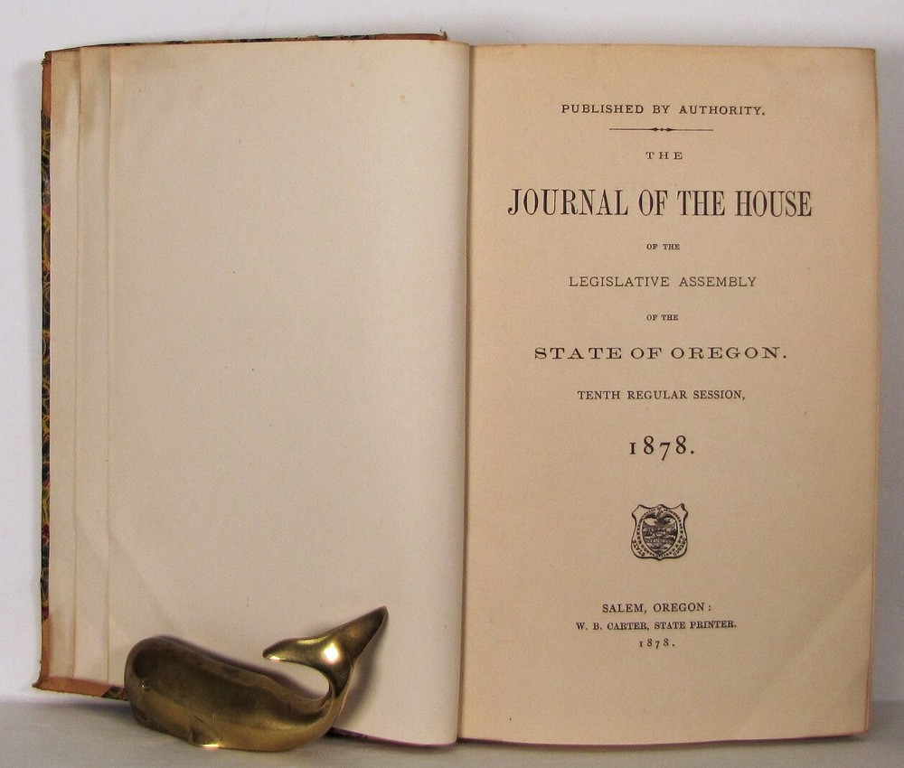 THE JOURNAL OF THE HOUSE OF THE LEGISLATIVE ASSEMBLY OF THE STATE OF OREGON. TENTH REGULAR SESSION, 1878. W. B. CARTER, STATE PRINTER., SALEM, OREGON, 1878. Half leather with green and red marbled boards. Some mild wear and soil stains to the cover. Secure binding with clean pages. About 8-1/2 x 5-1/2 with 745 pp., plus 59 pp. index. Rare!