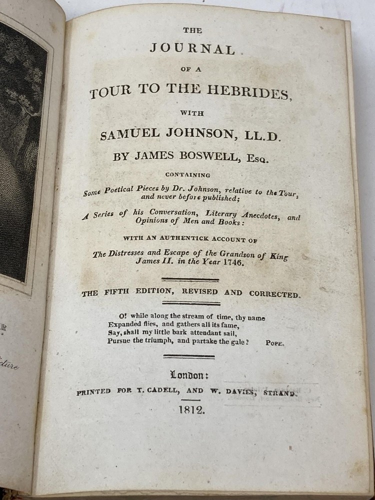 THE JOURNAL OF A TOUR TO THE HEBRIDES WITH SAMUEL JOHNSON, LL.D.; Containing Some Poetical Pieces by Dr. Johnson, relative to the Tour, and never before published; A Series of his Conversation, Literary Anecdotes, and Opinions of Men and Books: with an Authentick Account of The Distresses and Escape of the Grandson of King James II, in the Year 1746 Author: Boswell, James Title: THE JOURNAL OF A TOUR TO THE HEBRIDES WITH SAMUEL JOHNSON, LL.D.; Containing Some Poetical Pieces by Dr. Johnson, relative to the Tour, and never before published; A Series of his Conversation, Literary Anecdotes, and Opinions of Men and Books: with an Authentick Account of The Distresses and Escape of the Grandson of King James II, in the Year 1746 Publication: London: T.Cadell and W. Davies, 1812 Edition: Fifth Edition, Revised and Corrected Description: Leather_bound. Small octavo [6 1/2 x 4 inches]. Fifth ediiton, revised and corrected. 454 pages. Frontis engraving of Boswell. Full, diced leather binding, single ruled in gilt, with five raised bands,Front board detached but present, spine and corners chafed, edgewear. Marbled edges. Interior clean. Good. Seller ID: 78920 Aardvark Rare Books Eugene, OR We work hard to make your Bookbuying Experience safe, easy and fun. Aardvark Books is a proud member of the ABAA (Antiquarian Booksellers Association of America) and IOBA, Independent Online Booksellers Association. Ezra is also an accredited and Qualified Appraiser of Books and Manuscripts, with a designation from the ASA (American Society of Appraisers), with considerable Archive experience as well. Shipping All books shipped to US destinations are sent via the US Postal Service. Faster shipping is available, please ask before paying. We will combine shipping on items purchased at the same time in order to help reduce costs. International shipping is also available. Please inquire for a shipping quote before ordering. This listing was created by Bibliopolis.