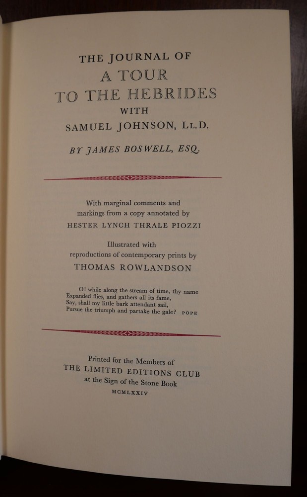 The Journal of A Tour to The Hebrides Author: James Boswell Title: The Journal of A Tour to The Hebrides Publication: Connecticut: The Limited Editions Club, 1974 Description: Half Leather/Marbled Boards. #1823/2000 copies. Measuring approximately 10" x 6.75" with 327 numbered pages. This book is in very good plus condition. Minor scuffing to both ends of spine. Gilt lettering on spine full and vivid. Binding is tight and interior pages are bright and clean. Please view the many other rare titles available for purchase at our store. We are always interested in purchasing individual or collections of fine books. Inventory #(O5-77). Seller ID: 6056 Subject: History Ernestoic Books Terms All orders ship within two business days. Standard mail is USPS Media Mail. Expedited and international shipping are also available. We offer combined shipping on multiple orders. All items are guaranteed to be as described or they may be returned within 30 days of receipt for a full refund. This listing was created by Bibliopolis.