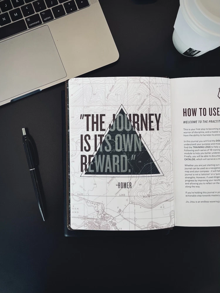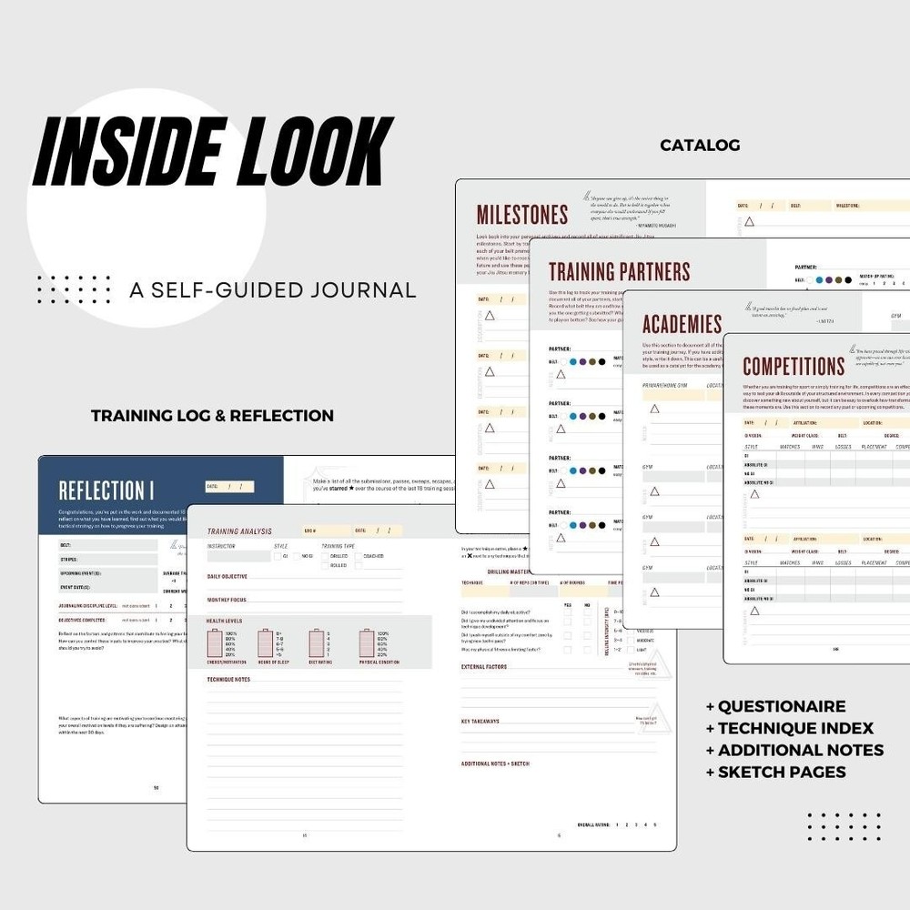 The Practitioner’s Journal | Jiu Jitsu (BJJ) Journal & Training Log The Practitioner’s Journal: A Self-Guided Journal Towards Mastery gives you the structure and system to accelerate your learning. The journal serves as both a map and as a compass; it will provide you with clarity to help you see your long-term goals and will be used as a navigation tool to point you in the right direction. Mastery is not a destination, but rather a journey. Along the path, you will accomplish missions and ultimately discover more about yourself. The journal is designed for the student of the art who is looking to take ownership of the endless wavering process by offering space to document every training session, catalog significant events, and by answering questions to aid in the discovery of your inner-purpose. This journal will cultivate your skills through the use of consistent note taking, creating objectives to keep yourself accountable, and reflecting on successful patterns observed along the way. The Practitioner’s Journal provides space for you to record all of your training sessions and document the techniques you learned in class. It will also provide prompts for you to consider, such as lifestyle factors and training variables that contribute to your overall development, health, and progression. This book consists of 72 unique training logs, along with 4 reflection sections, for you to assess, reflect, and set new objectives for your subsequent training. In search of a gift idea for your partner, parent, sibling, or friend who won't stop talking about jiu jitsu? The Practitioner's Journal is the perfect companion for all Jiu Jitsu enthusiast. _________________________ Product Description: _________________________ Organization & Freedom - The perfect balance of organized note taking structure, with enough freedom to make it your own. Take notes on techniques you learned in class or principles you learned while rolling. Level up your note taking, while simultaneously leveling up your belt faster than ever. Objectives & Focuses - Create daily objectives and long-term focuses to keep yourself accountable and progress beyond what you merely do in class. Retention & Reflection - The act of writing instructions down allows you to imprint the data into your working memory. By reviewing your notes and reflecting on positive trends your progress will be multiplied. Discovery & Catalog - Answer questions to discover your ‘why’ and document the milestones you have accomplished, the academies you have trained at, the partners you have rolled with, and the competitions you have competed at. Student & Master - Made for both a new student or a long-standing master. Whether you are just starting your practice or have over 10 years into your journey, the journal holds true, as a timeless piece of documentation , to see how your Jiu Jitsu training has evolved over time. ______________________ Product Features: ______________________ FUNCTIONAL & PORTABLE Crafted with both functionality and portability in mind. This lightweight, PU leather bound, hardcover journal, is the perfect size (A5). It is sweat resistant and bend proof, with an elastic band to protect your pages so you can comfortably carry your journal in your gym bag without fear of getting it ruined. Sturdy Hardcover PU Cowhide Leather | 120 GSM acid-free white paper | A5 Journal (Trim Size: “5.75 x 8.38”) | 200 pages JIU JITSU MASTERY The journal is designed for the student of the art who is looking to take ownership of the endless wavering process by offering space to document every training session, catalog significant events, and answer questions to aid in the discovery of your inner-purpose. This journal will cultivate your Jiu Jitsu skills through the use of consistent note taking, creating objectives to keep yourself accountable, and reflecting on successful patterns you observe along the way. Whether you are a white, blue, purple, brown, or black belt - mastery is process that one must embark on. TRAINING LOG & REFLECTION The Practitioner’s Journal provides space for you to record all of your training sessions and document the techniques you have learned in class. It will also provide prompts for you to consider, such as lifestyle factors and training variables that contribute to your overall development, health, and progression. This journal consists of 72 unique training logs, along with 4 reflection sections for you to assess, reflect, and set new objectives for your subsequent training. PERFECT GIFT IDEA If you’ve grappled with ideas of what to get your [significant other | students | best friend | training partner | child | father or mother | boyfriend or girlfriend], The Practitioner’s Journal is the perfect gift idea. Its quality and visual aesthetic alone will supersede any expectations they have. It's the ideal gift / holiday present for any jiu jitsu fanatic! SHOP Get The Practitioner’s Journal today to start taking ownership of the process.