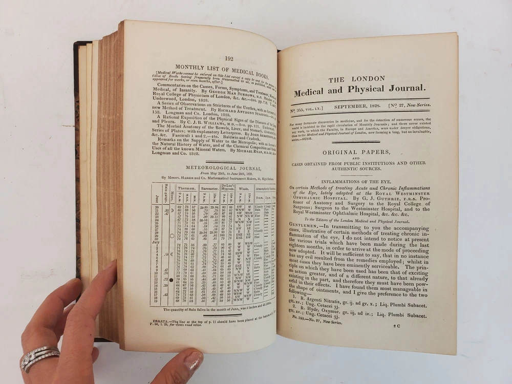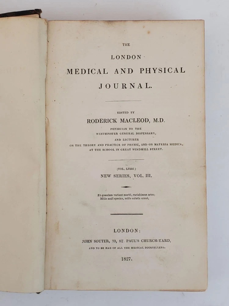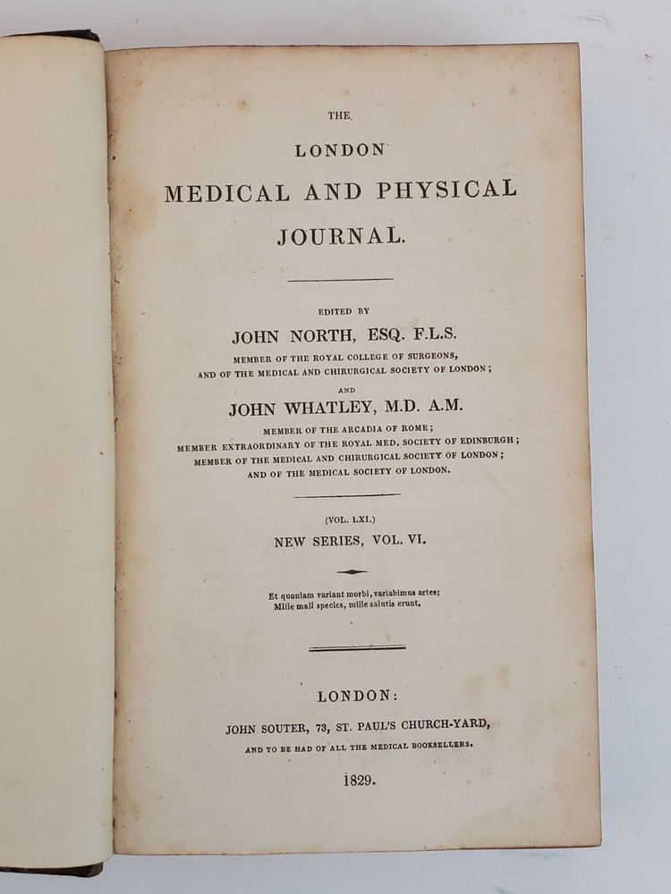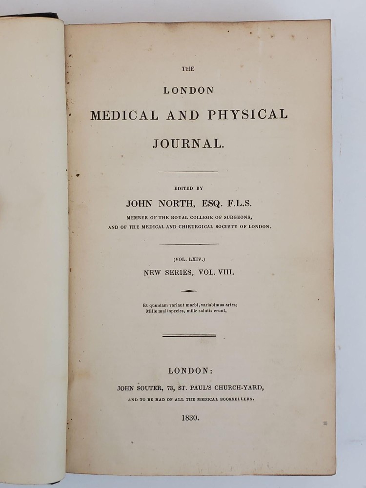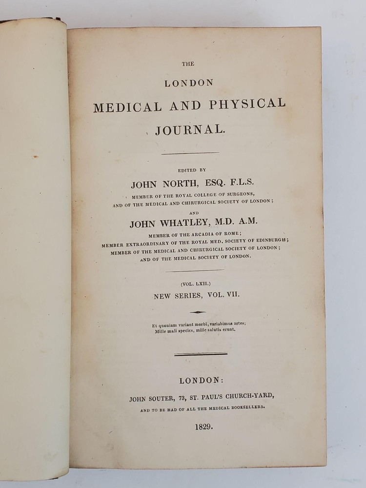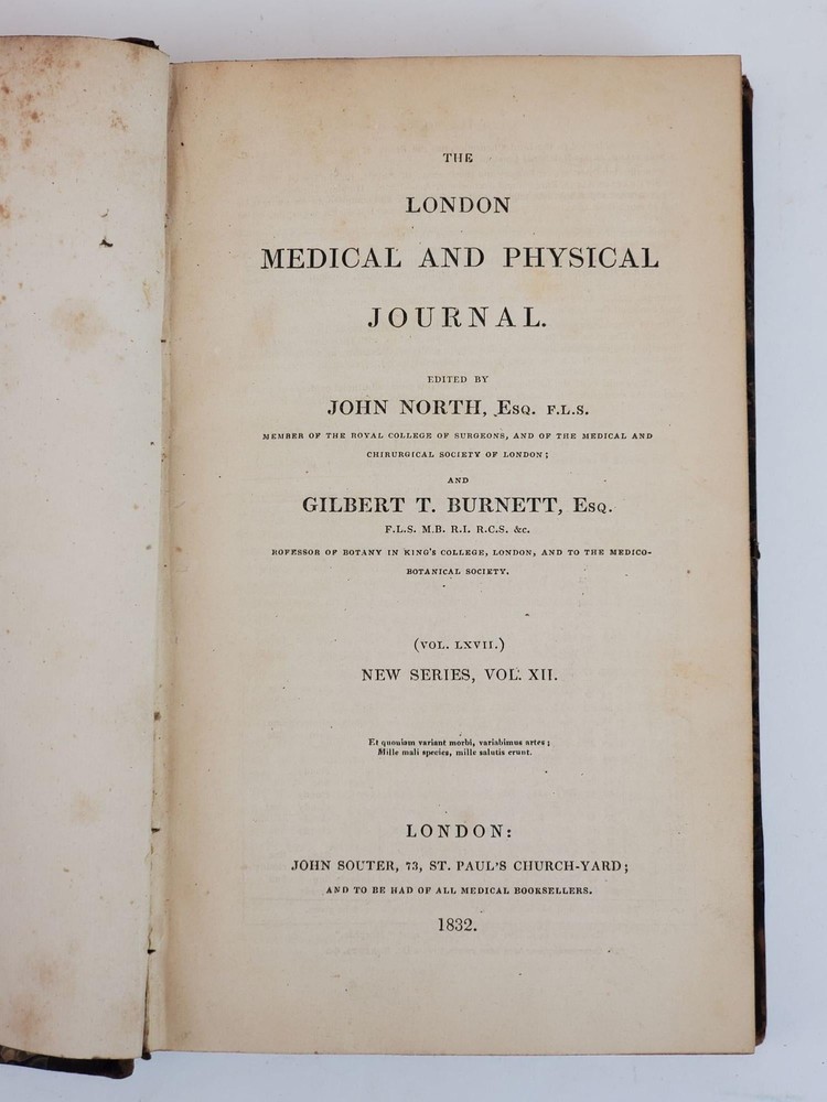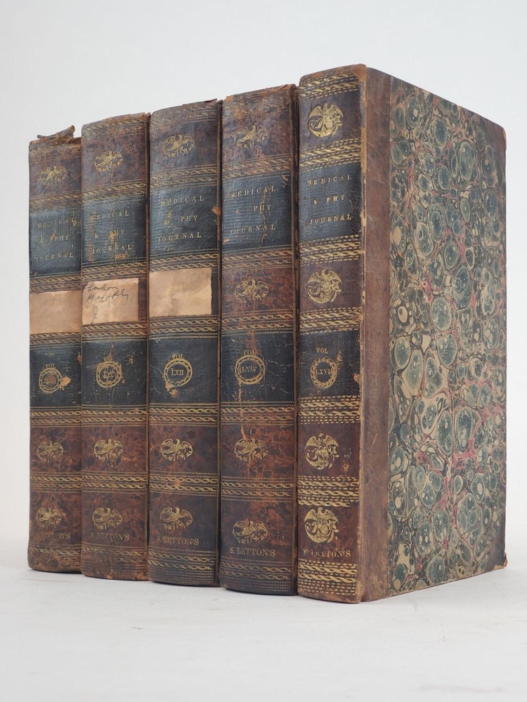 THE LONDON MEDICAL AND PHYSICAL JOURNAL [VOLUMES 58, 61, 62, 64, 67 ONLY] Author: North, John; Burnett, Gilbert T.; Macleod, Roderick; Whatley, John [Editors] Title: THE LONDON MEDICAL AND PHYSICAL JOURNAL [VOLUMES 58, 61, 62, 64, 67 ONLY] Publication: London: John Souter, 1827; 1829; 1830; 1832 Description: Octavos, 582 pp (Vol. LVIII); 580 pp (Vol. LXI); 582 pp (Vol. LXII); 582 pp (Vol. LXIV); 532 pp (Vol. LXVII). Good; bound in contemporary marbled paper with 3/4 leather, black labels and extensive gilt decorations to spine, with some areas of discoloration to covers and slight tears and bumping to spine edges and corners; some front hinges slightly compromised but bindings else tight; text blocks age toned but clean, with some top edges uncut; pages clean; previous owner bookplate to inside front pastedowns, "Thos. Forrest Betton, M.D.;" MF consignment. NOTES Volume LVIII [New Series Vol. III] 1827 Volume LXI [New Series Vol. VI] 1829 Volume LXII [New Series Vol. VII] 1829 Volume LXIV [New Series Vol. VIII] 1830 Volume LXVII [New Series Vol. XII] 1832 Seller ID: 1359713 Subject: Health & Medicine Welcome to the eBay store of Second Story Books! We specialize in out-of-print, used and rare books in all subjects, in addition to art, ephemera, collectibles and more. Any questions or comments are welcome. This listing was created by Bibliopolis.