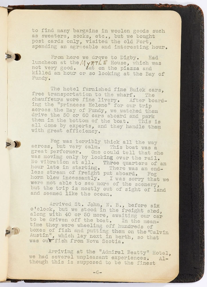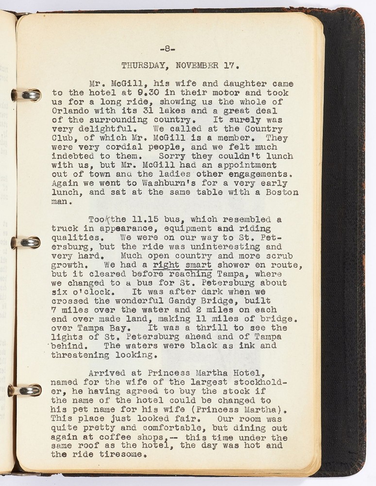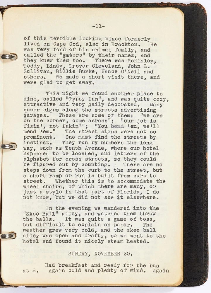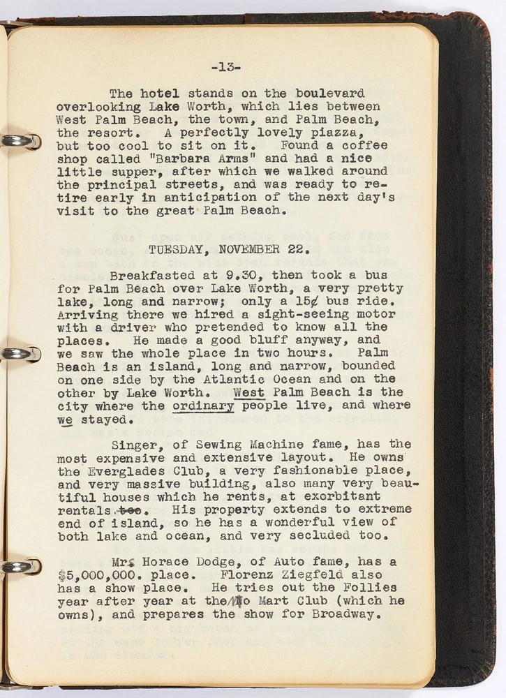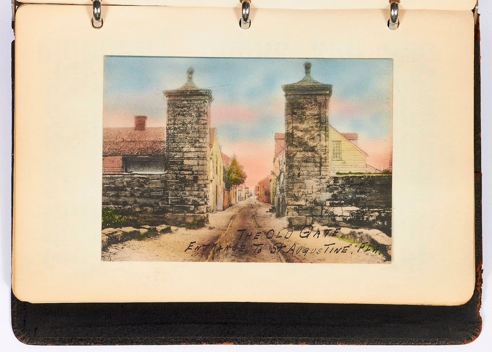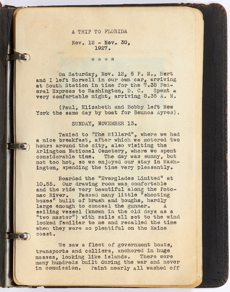 [Journal]: Woman's Typed Travel Journal to the Northeast and Florida from 1927-1930 Title: [Journal]: Woman's Typed Travel Journal to the Northeast and Florida from 1927-1930 Publication: Boston, Massachusetts / Florida / Rhode Island / New York / New Jersey/ Pennsylvania / Canada Description: Softcover. Typed diary of approximately 27,000 words. Octavo. 104pp. Ring-bound brown leather flexible boards. Includes 25 postcards. Leather is worn with tears else very good and internally near fine with clear typed entries. The travel account of Anna, a young woman from Boston, Massachusetts, detailing her adventures with her presumed husband, Bert, on a trip to Florida and around the Northeast of the United States. Each entry documents the location, day, and physical characteristics of each place Anna visits. Her diary starts in the fall of 1927 visiting St. Petersburg, Tampa, Lakeland, Miami, Daytona Beach, and other cities in Florida. She expresses a discomfort with the heat and the state of the ships, hotels, and cities she visits, often calling them "under-developed" or "of poor quality." She places a heavy focus on the negative aspects of the newly developing South and writes in the language that reflects that time period: "We motored two hours, seeing the whole of the city, many dirty negroes, and all the lame, lazy and blind people in which Jacksonville seemed to excel." Though Anna has distaste for the inhabitants' less-than-lavish lifestyle, she herself is not affluent: "West Palm Beach is the city where the ordinary people live, and where we stayed." However, Anna still makes quick assumptions about people in her journal: "We soon decided there were very few real well people in this city." Her next entry is for a trip in the spring of 1927 titled: "A 1029 Mile Auto Trip in 10 Days." She visits Providence, Rhode Island; Peekskill, New York; Newark and Montclair, New Jersey; Philadelphia, Pennsylvania; and other locations in the Northeast. The entries are short but descriptive of each location. The last trip documented in the travel journal is of Anna and Bert's trip to New Brunswick and Nova Scotia, Canada in 1930. Anna writes about each town they arrive at and with her personal reviews of the hotels and inns where she stayed. She writes about the cleanliness and smell of the hotels but little else. There are illustrated and hand colored postcards affixed to the pages of the journal depicting each location Anna and Bert visited. An intriguing account of a young woman traveling around the United States with her husband during the late 1920s. Seller ID: 417336 Subject: Travel Books Between the Covers Between the Covers has been selling books for more than 30 years. Today we offer a wide ranging inventory, from Modern First Editions to General Used Books to Rare Archival Collections. We are active members of the Antiquarian Booksellers' Association of America (ABAA) and the International League of Antiquarian Booksellers (ILAB) . Terms All orders ship within two business days. Standard mail is USPS Media Mail. Expedited and international shipping are also available. We offer combined shipping on multiple orders. All books are guaranteed to be as described or they may be returned within 30 days of receipt for a full refund. This listing was created by Bibliopolis.