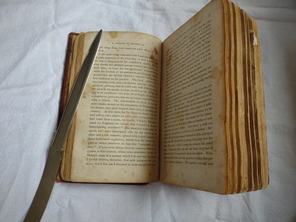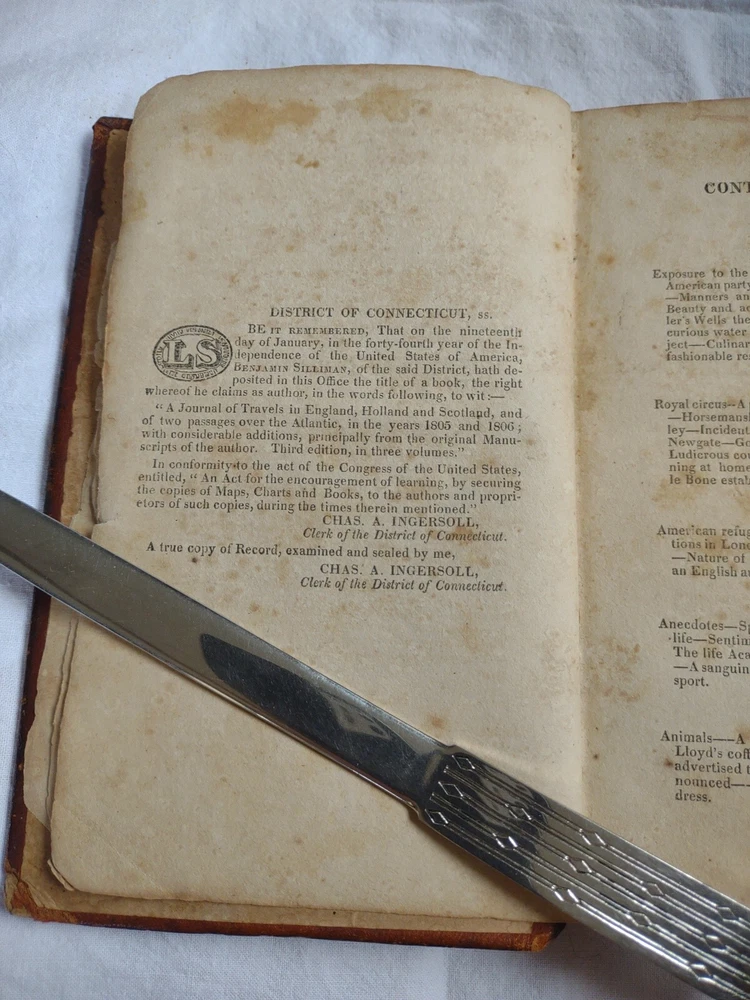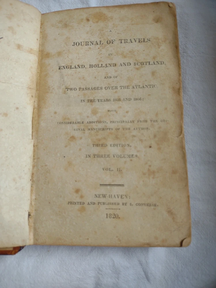 Author: Benjamin Silliman Publisher: S Converse Release Date: 1820 Cover and back is attached. Pages are actually tight. Foxing through out. Notes: Journal of Travels in England Holland and Scotland and of Two Passages over the Atlantic in the years 1805 and 1806 volume II by Benjamin Silliman. Part of 3 volume set, this volumes includes 2 fold out engraved plan of Stonehenge. Published in New Haven 1820.Pages show toning, fold out engraving complete , binding solid, foxing, book is holding together but was well read and rough.