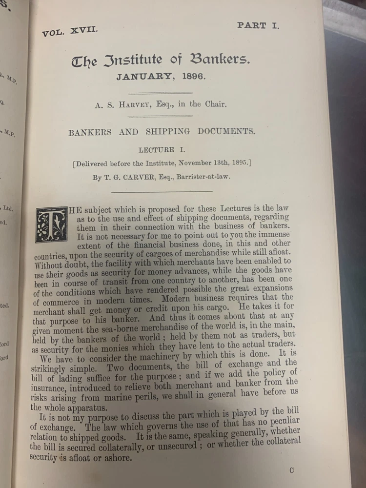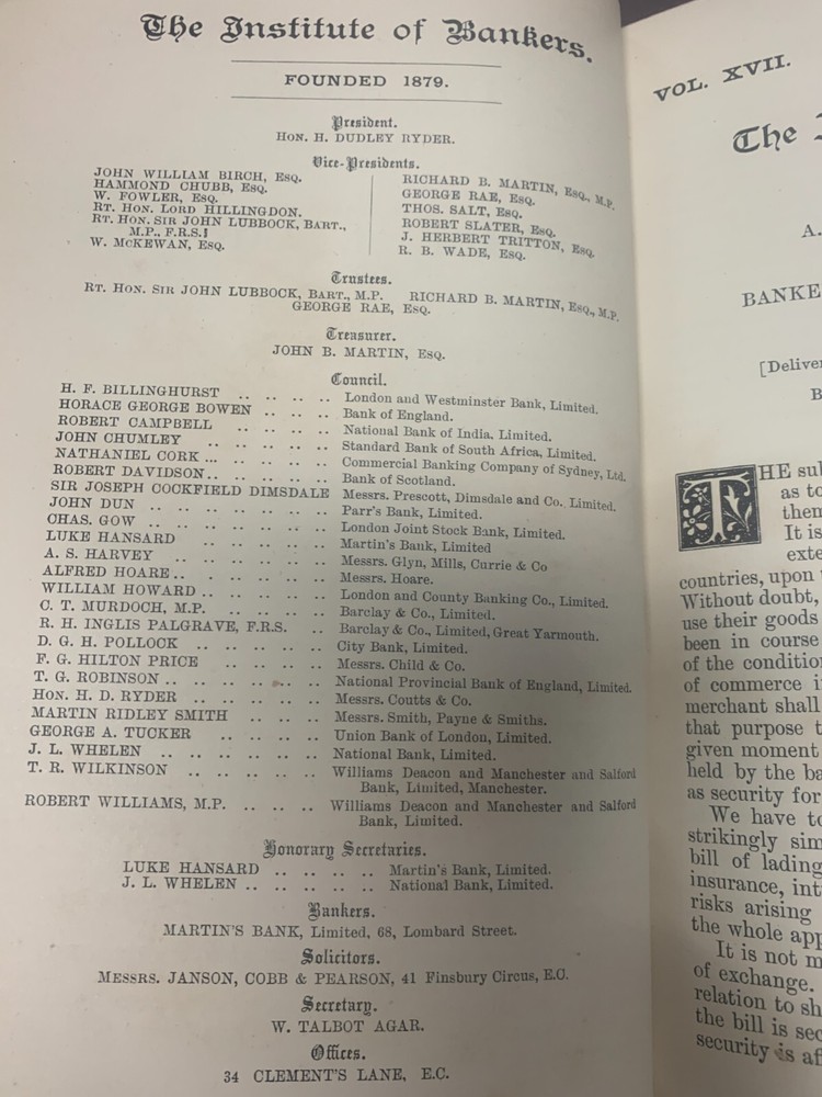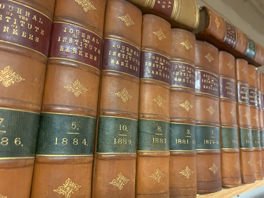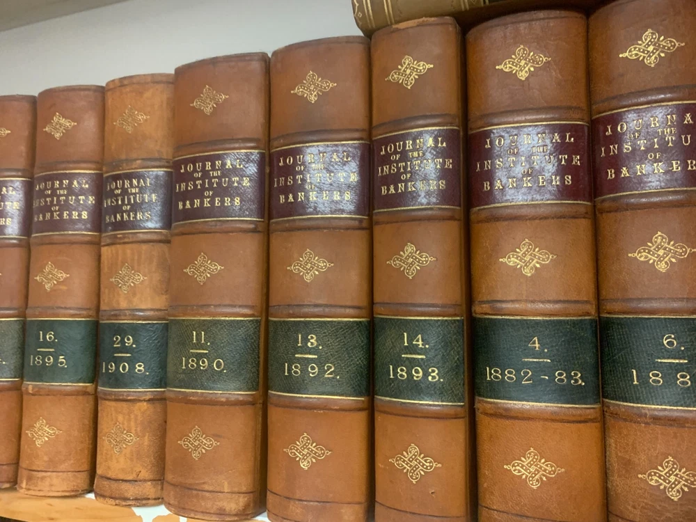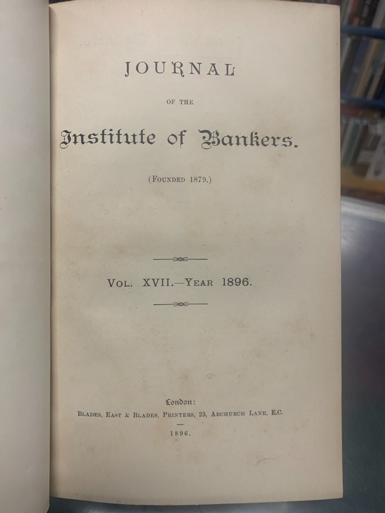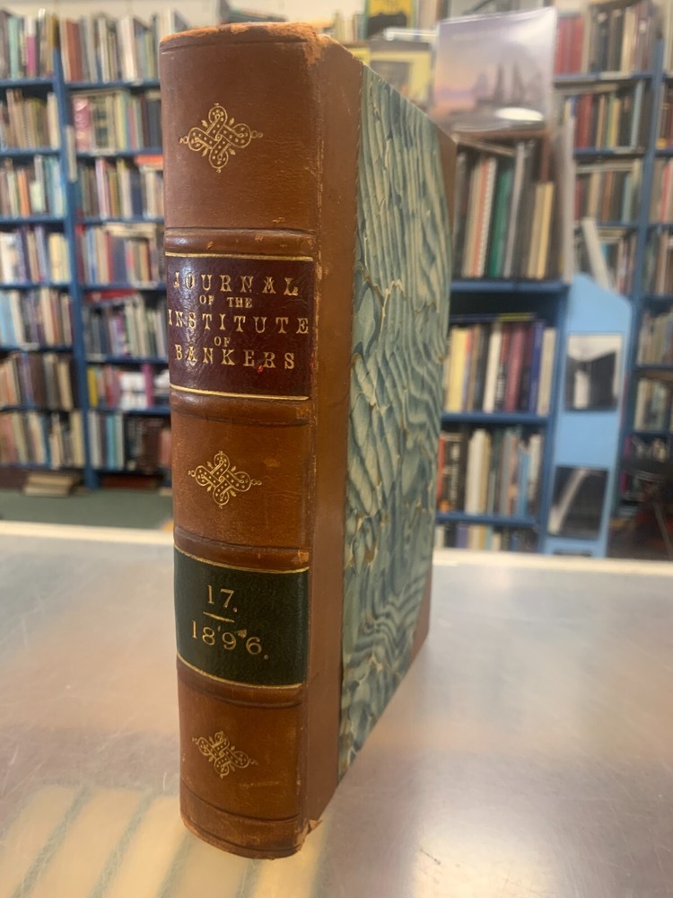 JOURNAL OF THE INSTITUTE OF BANKERS VOL. 1-33 PLUS INDEX TO VOL. 1-15 Blades, East and Blades, London 1879-1912. 33 volumes continuous plus Index to v. 1-15, 12mo gilt-decorated three-quarter tobacco calf, raised bands, red and black leather spine labels, marbled paper over boards, 1st ed., clean and sound, VG+. Bound issues.