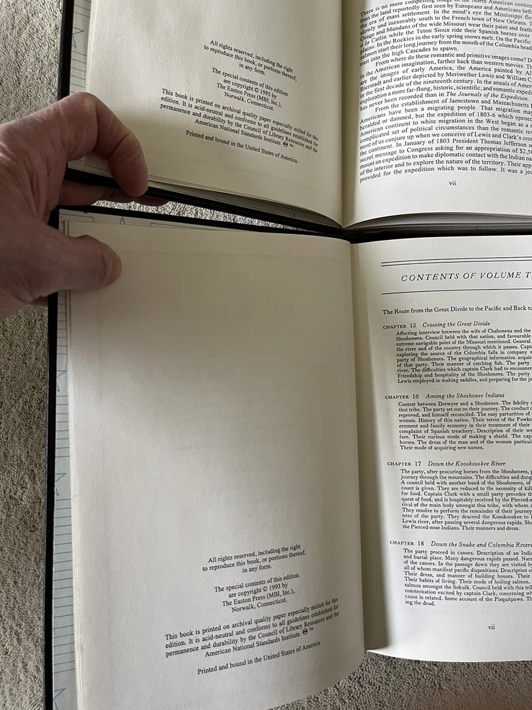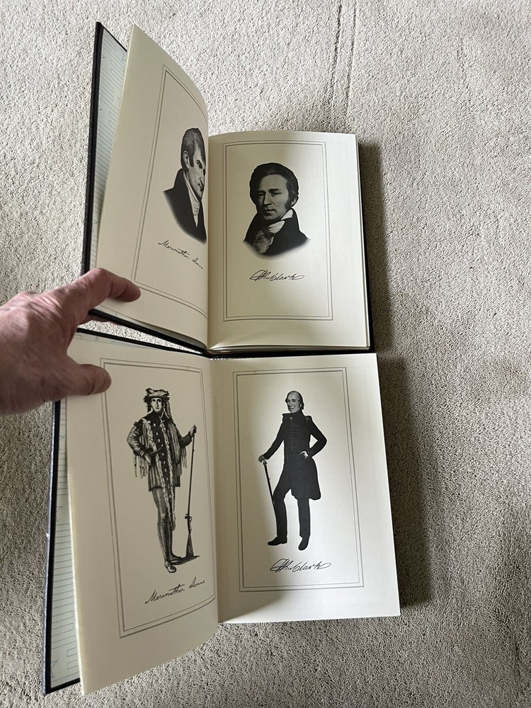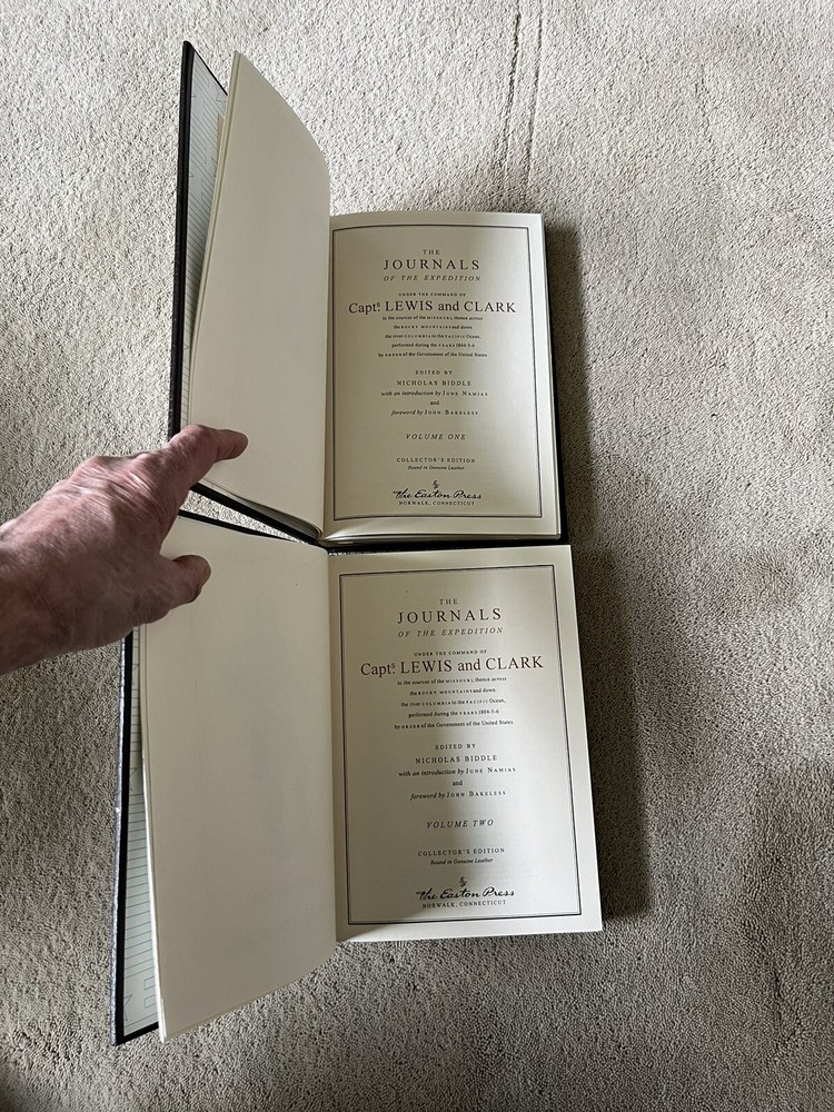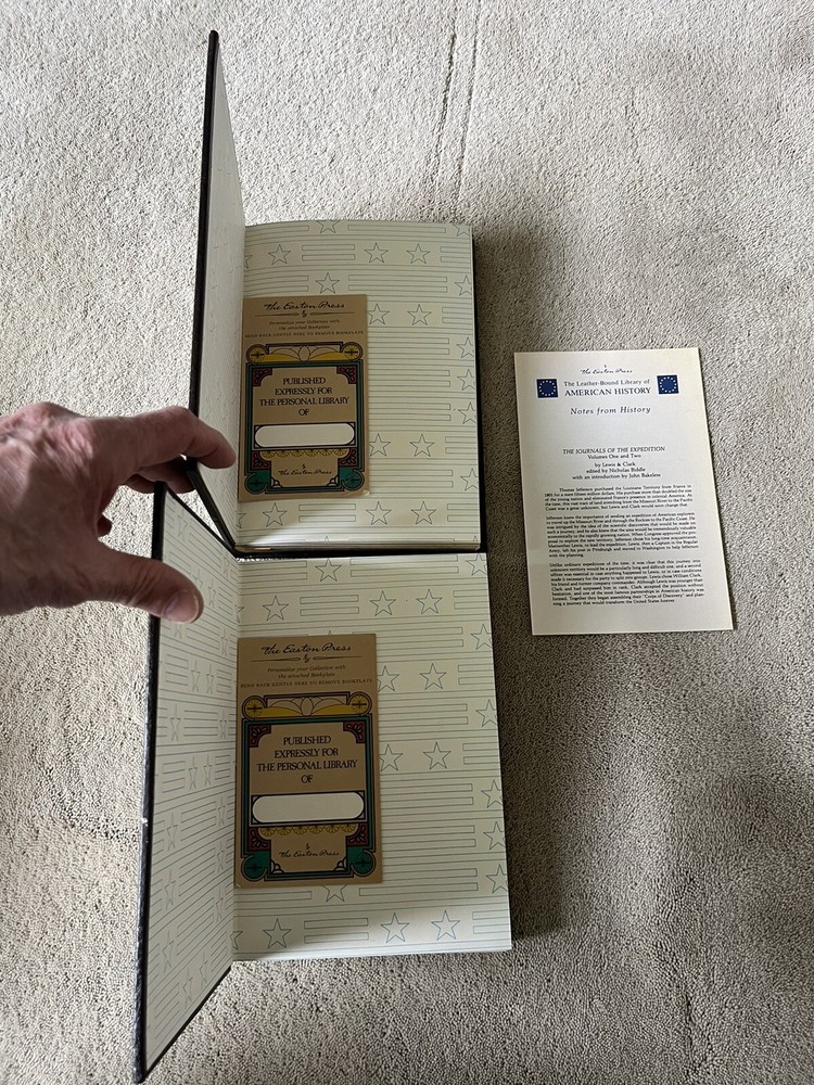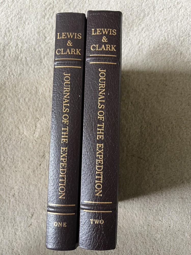 The Journals of the Expedition Under the Command of Capts. Lewis and Clark (2 Volume Set). Easton Press 1993. Collector's Edition. Publisher's insert laid in. Leather Bound. Printed on archival paper with gilded edges. The endsheets are of moire fabric with a silk ribbon page marker. Smyth sewing and concealed muslin joints to ensure the highest quality binding. This book is in full leather with hubbed spines. First Easton Press Edition.