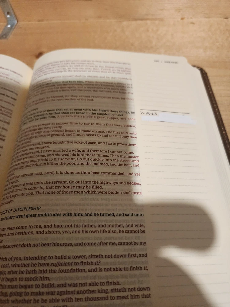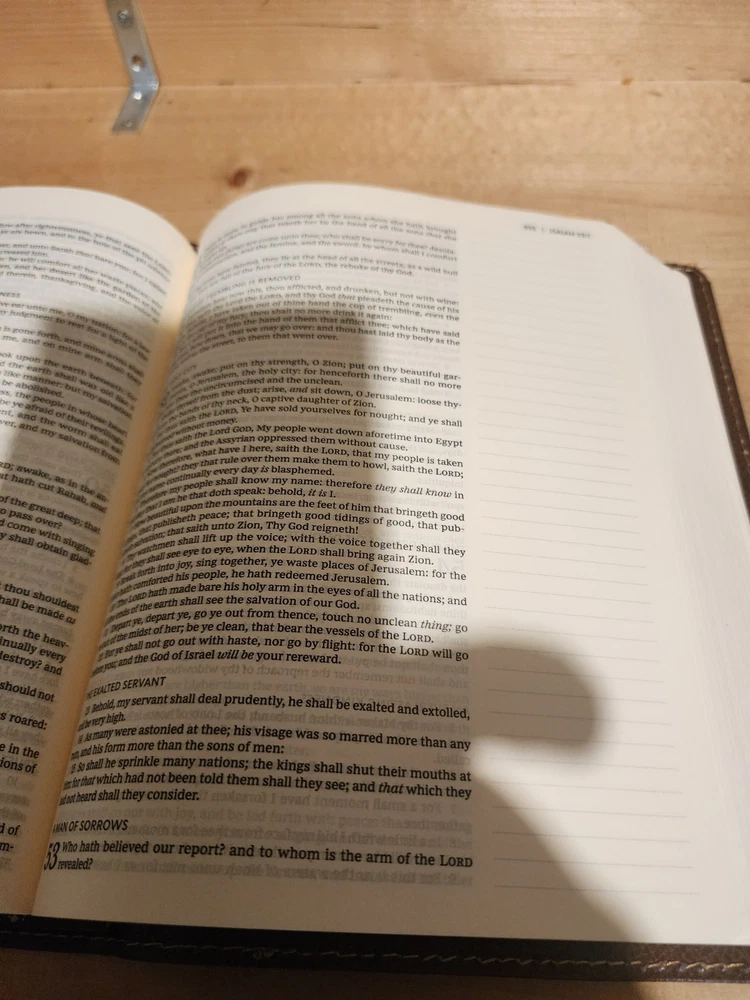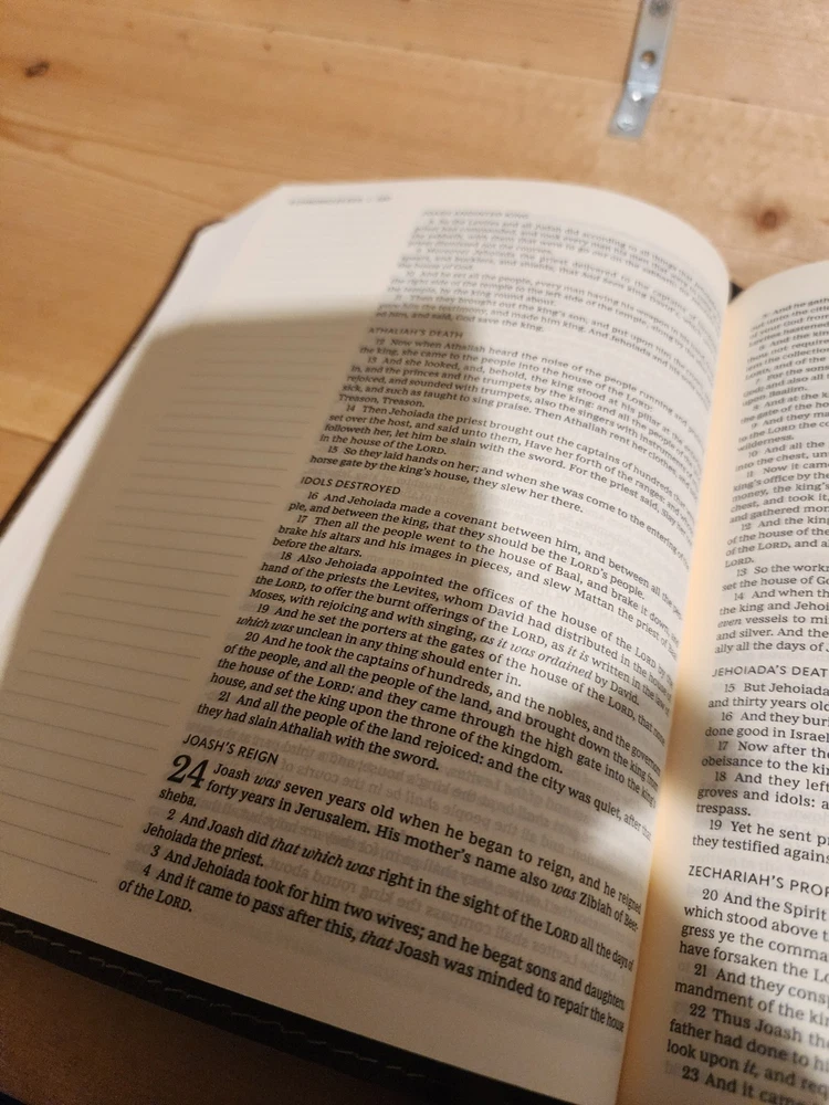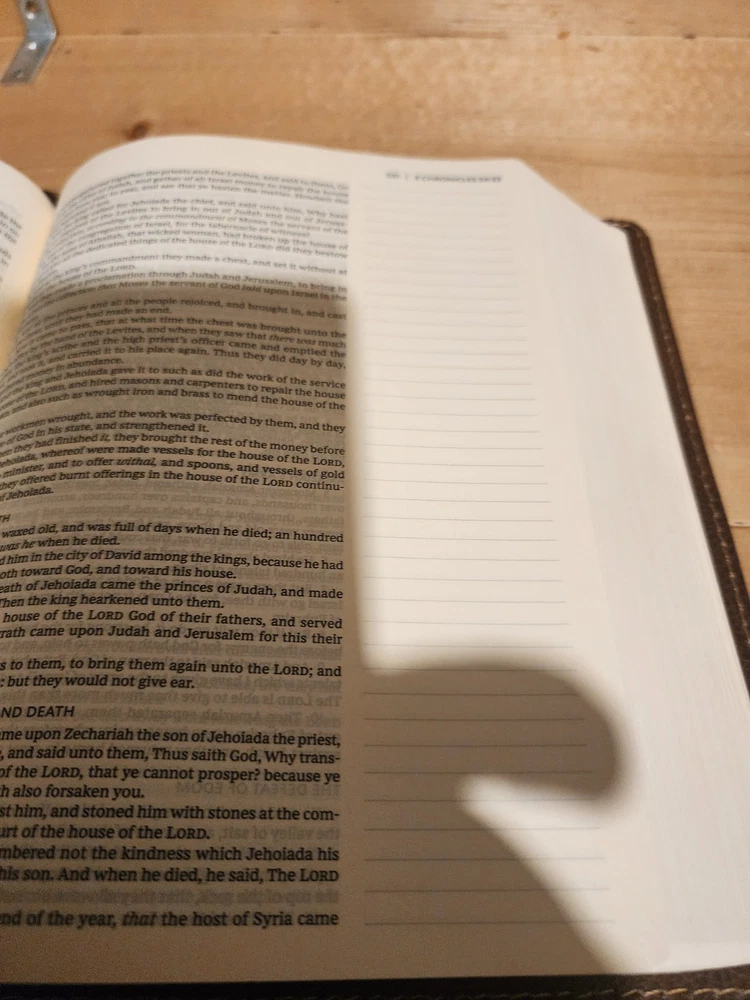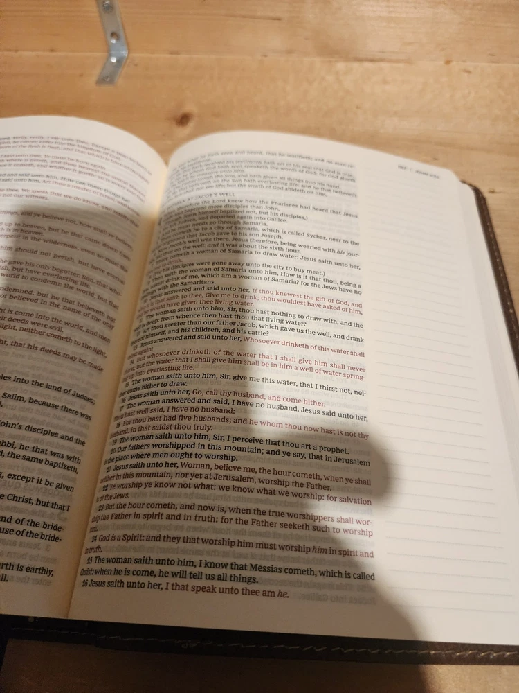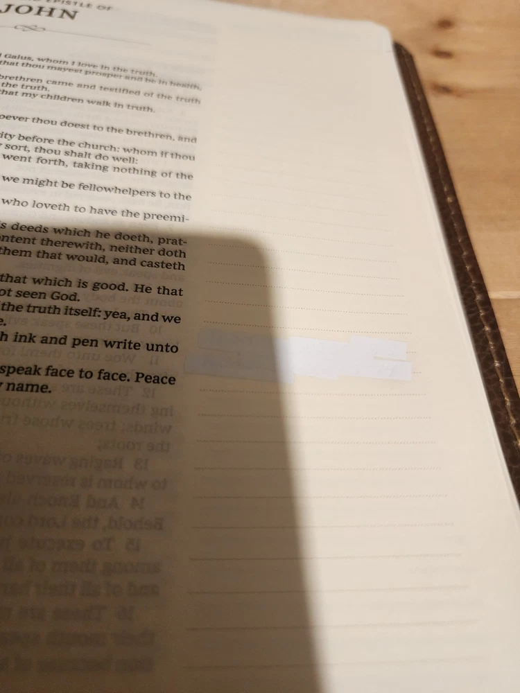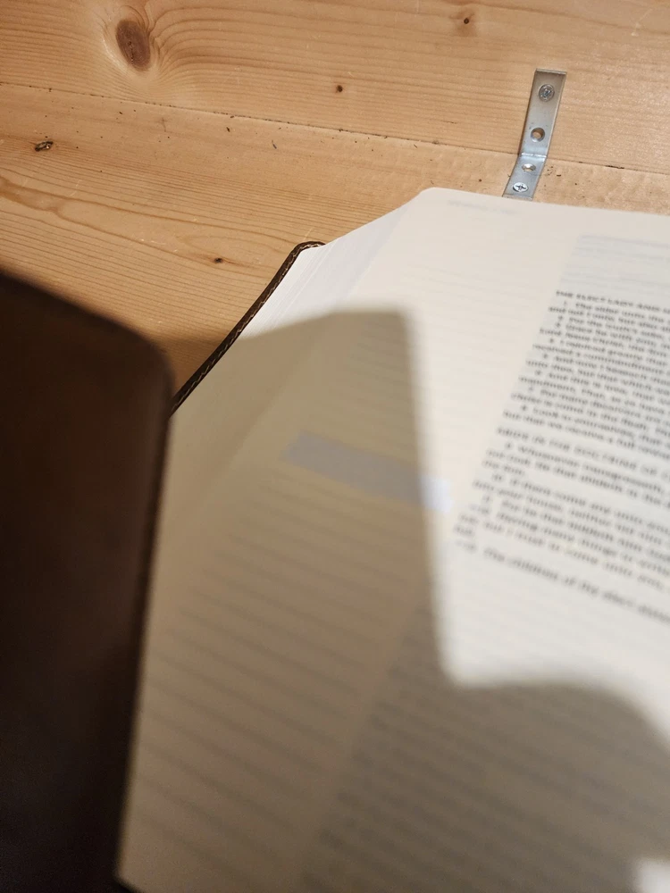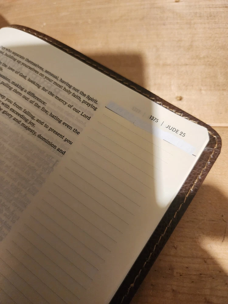 The Bible was in good condition. It appeared the Bible was a little musty being stored away perhaps with some moisture. A couple of pages in Ecclesiastes were damaged at bottom corners likely due to printing problems. One of the gold index tabs for Sol., Isa. and Jer. was misplaced on a Bible page. But overall the Bible was described as seller said. I think the price was $ 15.00 over. But I chose to buy it. Seller was honest and nice. I purchased nicer copy for $ 15.00 less from another buyer.