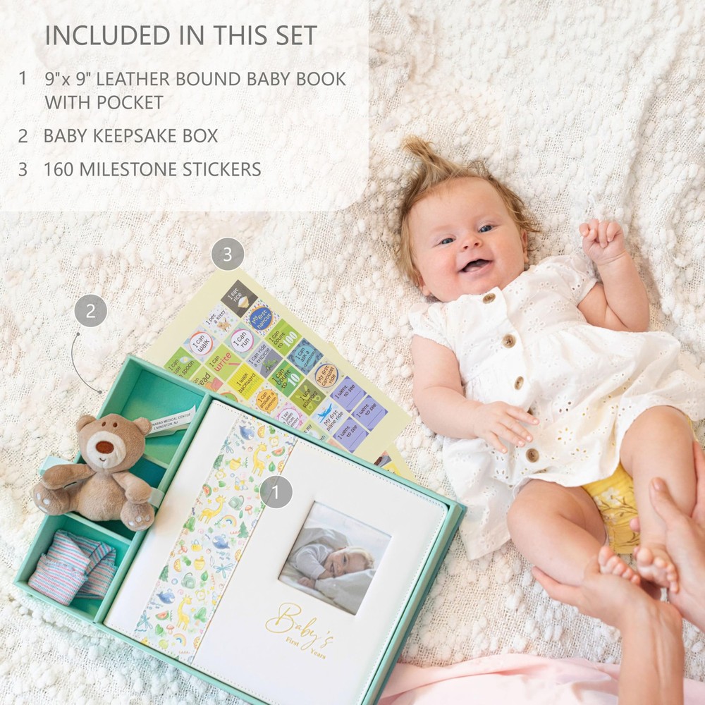 The baby milestone book with keepsake box is a great way to celebrate the beauty of a new life and capture all those precious milestone moments for years to come. The baby first memory book is a unique scrapbooking tool that gives you plenty of space for personal letters, stories, and photographs, as well as physical items such as your baby's drawings, hospital wristband, first tooth, first haircut, favorite small-size toys, and other memorable items your child has enjoyed. The beautifully illustrated baby photo book will guide you through your baby's first 5 years, and also record their firsts and development milestones, from baby shower to their first day of school. You get to pick exactly what goes into your baby’s first journal, and can choose from 160 milestone stickers included in the set; also, you can add / remove pages by using the beautiful gold-style openable rings. The book sections comprise: A Letter to Future You, My Baby; Baby Shower; My Birth Story (the page reserves space for baby hand and footprint); Baby's Hand and Footprints; Average Prices and Top Headlines on the Day You Were Born; My Family Tree; Milestones (monthly for the first 12 months of life and annually for years 2-5); My First Birthday Story; And Now I Have Teeth; My First Words; Holiday Celebrations (no religious or cultural affiliation); My First Day of School; My Funny Quotes; and Advice and Wishes. You can also add additional pages for notes or photos, which are beautifully illustrated in the journal’s style. The Advice and Wishes pages can be used by your family and friends to send good vibes to your baby – use these for baby showers, family gatherings, and more. The durable leather cover will help secure your precious memories for years to come. The baby memory journal has a deep leather keepsake pocket on the back cover of the baby book to store the most precious memorable items that belong to your baby. Faux Leather Baby Book Cover – Durable, attractive 9" x 9" leather-bound baby album and memory book, baby scrapbook for boys and girls; 94 pages to keep your precious memories, from baby shower up to age 5. Loose-Leaf Openable Rings - Add your boy or girl's drawings, letters, and winners certificates. Consider adding extra pages to your baby photo album for notes and photos illustrated in the baby journal’s style. A beautiful baby diary and baby book childhood journal and baby 1st year memory book with keepsake box. Deep Keepsake Pocket - Beautiful baby 1st year memory book and a shower gift with a deep keepsake leather envelope to store baby's hospital bracelet and other memorable items. Save what is most important to you and baby – the baby memory box set is a unique tool that gives you plenty of space for baby’s drawings, letters, prize certificates, as well as other items such as hospital wristband, first tooth, first haircut, favorite clothes and toys, and other memorable items. The Set Includes – Leather-bound loose-leaf baby book for memories from baby shower to age 5 (9” X 9” in size, 94 pages), keepsake box, and 160 milestone stickers (1” X 1”). Extra pages for your notes and photos can be added to the baby book using beautiful silver-style openable rings. Inclusive and Thoughtful Gift - The baby gift set is intended for all family types; the gender-neutral format can accommodate any photo size / orientation, all holidays, and any religious / cultural affiliation. Your baby is as little as they will ever be. This set will become a key baby essential for you and help secure your precious memories for years to come. Baby girl boy memory book first 5 years.
