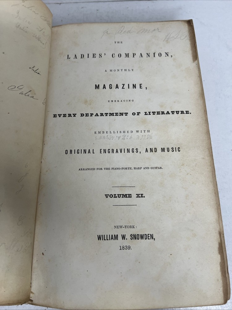Discover the charm of 19th-century women's literature with the "LADIES' COMPANION Vol XI 1839 Illustrated." This antique bound periodical, published by William W Snowden, offers a unique glimpse into the past with its richly illustrated pages. It stands as a testament to the enduring allure of periodicals that cater to women's interests, capturing the essence of a bygone era. The leather-bound volume is a treasure for collectors and enthusiasts alike, with its original pages preserved from the year 1839. It's not just a piece of history but a testament to the craftsmanship of NY's publishing heritage. Delve into this illustrated treasure and own a piece of literary legacy.