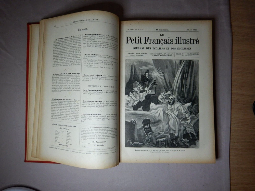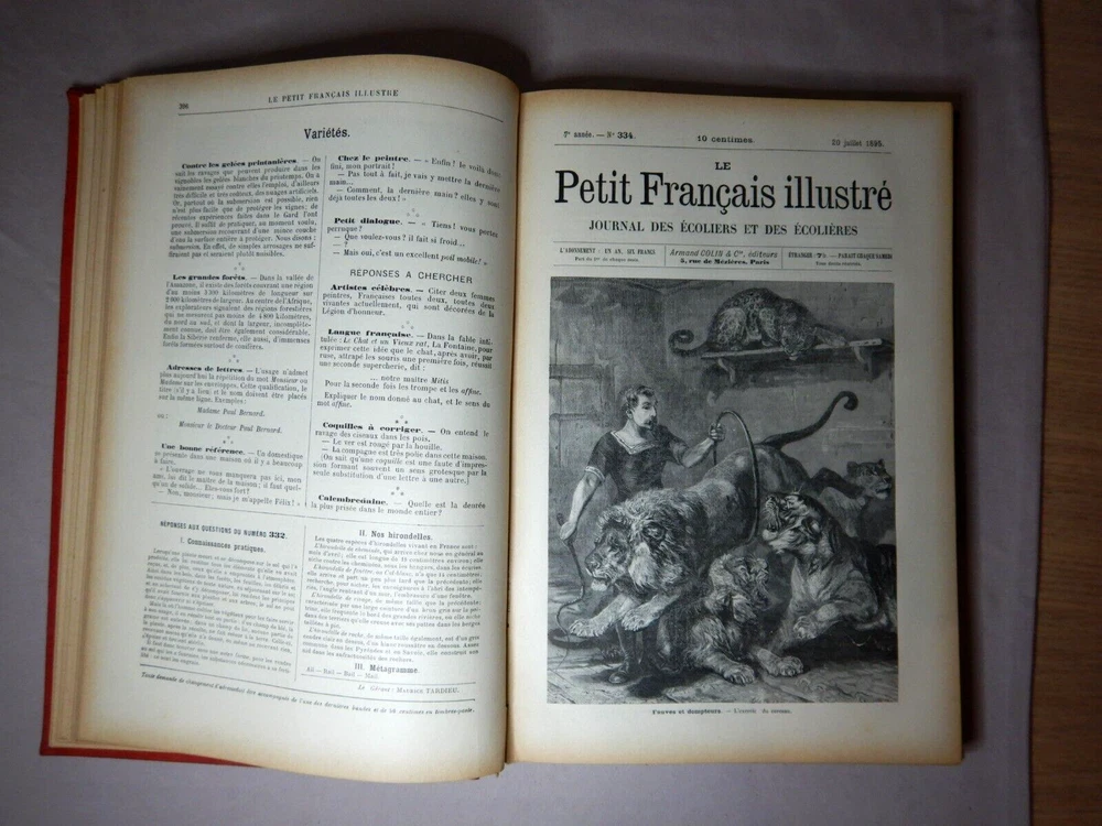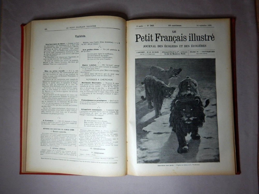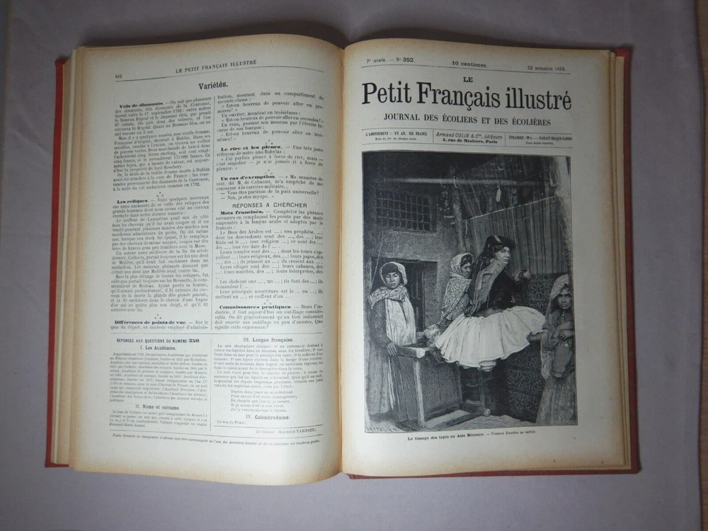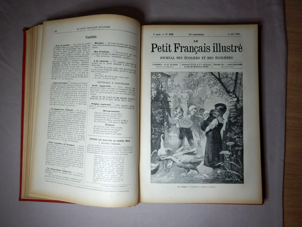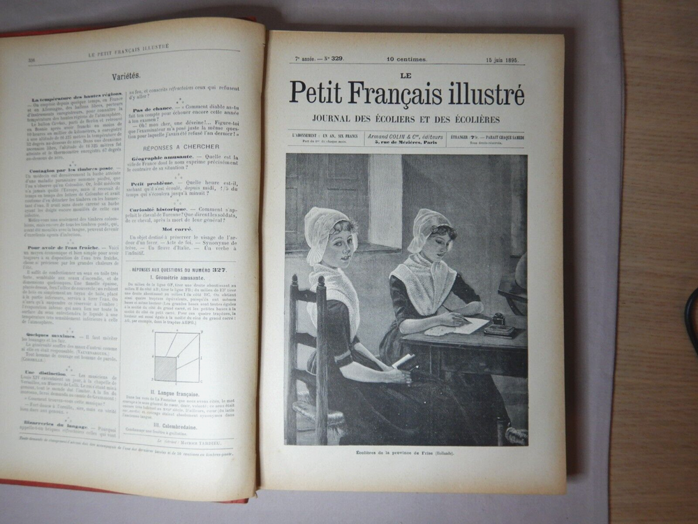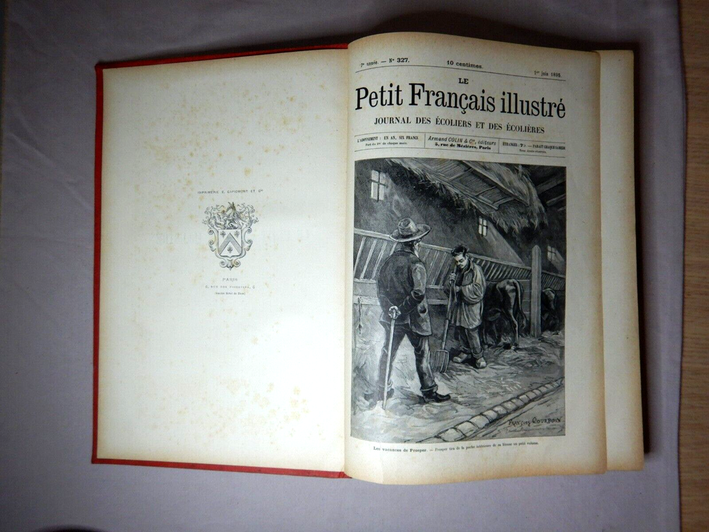 LE PETIT FRANCAIS ILLUSTRE JOURNAL DES ECOLIERS ET DES ECOLIERES 1895 ARMAND COLIN ET CIE EDITEURS LEATHER BOUND COMPLETE ANNUAL FOR 1895 SIZE: 28cm x 19.5cm x 2.5cm A VERY HEAVY BOOK IN GOOD USED CONDITION WITH AGE DISCOLORATION AND MINOR MARKS FROM USE I HAVE PHOTOGRAPED A NUMBER OF THE IMAGES BUT THERE ARE MANY MORE PLEASE SEE THE PHOTOS