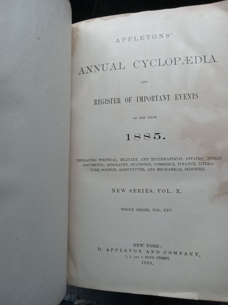 Appleton's Annual Cyclopedia And Register Of Important Events Of The Year 1885 New Series, Vol. X Copyright 1886 Published By D.. Appleton And Company, 1888. Embracing Political, Military, And Ecclestatical Affairs; Public Documents; Biography, Statistics, Commerce, Finance, Literature, Science, Agriculture, And Mechanical Industry. There Is Wear As Seen In The Photos, Otherwise In Decent Condition. Please See Pictures Provided For The Condition Of The Book.