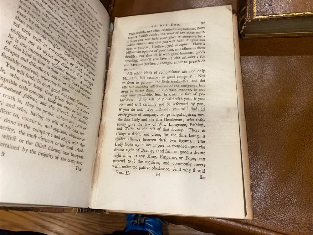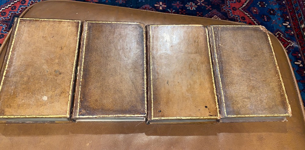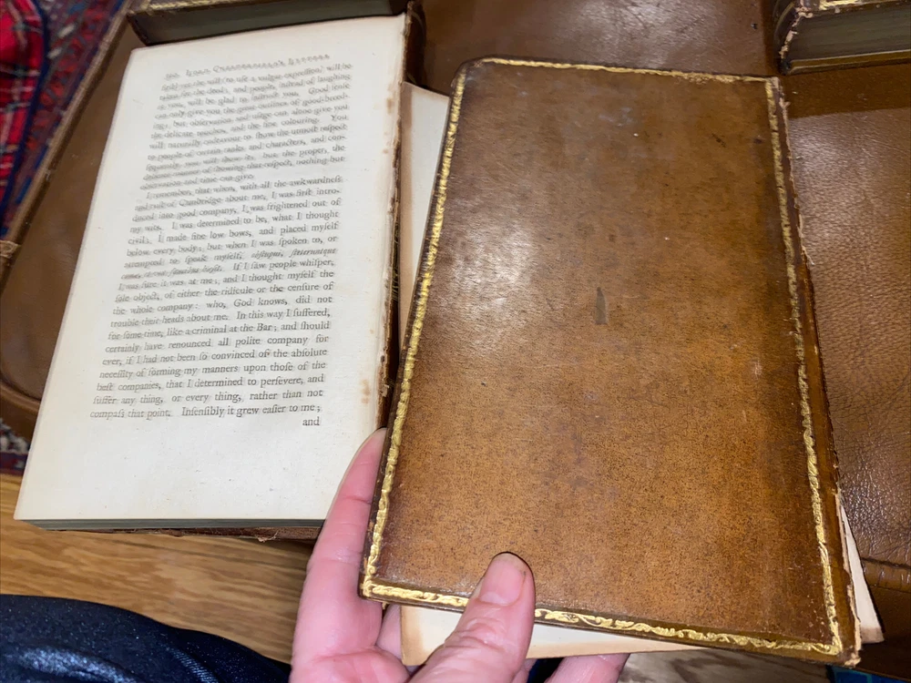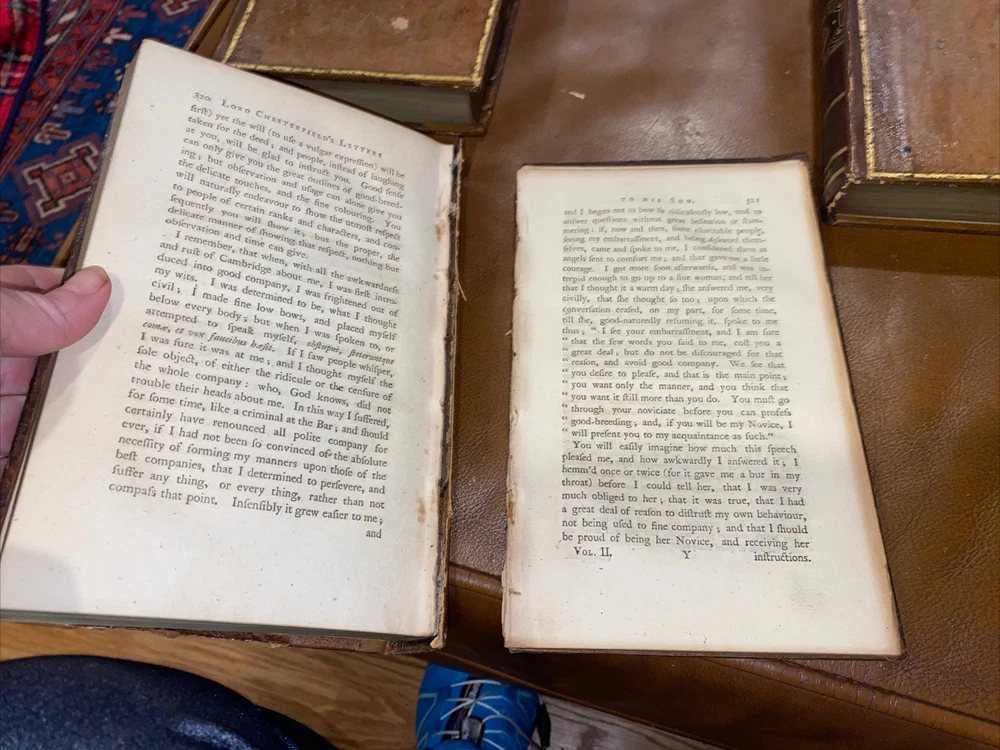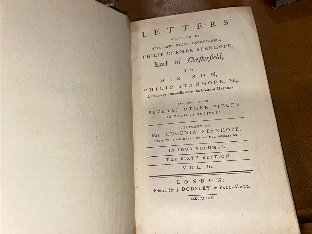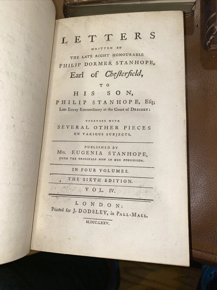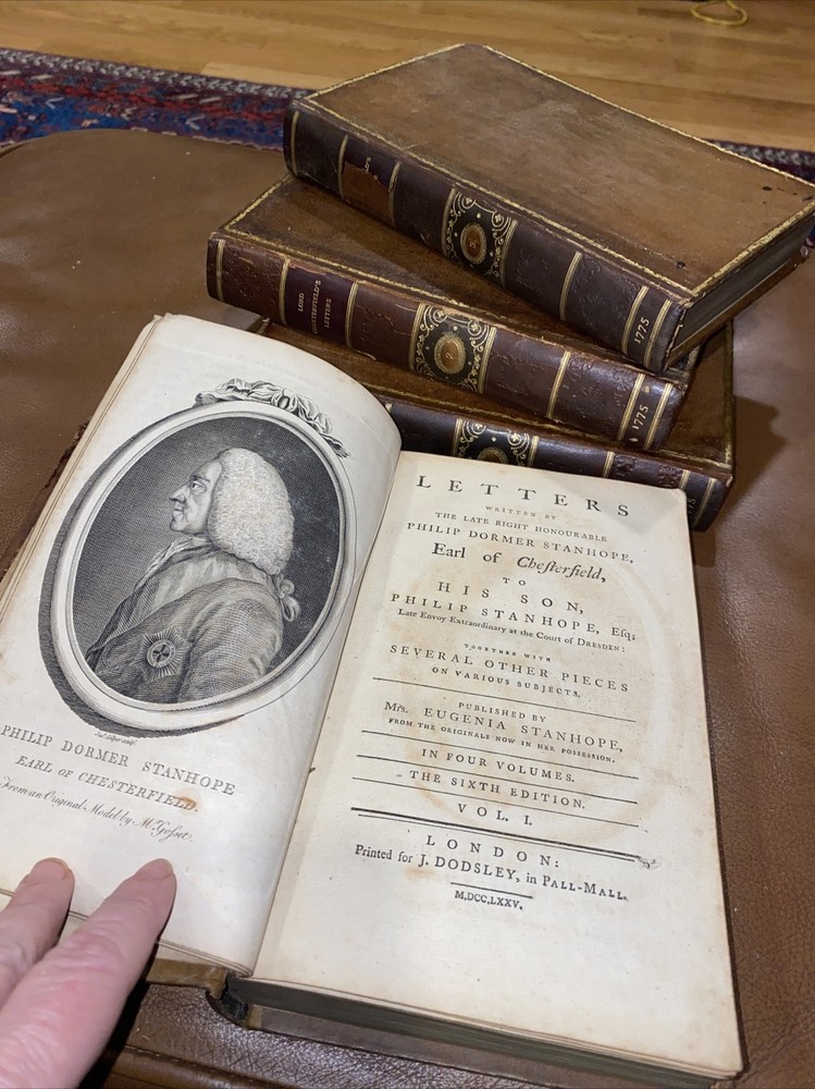Letters written by The late Philip Dormer Stanhope Philip Dormer Stanhope Earl of Chesterfield: To his son Philip Stanhope Esquire late envoy extraordinary at the court of Dresden Together with other pieces on various subjects Published by Regina Stanhope from the originals no in her possession Sixth edition In 4 Volumes (complete set). London: printed for J Dodsey in Pall Mall 1775 Hardcover / Original 18th century full calf with gold gilt design & lettering on original spine pieces - with date on spines 175 HISTORIC — RARE — HARD TO FIND These additions are in good condition- they have wear to the leather, bumped corners, some soiling. Interiors are clean. Volume 2 binding has become separated (see pics 9 & 10), vol 3 has part of spine title plate missing Volume 1 : 352 pp. Volume 2: 355 pp Volume 3: 376 pp Volume 4: 364 pp Please email me any questions - I have more books by the Earl Thanks ABOUT THE Earl: Philip Dormer Stanhope, 4th Earl of Chesterfield KG PC (22 September 1694—24 March 1773) was a British statesman, and a man of letters and wit. He was born in London to Philip Stanhope, 3rd Earl of Chesterfield, and Lady Elizabeth Savile, and known as Lord Stanhope until the death of his father, in 1726. Educated at Trinity Hall, Cambridge, he subsequently embarked on the Grand Tour of the Continent, to complete his education as a nobleman, by exposure to the cultural legacies of Classical antiquity and the Renaissance, and to become acquainted with his aristocratic counterparts and the polite society of Continental Europe. In the course of his post-graduate tour of Europe, the death of Queen Anne and the accession of King George I (1714) opened a political career for Stanhope, and he returned to England. In the British political spectrum he was a Whig and entered government service, as a courtier to the King, through the mentorship of his relative, James Stanhope, 1st Earl Stanhope, the King's favorite minister, who procured his appointment as Lord of the Bedchamber to the Prince of Wales. He was a selfish, calculating and contemptuous man, not naturally generous, and he practiced dissimulation till it became part of his nature; despite brilliant talents and admirable training, the life of Chesterfield cannot be pronounced a success. His social anxiety and the pains he took to become an orator already had been noticed. Horace Walpole said that he, who had heard the great orators of the time, preferred a speech of Chesterfield to that of any other orator; yet the contemporary opinion was that the Earl of Chesterfield's eloquence did not compare with that of Prime Minister Pitt (the Elder). In that regard, James Boswell reported that the poet Samuel Johnson pointedly said about the nobleman Chesterfield, "This man I thought had been a Lord among wits; but I find he is only a wit among Lords!" As a politician and statesman, his fame rests upon his short, but brilliant, administration of Ireland as Lord Lieutenant of Ireland (1745-46). As a courtier, the unrefined Robert Walpole worsted him at the King's court. Despite being a protector of men of letters, Chesterfield's want of heart and head in the quarrel over the dedication to A Dictionary of the English Language (1755), inspired the poet Johnson to rewrite the line "Toil, envy, Want, the Patron and the Jayl" (The Vanity of Human Wishes [1749], line 160) in a letter bemoaning the conflicts of personality inherent to the patron-artist relation; Johnson rebuked Chesterfield: "is not a Patron, My Lord, one who looks with unconcern on a man struggling in the water and when he has reached ground encumbers him with help?" Moreover, on publication of the book Letters to His Son (1774), Chesterfield's advisory correspondence with his natural son, Philip Stanhope, Johnson said that "they teach the morals of a whore, and the manners of a dancing-master" as means for getting on in the world as a gentleman. The impoverished widow of Chesterfield s illegitimate son, Eugenia Stanhope, was the first to publish the book Letters to His Son on the Art of Becoming a Man of the World and a Gentleman (1774), which comprises a 30-year correspondence in more than four hundred letters begun in 1737, and continuing until the death of his correspondent, Philip Stanhope, in 1768. Chesterfield wrote the greatest volume of letters in the eight-year period 1746-54; and, to refine his son's command of languages, he wrote him letters in French, English, and Latin, mostly instructive communications about geography, history, and classical literature; Chesterfield's later letters, addressed to Philip Stanhope, diplomat, are about politics. As a handbook for worldly success in the 18th century, the Letters to His Son give perceptive and nuanced advice for how a gentleman should interpret the social codes that are manners. LORD CHESTERFIELD'S LETTERS, 1775 4 Volume Set Fine Binding Leather Illustrated. Shipped with USPS Media Mail.