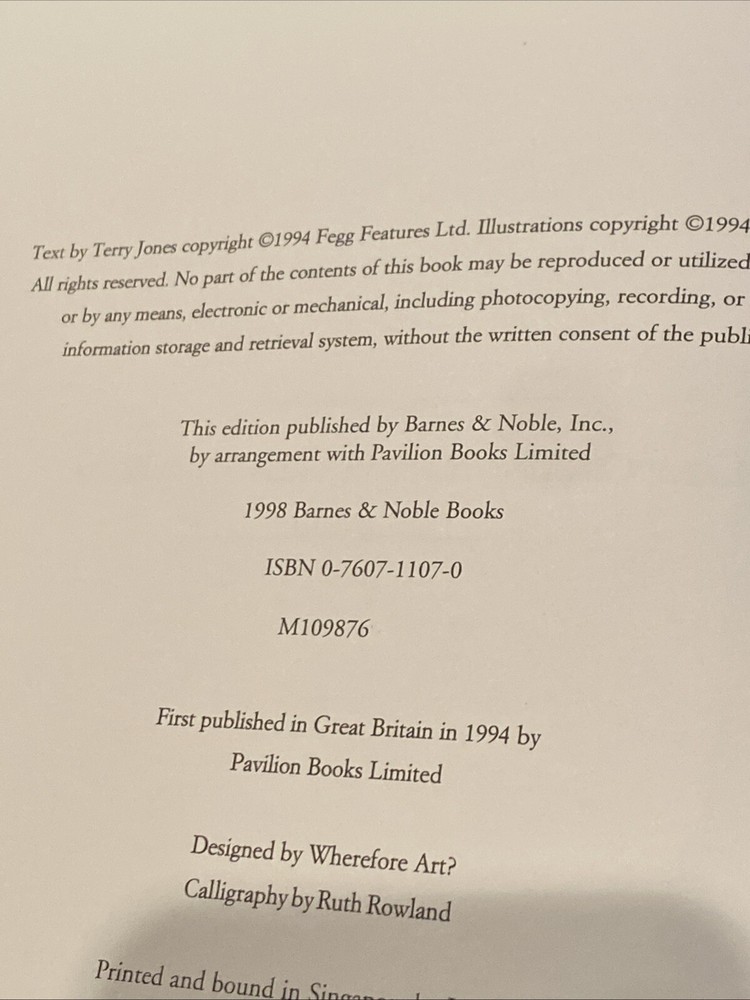 The product is "Lady Cottington's Pressed Fairy Book" by Terry Jones, published in 1998 by Barnes & Noble. This whimsical illustrated journal features the work of artist Brian Froud, known for his intricate and fantastical illustrations. The book explores the topic of fairies, blending elements of fairy tales, folklore, mythology, and humor to create a unique and delightful reading experience for fans of popular culture and natural history. The hardcover format and inclusion of illustrations make it a visually appealing addition to any collection.