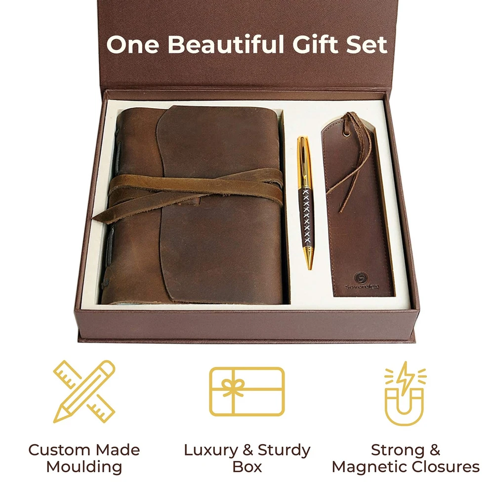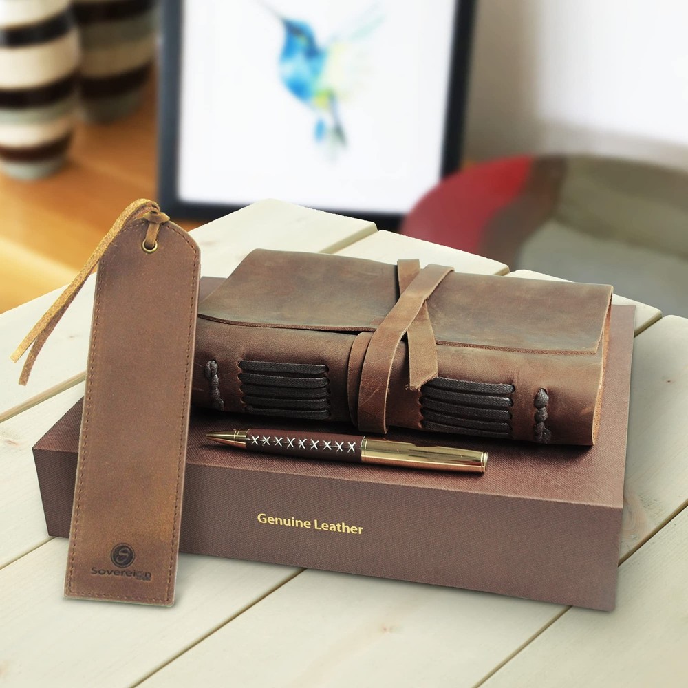 Leather Bound Journal for Men and Women, Handmade Gift Set with Genuine Leather Bookmark and Stylish Pen, Vintage and Classic, Notebook, Sketchbook, Planner, Journal and Diary (300 Pages) (8x6") ✓ Free 60 Day Returns ✓ Free Express Shipping Description: Features: UNIQUE GIFT SET: Handmade leather journal and matching bookmark with designer pen and hidden pen holder. Presented in a finely crafted presentation box. A timeless gift for someone special who loves to write. PREMIUM LEATHER: Crafted with delicate yet super tough buffalo leather, including a long strap that secures the notebook firmly. Our leather is thicker than competitors and offers lifetime durability with lasting softness. RUSTIC DESIGN: Achieves a unique and distressed look when scratched and features decorative stitching for added charm. Coated with special natural oils that make handling a joy. Plus, it has a wonderful authentic leather smell that inspires you to write daily. QUALITY CREAM PAPER: 300 premium unlined multipurpose sheets for notes, daily plans, sketches, inspiring ideas, memories and more. Zero bleed through with fountain pens. Not refillable. PERFECT SIZE: Designed with a choice of two sizes - 7x5" or 8x6" to suit a wide range of writing styles. We also offer many other sizes and styles of journals, including refillable journals. There's something for everyone! Product Details: Brand: Sovereign-Gear Color: Antique Brown Theme: Plain Sheet Size: A5 Pages: 300 Cover Material: Leather Style: rustic Ruling Type: Plain Special Feature: Bookmark, Pen Holder Number of Items: 1 Manufacturer: Sovereign-Gear Brand: Sovereign-Gear Item Weight: 2.21 pounds Product Dimensions: 11.22 x 9.45 x 2.17 inches Item model number: SG-8x6-Gift-Set Is Discontinued By Manufacturer: No Color: Antique Brown Cover Material: Leather Material Type: leather Number of Items: 1 Size: 8" x 6" Gift Set Ruling: Plain Sheet Size: A5 Manufacturer Part Number: SG-8x6-Gift-Set Date First Available: June 19, 2018