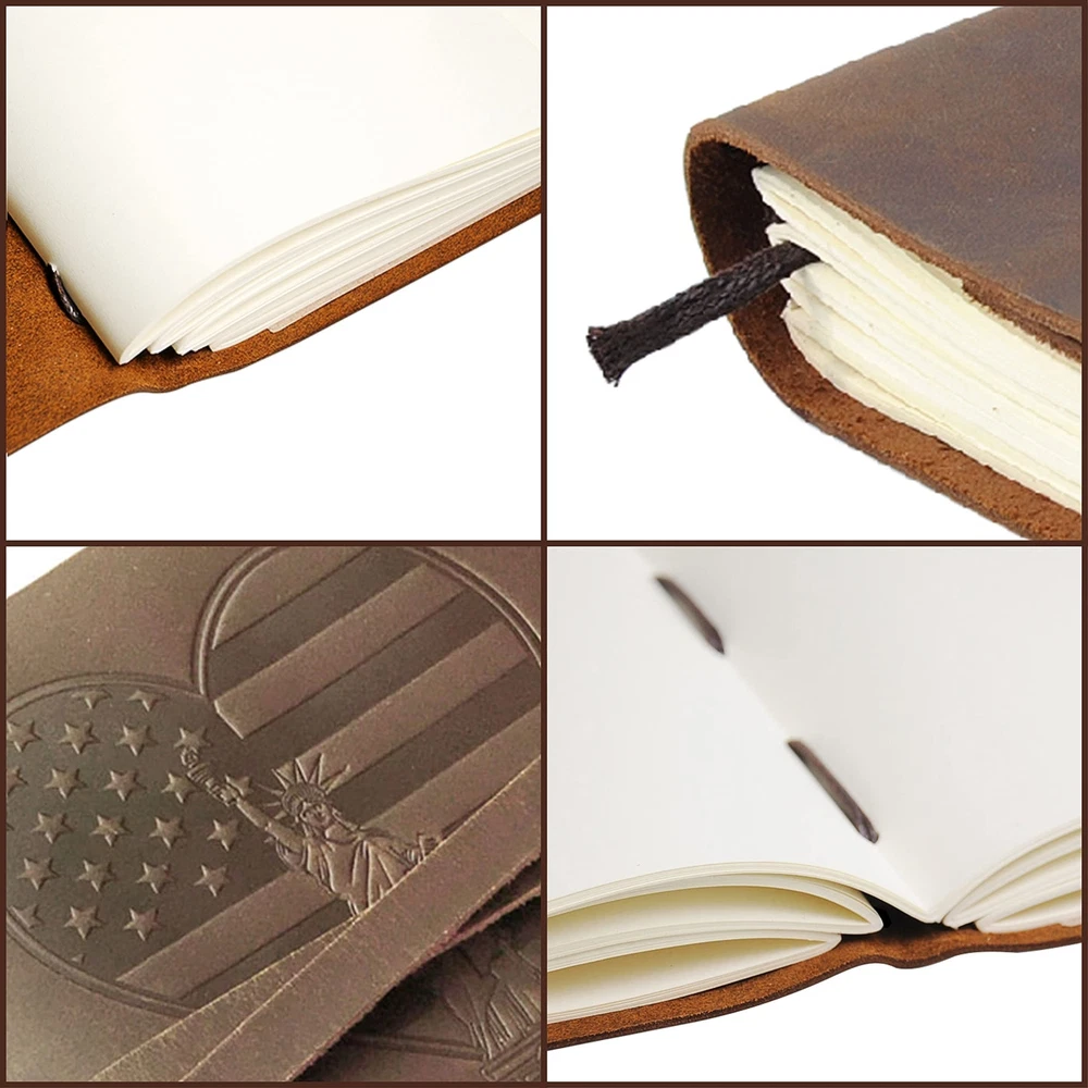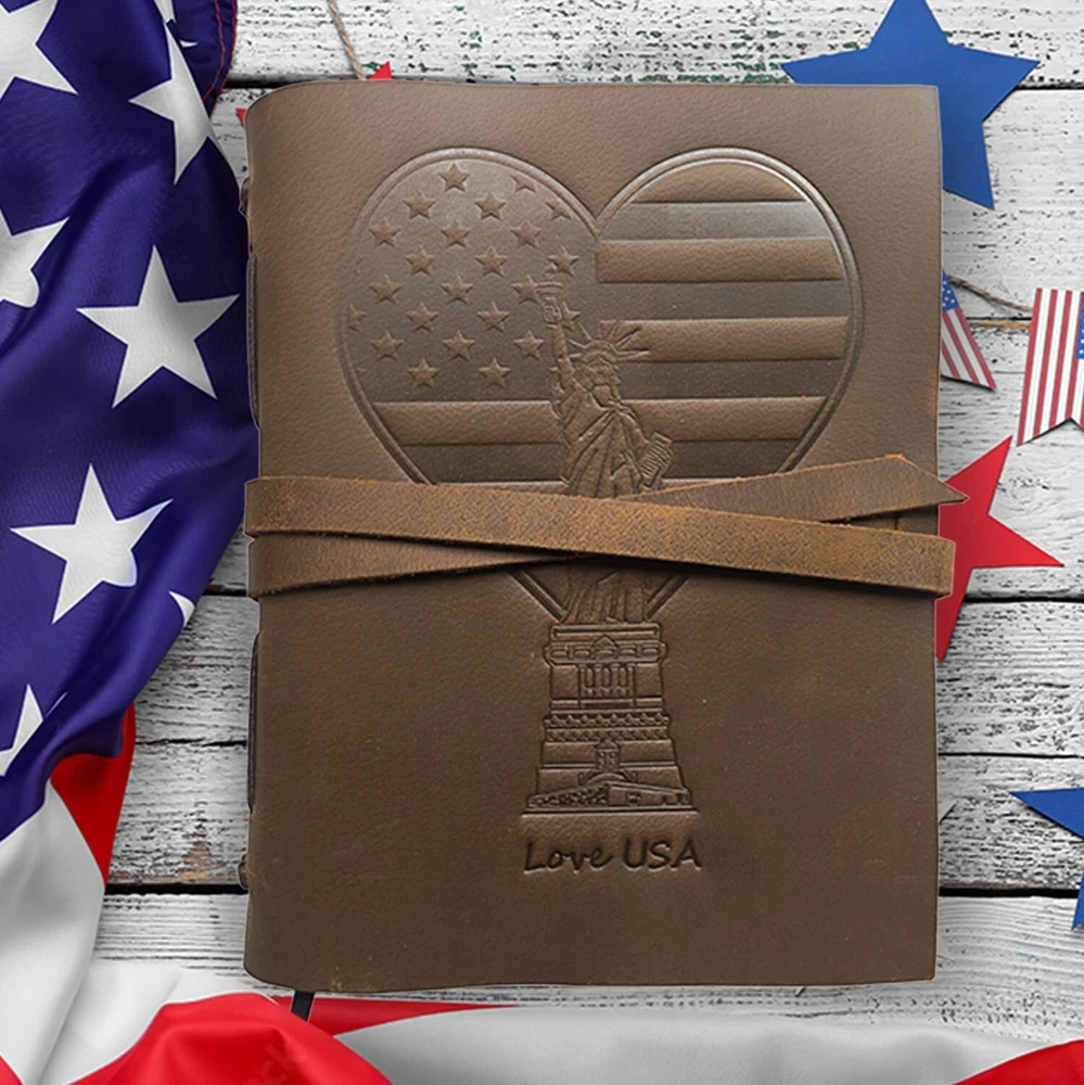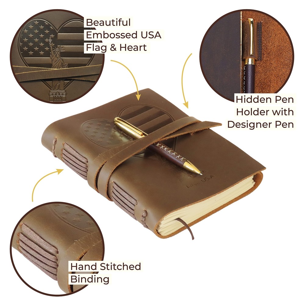 Leather Bound Journal for Men and Women, Handmade Patriotic Gift Set with Love USA Heart Flag Embossed Journal and Stylish Pen, Vintage Notebook, Sketchbook, Planner and Diary (300 Pages) (8x6") Product Details Size: 8" x 6" Style: USA Heart Flag Brand: Sovereign-Gear MPN: SG-US_Flag-Journal-8x6 EAN: 5060505401455 UPC: Does not apply Brand: Sovereign-Gear Color: Brown Theme: Book Sheet Size: A5 Pages: 300 Pages Cover Material: Leather Style: USA Heart Flag Ruling Type: Plain Special Feature: Pen Holder Number of Items: 1 Manufacturer: Sovereign-Gear Brand: Sovereign-Gear Item Weight: 1.5 pounds Product Dimensions: 6.69 x 1.97 x 8.46 inches Color: Brown Cover Material: Leather Material Type: Leather Number of Items: 1 Size: 8" x 6" Ruling: Plain Sheet Size: A5 Manufacturer Part Number: SG-US_Flag-Journal-8x6 Date First Available: June 20, 2022 UNIQUE GIFT SET: Handmade leather journal with beautiful USA Heart flag embossed front soft cover with matching bookmark, designer pen and hidden pen holder. Presented in an eco-friendly recycled box. A timeless gift for that patriotic someone who loves to write. PREMIUM LEATHER: Crafted with delicate yet super tough buffalo leather, including a long strap that secures the journal firmly. Our genuine leather is thicker than competitors and offers lifetime durability with lasting softness. RUSTIC DESIGN: Achieves a unique and distressed look when scratched and features decorative stitching for added charm. Coated with special natural oils that make handling a joy. Plus, it has a wonderful authentic leather smell that inspires you to write daily. QUALITY CREAM PAPER: 300 premium unlined multipurpose sheets for notes, daily plans, sketches, inspiring ideas, memories and more. Zero bleed through with fountain pens. Not refillable. PERFECT SIZE: 8x6" made to suit a wide range of writing styles. We also offer many other sizes and styles of journals, including refillable journals. There's something for everyone!