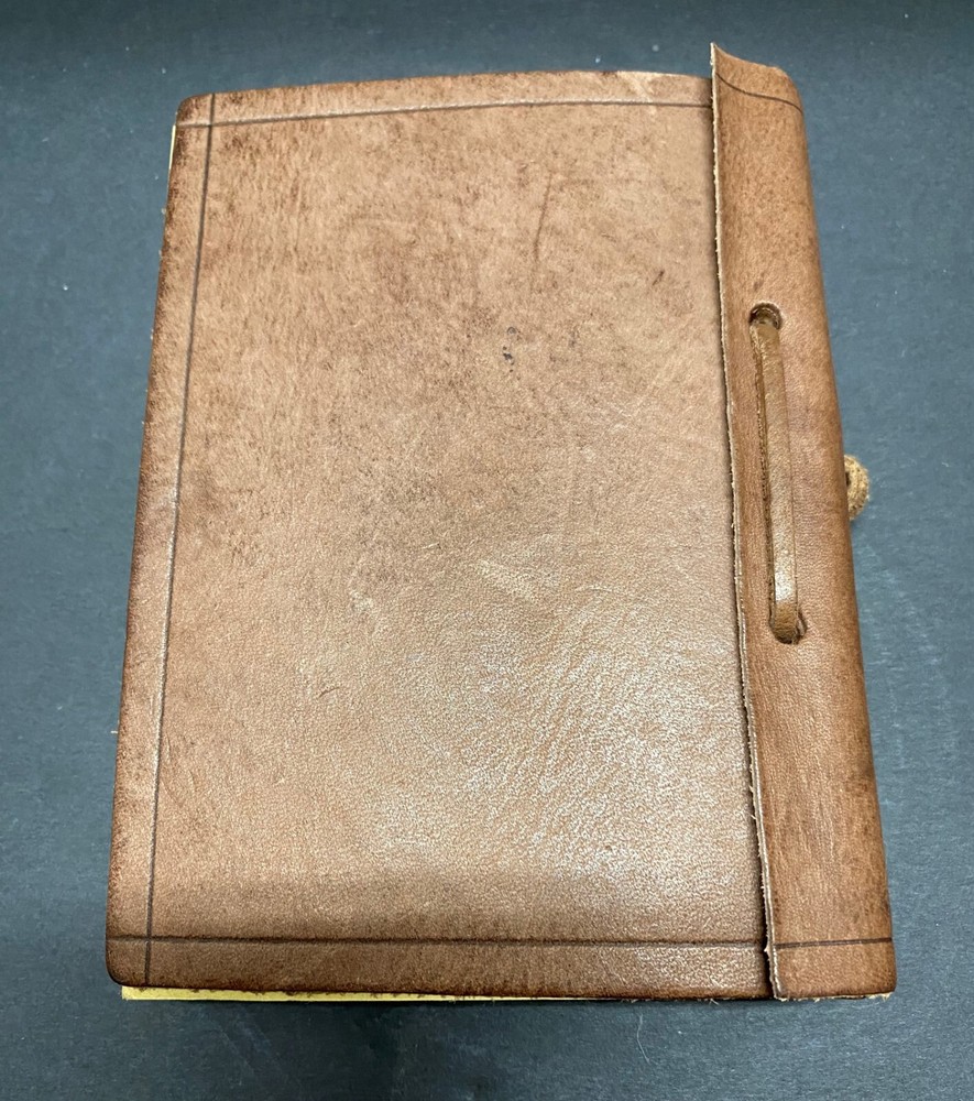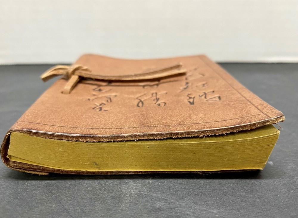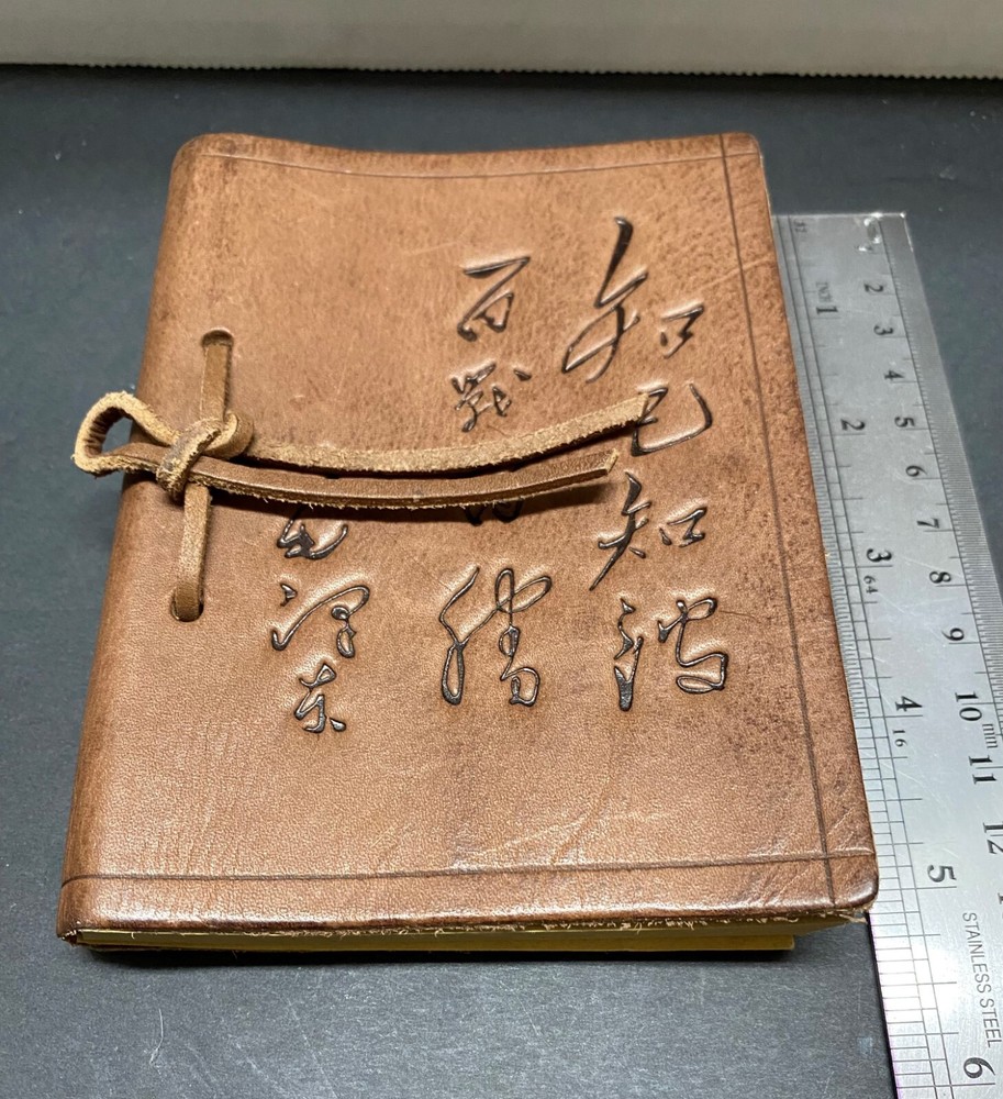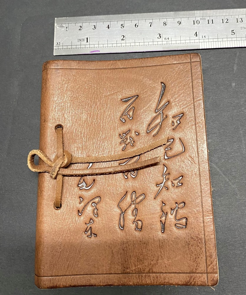 Unique Find Small Leather Journal Believed to be of Chinese Origin. In Unused Condition with unlined paper and dragon stamp in top right-hand corner of each page. Chinese Characters on front of the leather journal translated to read: know yourself and the enemy This is in great, like new condition. See photos for dimensions.