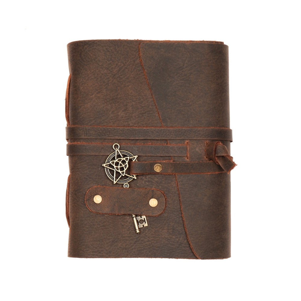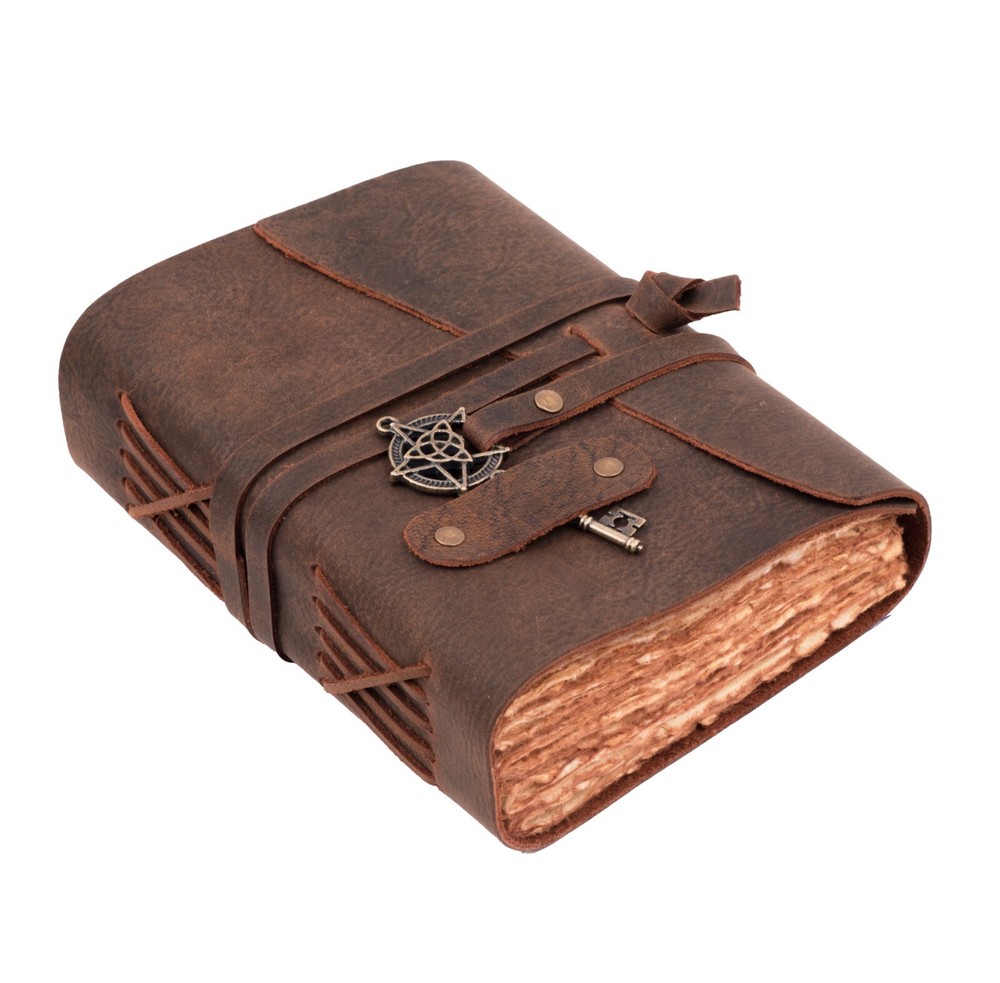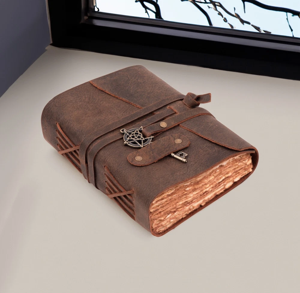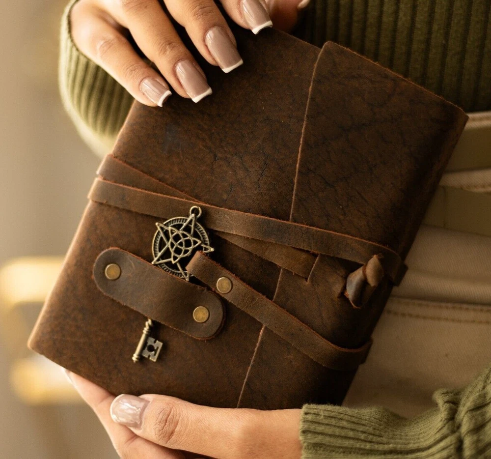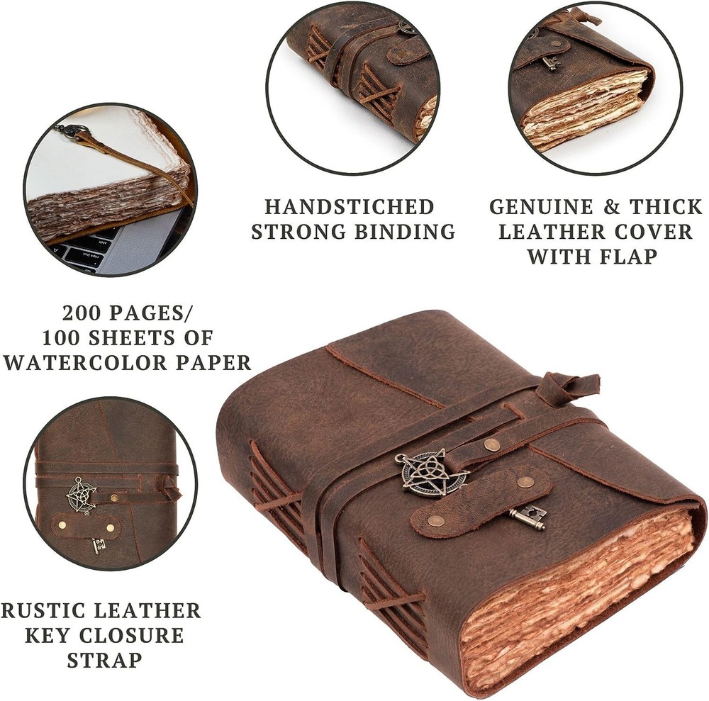 This vintage-style leather journal is absolutely stunning! The thick, naturally tanned buffalo leather feels luxurious and ages beautifully, while the pentagram key adds a unique, rustic charm. The 7x5" size is perfect for travel—fits easily in bags yet offers plenty of writing space. The 200 watercolor pages with deckle edges give it an elegant, old-world feel, and the 180° lay-flat design makes writing effortless. The key doubles as a bookmark, which is a clever touch. Whether for journaling, sketching, or gifting, this notebook is a joy to use—durable, practical, and full of character!