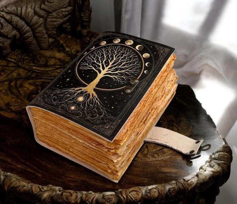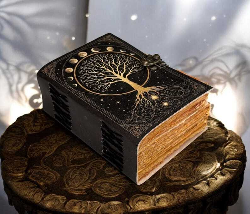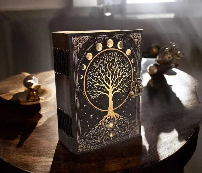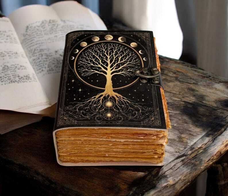 Large Grimoire leather journal, Print Tree of Life Journal, Blank spell book book of shadows Leather Celestial Gifts For Him Her • Print - Tree of life • Vintage lock closure • Genuine buffalo leather • Vintage deckle edge old paper • handmade rustic cotton paper • 100 Sheet (200 pages both side) • 200 Sheet (400 pages both side) ▶ Size - 7x5 Inches, 8x6 Inches, 10x7 Inches ● Leather journal witchcraft book of shadows notebook is made with Antique Paper which looks like it was pulled from history. You will fall in love with the antique handmade cotton paper which is unique to our Vintage Journal Notebook. ● The vintage clasp lock will keep all your valuable writing locked inside. Study hand stitched binding to make sure that no paper comes out loose from your spell notebook. ● Sketch, Doodle, Write on your Leather Blank Spell Journal with a Calligraphy Pen Fountain Pen, Brush Pen, Ball Pen, Acrylic Colors, Watercolor and many more. We guarantee no bleed through. Personal Diary with Lock, Astrology Journal, Wiccan Spell Book, Mystic Writing Book, Grimoire Notebook, Handmade Diary, Leather Bound Notebook, Gift for Writers, man and woman.