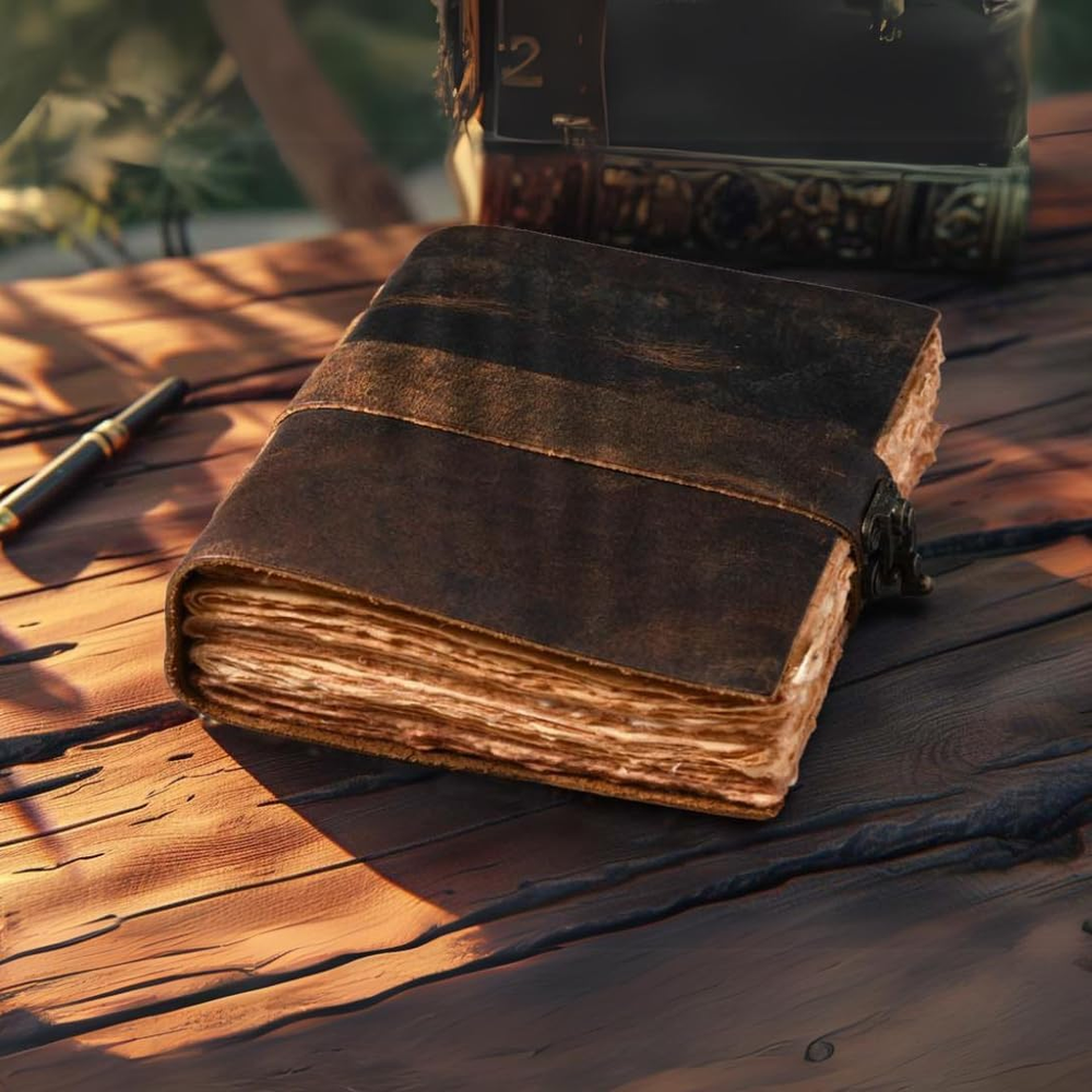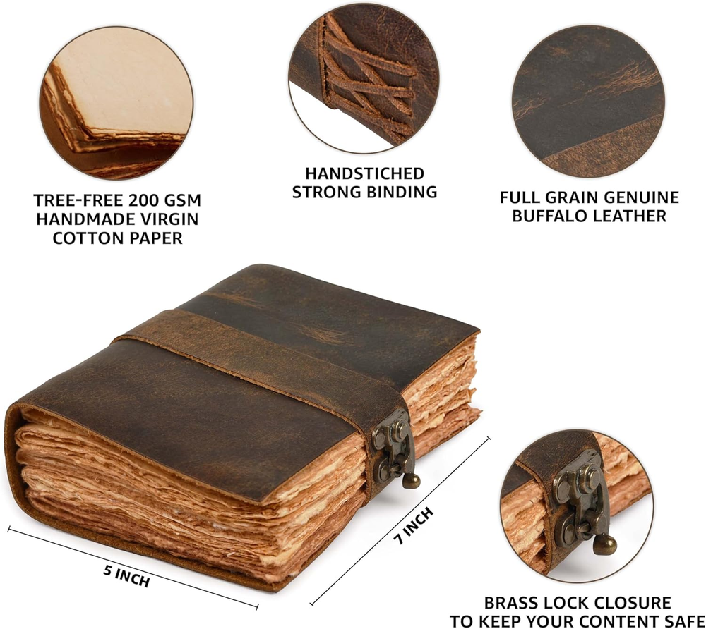Menu Other Items Feedbacks About Us Contact Us Add To Favorites Leather Bound Vintage Journal for Women & Men - Book of Shadows - Lock Closure - 200 Pages of Antique Deckle Edges Handmade Paper - Rustic Brown Color - 7 X 5 Inches VINTAGE LEATHER JOURNAL: A Perfect Journal for Women and Men by Leather Village. This Vintage Journal is Made from Genuine Buffalo Leather which is naturally tanned with oils and is chrome free. As these Daily Journals are made with genuine Cruelty free leather so each vary in look and shade producing a unique item. JOURNAL NOTEBOOKS WITH STURDY BINDING: Belt Wrap around closure with Antique Bras lock to keep the papers of the journal safe when not being used. A sturdy hand stitched binding to make sure that no paper comes out loose. WATERCOLOR PAPER: This leather Sketchbook comes with handmade deckle edges paper which is made from recycled cotton waste these old Paper are No Bleed Scrapbook Paper. The Mixed Media Sketchbook is Suitable for Writing, Watercolor, Acrylic Colors, Pastel Color and all Dry & Wet Mediums. Use it like Sketch Pad, Watercolor Sketchbook etc. PERFECT GIFT: This vintage-inspired journal serves as an exquisite and timeless gift suitable for a diverse range of recipients, including women, men, teen girls, boys, and cherished grandparents. A lovely treat for your loved ones for an anniversary, birthday or graduation present, or for someone starting a new adventure LEATHER VILLAGE PROMISE: - Leather Village Leather Bound Journal comes with the Trust and promise of Purity of craftsmanship with each Writing Journal. Product Description LEATHER VILLAGE Premium Old Vintage Journal for Men & Women The Perfect Journal for Creatives, Travelers, and Thoughtful Souls An ideal gift for artist writers, travelers, graduates, friends, or anyone who has a love for writing and note-taking. A Journal that is worthy of your thoughts and ideas, that will make you feel special every time someone opens it and that will last a lifetime. Ideal for Daily Writing and Drawing Needs Unique Bound Journal The Unique Bound Journal offers premium leather, a secure lock, and a stylish design for writing and safekeeping your thoughts. 150 GSM Thick Vintage Paper 150 GSM Thick Vintage Paper provides a durable, high-quality feel, ideal for journaling, sketching, and preserving memories with a classic texture. Secure and Sturdy Binding Secure and sturdy binding keeps your journal durable, ensuring pages stay intact for long-lasting use. Old Handmade Journal Our old handmade journals are designed to reflect your style, perfect for capturing memories, ideas, and thoughts in a one-of-a-kind way. The video showcases the product in use. The video guides you through product setup. The video compares multiple products. The video shows the product being unpacked. Item Specification Item model number 8906166960016 Style Vintage Leather Journal Product Dimensions 6 x 8 x 1.5 inches Number of Items 1 Color Brown Pages 200 Pages Cover Material Brown Sheet Size 7 x 5 inches Manufacturer Part Number 8906166960016 Item Weight 12.3 ounces Theme Plain Ruling Plain Ruling Type Plain Special Feature Lock Size 7 inches X 5 inches SHIPPING FREE FAST SHIPPING FREE SHIPPING We are always working hard to ensure your package arrives as soon as possible. Please understand that some factors like weather, high postal traffic, and the performance of shipping companies are outside of our control. We offer free shipping to the lower 48 states. We do not accept P.O. Boxes. Please provide a physical address. If you have a problem or question regarding your transaction please contact us immediately. We will work with you to resolve any problem you may have. Thank you