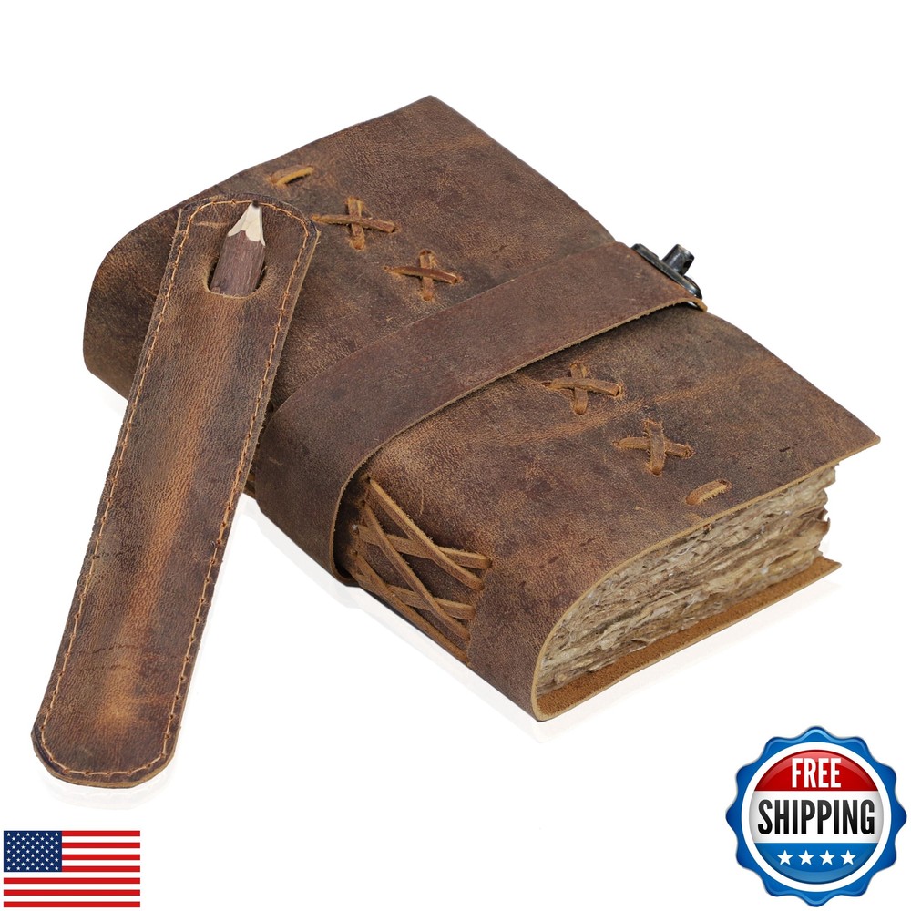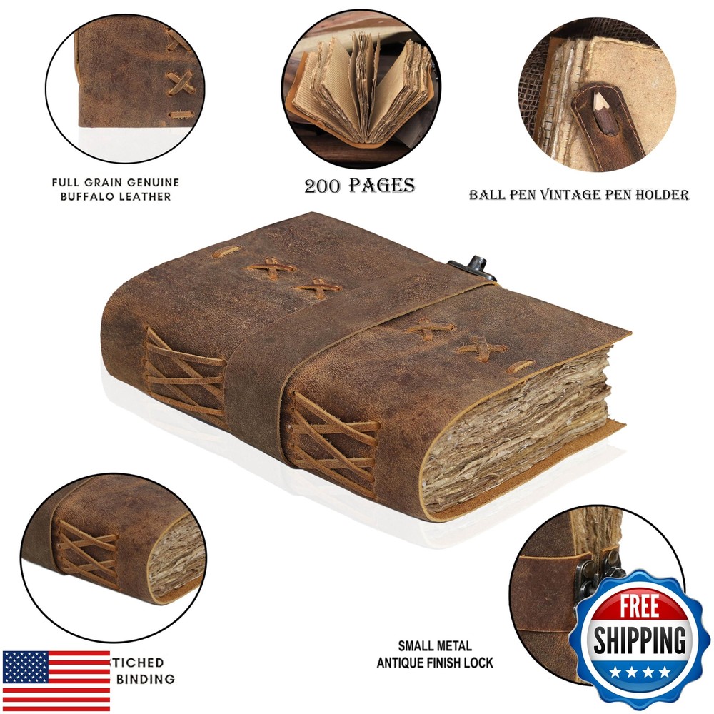 Leather Bound Vintage Journal for Women and Men - Book of Shadows - Lock Closure - 200 Pages of Antique Deckle Edges Handmade Paper - Rustic Brown Color Features VINTAGE LEATHER JOURNAL: A Perfect Journal for Women and Men by Vintage Couture. This Vintage Journal is Made from Genuine Buffalo Leather which is naturally tanned with oils and is chrome free. As these Daily Journals are made with genuine Cruelty free leather so each vary in look and shade producing a unique item. JOURNAL NOTEBOOKS WITH STURDY BINDING: Belt Wrap around closure with Antique Bras lock to keep the papers of the journal safe when not being used. A sturdy hand stitched binding to make sure that no paper comes out loose. WATERCOLOR PAPER: This leather Sketchbook comes with handmade deckle edges paper which is made from recycled cotton waste these old Paper are No Bleed Scrapbook Paper. The Mixed Media Sketchbook is Suitable for Writing, Watercolor, Acrylic Colors, Pastel Color and all Dry & Wet Mediums. Use it like Sketch Pad, Watercolor Sketchbook etc. PERFECT GIFT: This vintage-inspired journal serves as an exquisite and timeless gift suitable for a diverse range of recipients, including women, men, teen girls, boys, and cherished grandparents. A lovely treat for your loved ones for an anniversary, birthday or graduation present, or for someone starting a new adventure VINTAGE COUTURE PROMISE: - VC Leather Bound Journal comes with the Trust and promise of Purity of craftsmanship with each Writing Journal. Shipping Free & Fast Shipping: We offer free shipping to most of the USA with a normal delivery time of 3-7 days. However, due to the current situation, additional delivery time (up to 3 weeks) may be required for some items. Alternative Carriers: We may use alternative carriers (e.g., USPS, FedEx, UPS) to ensure your package arrives safely and on time. Due to the use of multiple carriers, we are unable to provide a tracking number automatically. Handling Time: Orders are processed and shipped within 1-2 business days of receiving cleared payment. Shipping Restrictions: Shipping to Alaska, Hawaii, Puerto Rico, Guam, and other US territories may incur shipping charges or delivery restrictions. Please contact us before ordering, or your order can be refunded/cancelled. State Restrictions: Certain items may not be shipped to California due to state regulations. Contact for Tracking Updates: If you require tracking updates or have any concerns about the delivery of your order, please feel free to contact us, and we will be happy to assist you. Return Policy 30-Day Hassle-Free Returns: If you are not completely satisfied with your purchase, you can return the item for free within 30 days of receiving it for a full refund or exchange. Easy Return Process: Contact us, and we will provide you with a prepaid return shipping label and detailed instructions. No Restocking Fee: There are no restocking fees for returns. However, the buyer is responsible for return shipping costs if the return is not due to a seller's error. Refund Processing: Refunds will be processed within 1 business day of receiving the returned item in its original condition. Payment We accept all major credit cards, PayPal, and Apple Pay for your convenience. Your payment information is secure and encrypted to ensure a safe and seamless transaction. Please complete your payment within 3 days of purchase to avoid any delays in shipping. Feedback Your feedback is extremely important to us. We strive to provide the best products and customer service possible. If you are satisfied with your purchase, please take a moment to leave us a positive review. If you have any concerns or issues with your order, please contact us before leaving negative feedback. We are committed to resolving any problems and ensuring your satisfaction. Contact Us If you have any questions or concerns, please feel free to reach out to our customer support team. You can contact us through the eBay messaging system. We are available Monday to Friday, 9:00 am to 5:00 pm EST, and we will do our best to respond to your inquiry within 24 hours. Thank you for supporting our small family business!