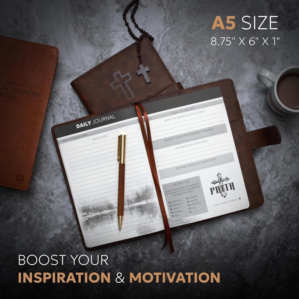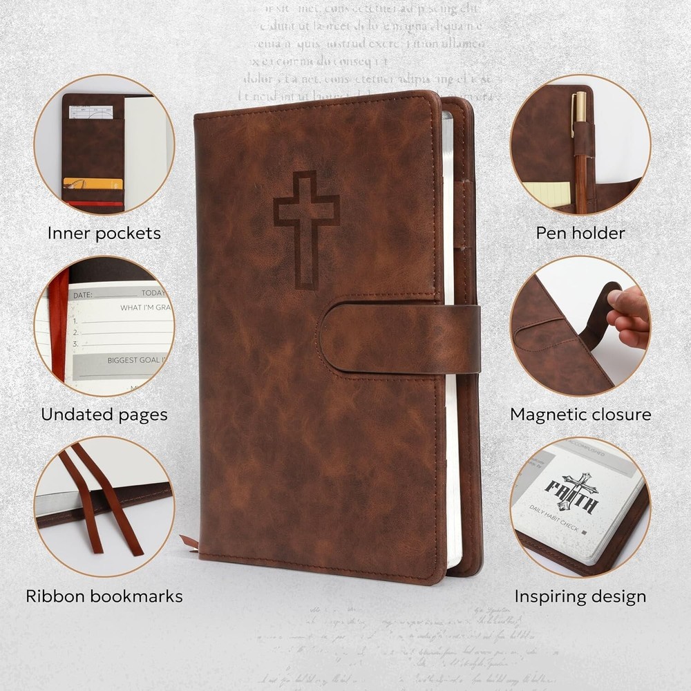 Bible Prayer Journal For Men with Faux Leather, Bible Study Scripture Notebook & Christian Planner, Christian Gifts for Men, Devotional Journal and Church Notes IGNITE YOUR SPIRITUAL JOURNEY - Feeling stuck in your spiritual routine? Our Christian Motivational & Inspiration Journal revitalizes your faith with meaningful insights and wisdom. This isn't just a journal—it's your dialogue with God, guiding you to a deeper spiritual life and greater gratitude. BUILT FOR EVERYDAY FAITH - Whether it's sunny or rainy, our resistant vegan leather journal stands up to the test. Reflect the strength of your faith with a journal that is both resilient and portable, becoming a daily companion in your spiritual journey. A TREASURED GIFT - Picture the delight on their face when they receive this beautifully packaged journal! Presented in an elegant black box with a ribbon, it's more than a gift—it's a heartfelt invitation to connect with God. Ideal for Christmas, birthdays, or any occasion to show you care. YOUR SAFE HAVEN - Your spiritual reflections deserve the utmost privacy. Our journal features a secure magnetic closure to keep your thoughts and prayers confidential. Additionally, inner pockets help you organize and protect cherished keepsakes and mementos. WRITING MADE EASY - Perfectly sized at 8.5" L x 5.5" W, our journal offers a comfortable writing experience. With 214 pages filled with inspirational prompts and Biblical verses, it provides ample space for capturing your spiritual journey and reflections. Search Term: Bile journal,prayer journal, bible study notebook, christan journal planner,christian gifts, bible journaling kit, bible journaling supplies,church notebook, devotional journal,pastor gifts for men, christian journal