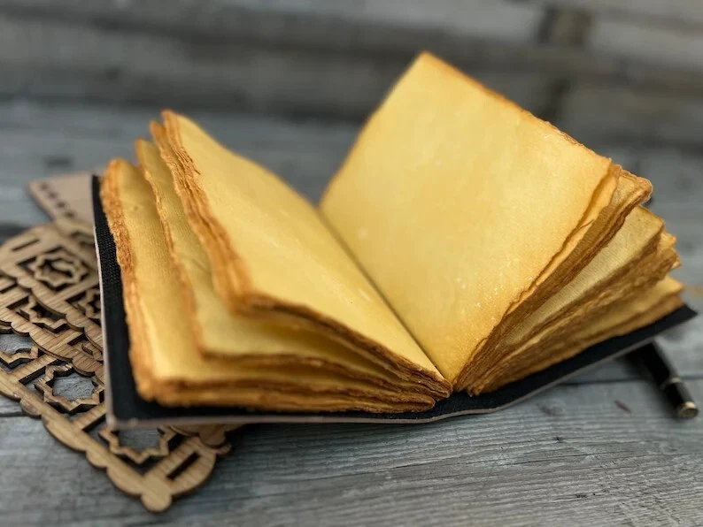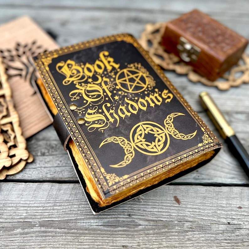 Leather Journal Notebook book of Shadows Antique paper- Pentacle Leather Journal Book of Shadows Antique paper- 2 x Brass C A4 SIZE Embossed Leather Journal w/ Clasp - BOOK of SHADOWS - ° Embossed Leather ° Metal Swing Closure ° Antiqued/Aged Appearance ° Handmade Linen Parchment ° Blue Lunar Stone This l eather journal has a dark brown leather cover embossed with a Book Of Shadows design featuring a pentagram and a blue lunar stone. Inside features 300 pages of handmade linen parchment paper. Size - 6" x 8" Ships USP with Tracking Confirmation. Always Discreet Packaging