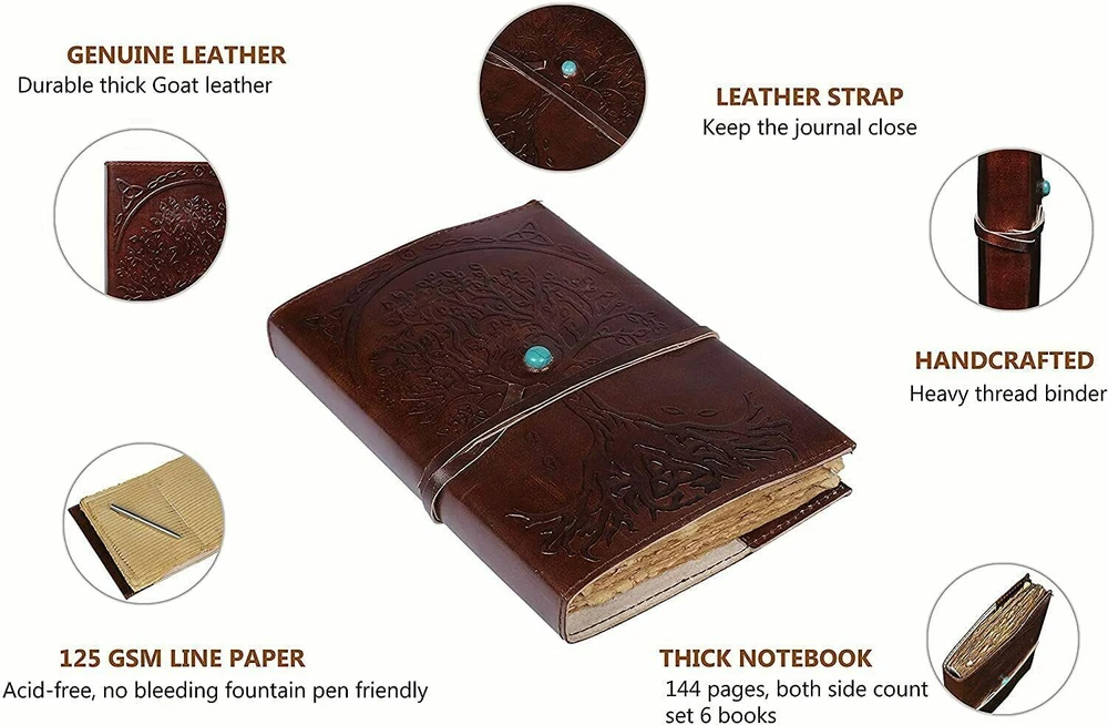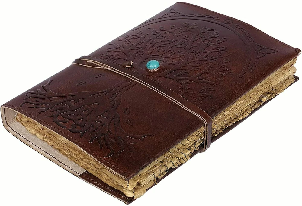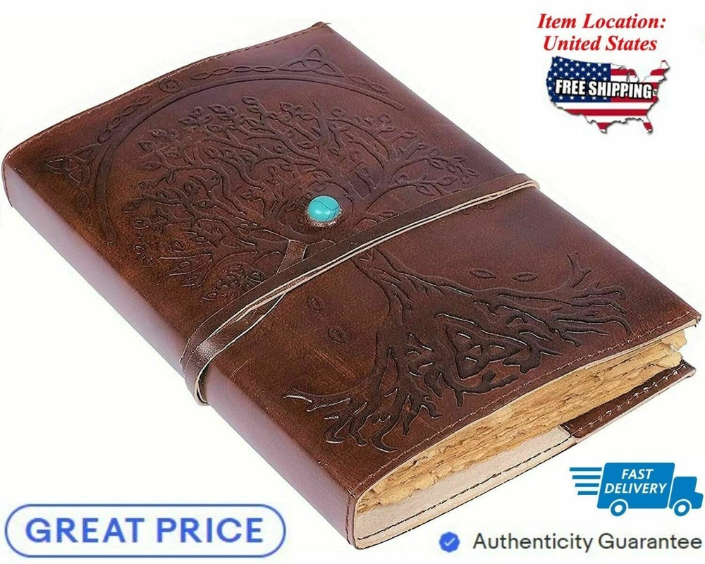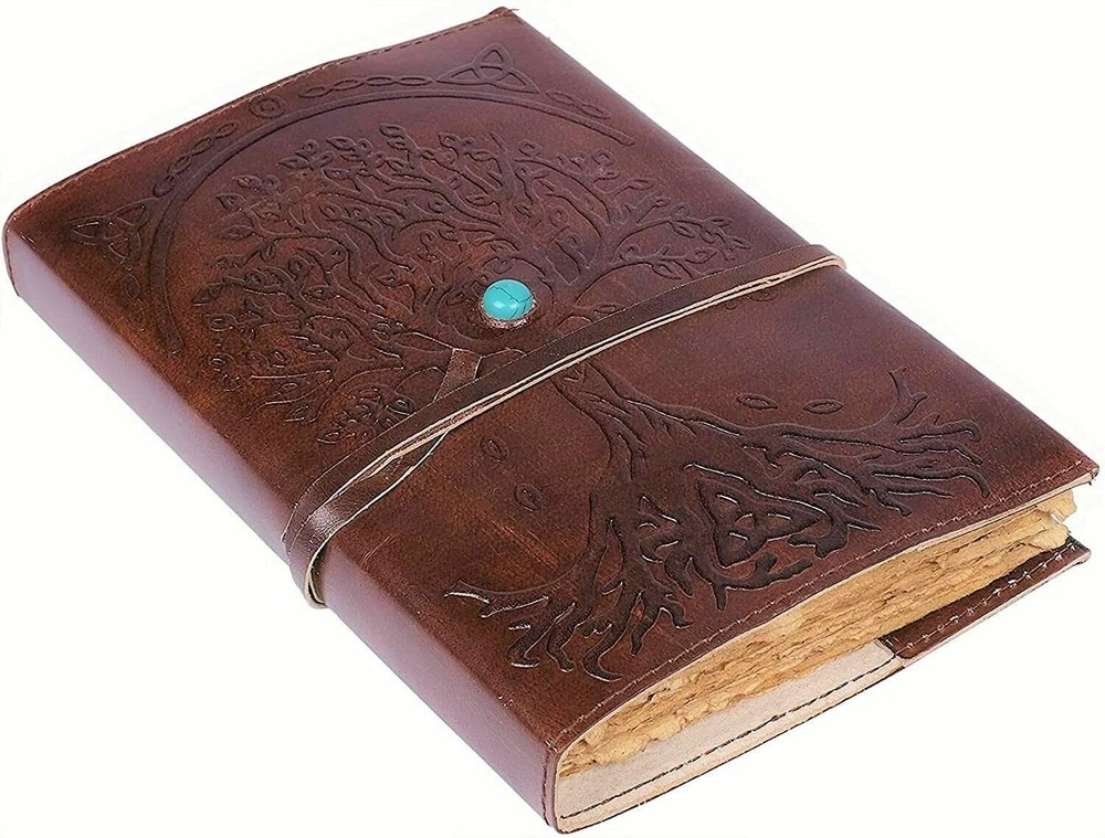✔ BEAUTIFULLY CRAFTED & UNIQUE: Soft & Supple Dark Brown Genuine Water Buffalo Leather. A lovely vintage style and feel with a gorgeous, real leather scent. Being hand-made, no two are quite the same - a special keepsake for your thoughts, plans & ideas. ✔ PERFECT SIZE 8 inch by 6 inch MANY USES: 1.5 inch thickness, easy for handwriting, drawing or sketching and compact for carrying in your bag. Ideal for an alternative Artists Sketchbooks, Girls Diaries, Travelling, Teen Journals, Poetry Work, Food Planner, Scrapbook and Christian Bible Journaling. ✔ Beautiful hand made large tree of life embossed on it which related to fortune this one is very beautiful handmade leather journal. ✔ TRY IT TODAY with the added security of our 30 DAY MONEY BACK GUARANTEE. Makes an Awesome Birthday Gift! Buy 1 for you and 1 for a friend! Buying 2, 3 or 4? JOURNAL MADE WITH DECKLE PAPER AND REFFILABLE JOURNAL AND WE CAN REFILL IT. Soft & Supple Dark Brown Genuine Leather. A lovely vintage style and feel with a gorgeous, real leather scent. Being hand-made, no two are quite the same - a special keepsake for your thoughts, plans & ideas. Beautiful cute blue stone in the middle and looking a little extra doesn't harm. The irregular, untrimmed edge of handmade paper, often used for ornamental effect in fine books and stationery. Refillable Vintage Deckle Edge Paper Tree of Life. Hand-crafted with recycled cotton which is acid free & tree free.